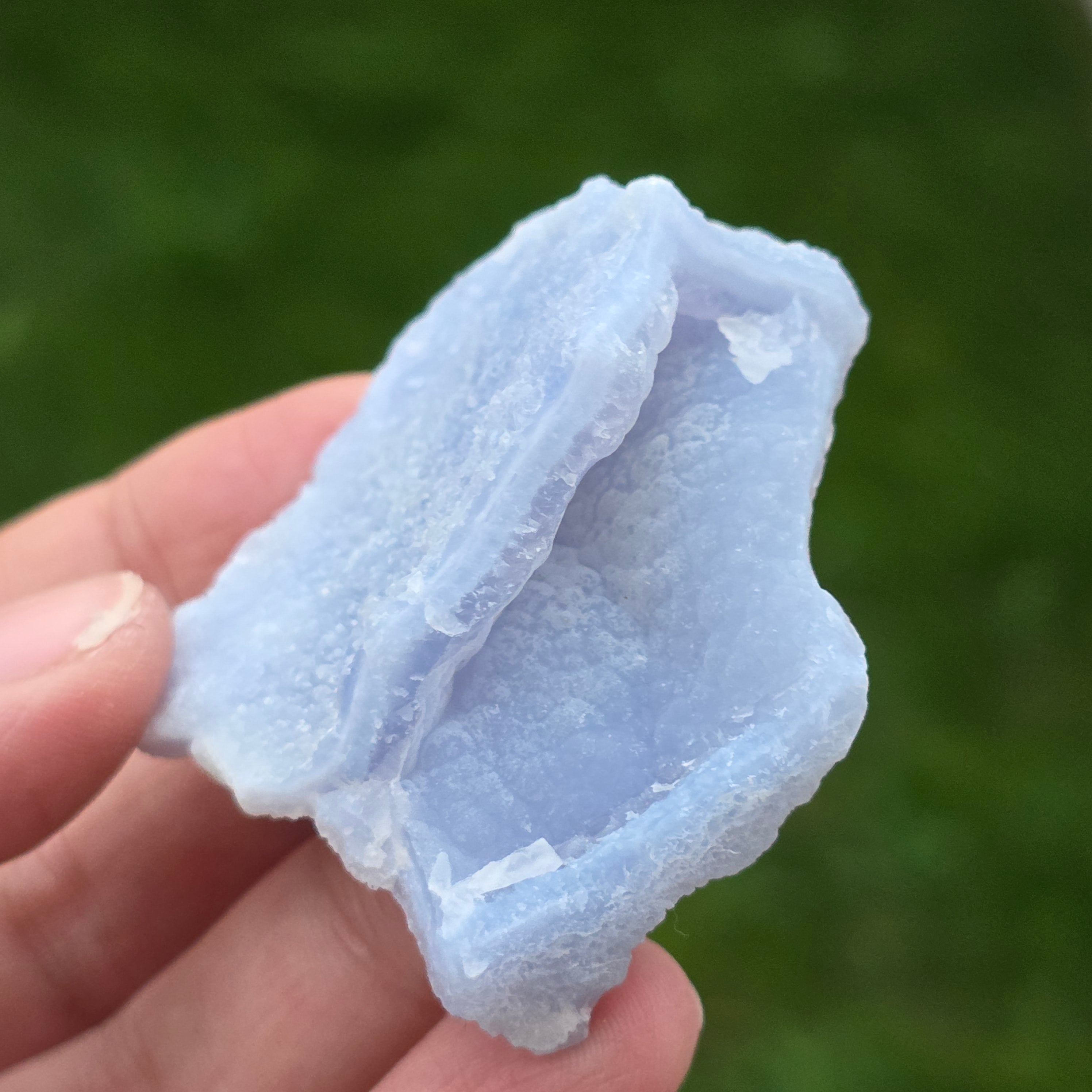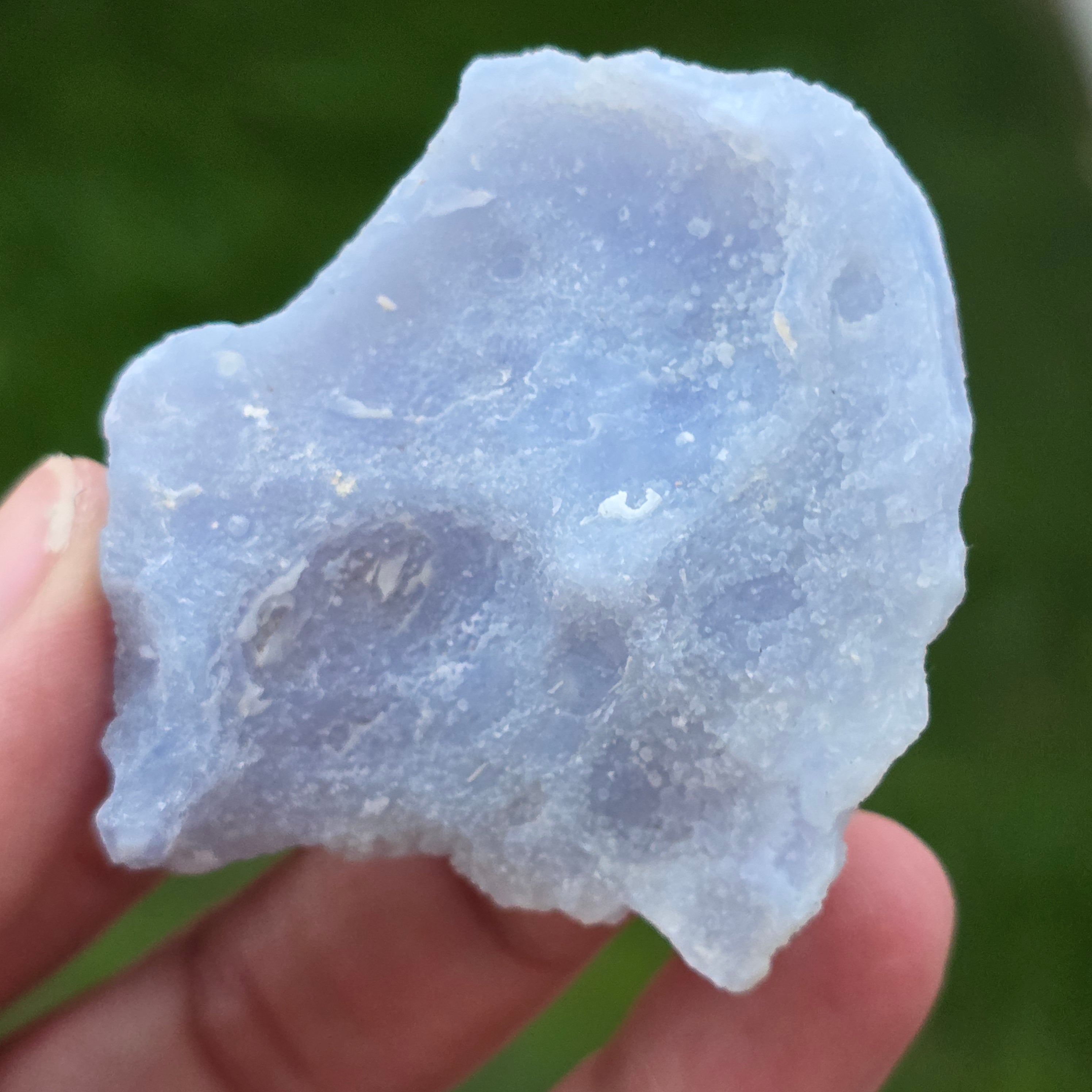 Niebieska chalcedonia jest zwykle kojarzona z komunikacją, wyrażaniem siebie i prawdy, może pomagać w stymulowaniu autentycznej komunikacji.