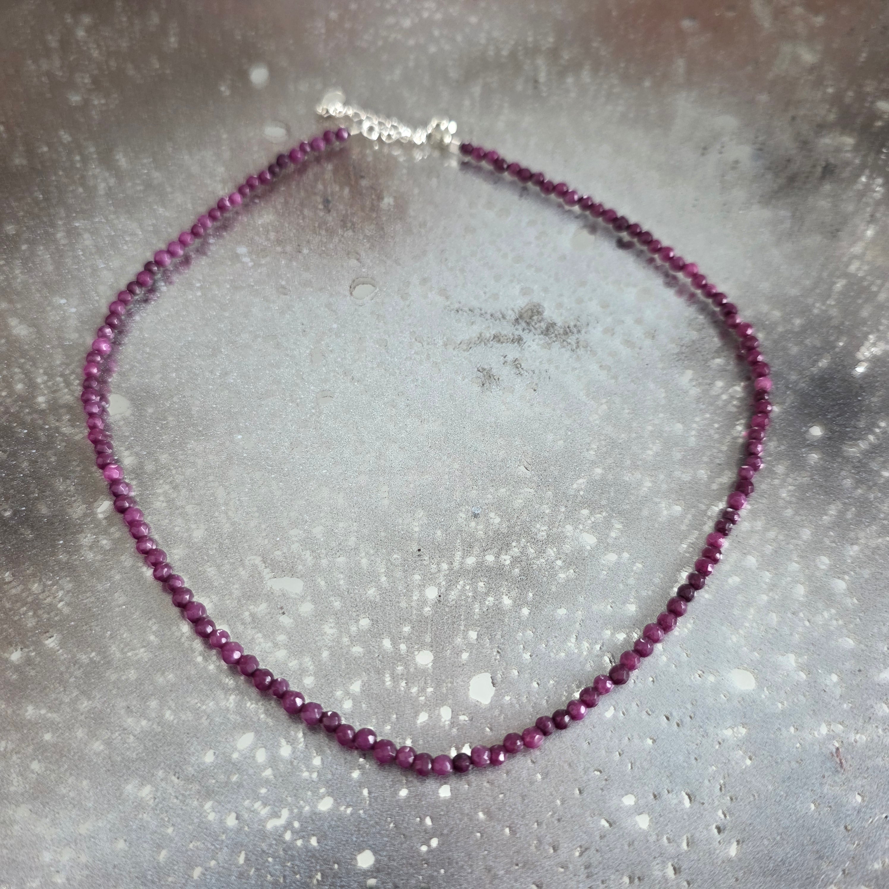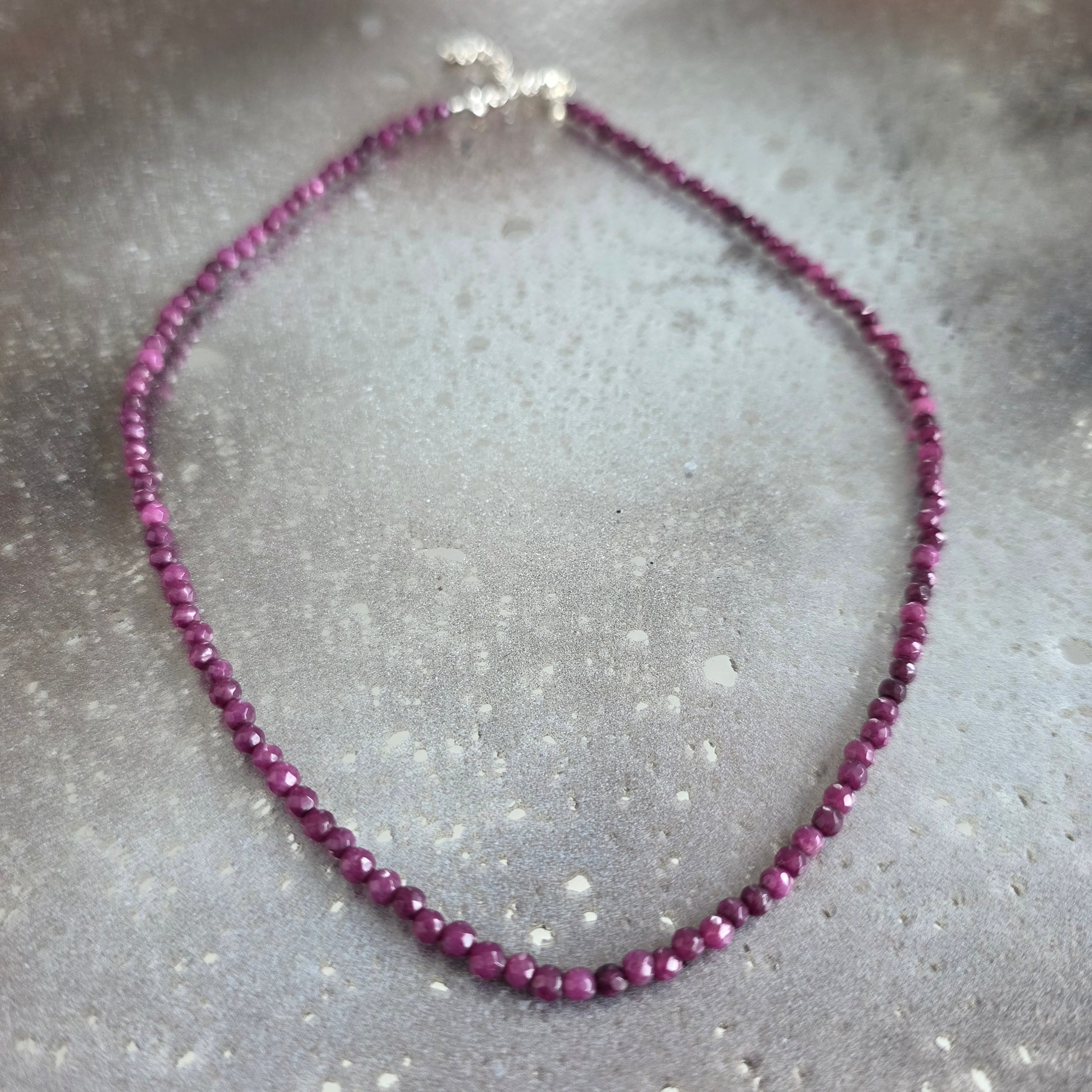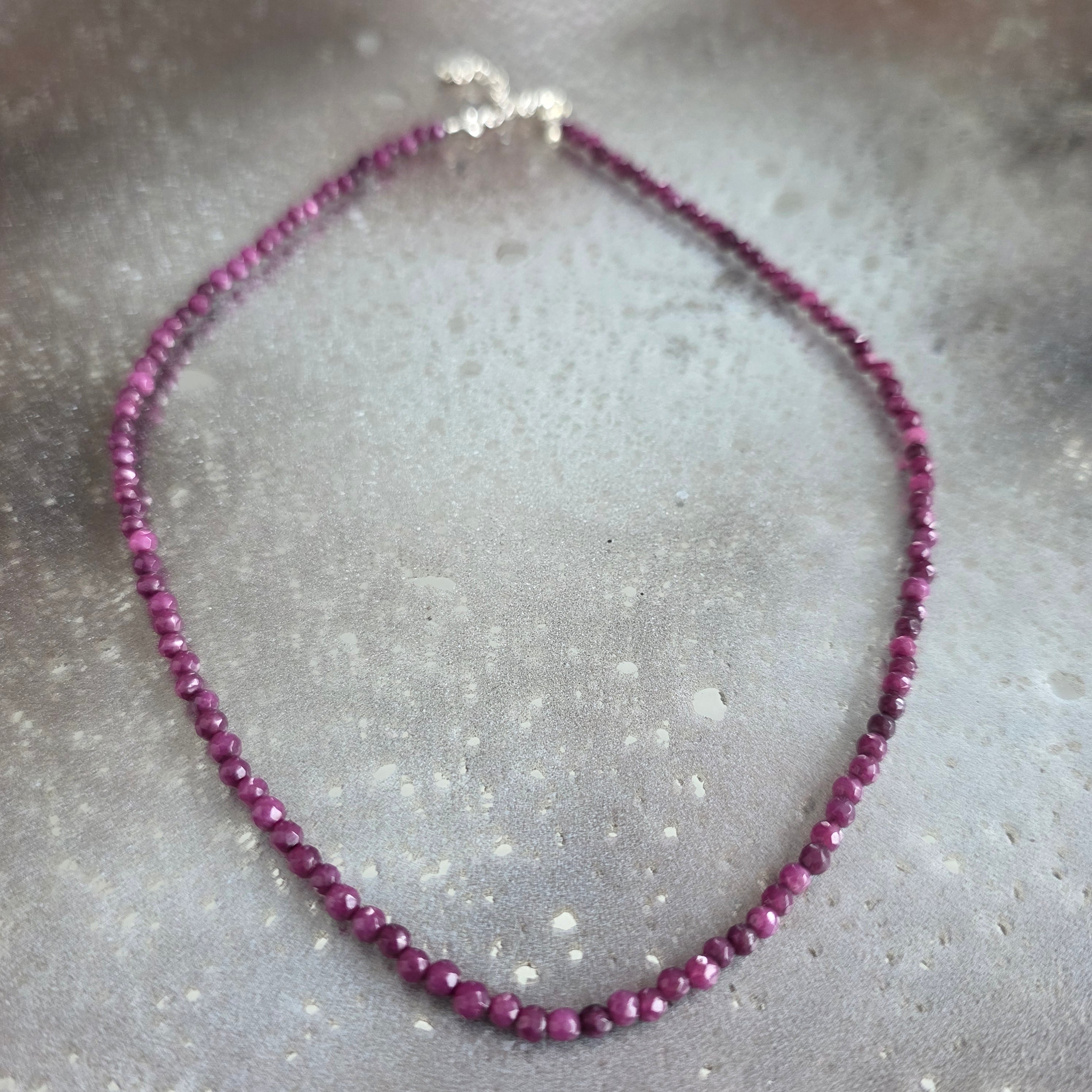 Linka składa się w całości z fasetowanych kulek z agat burgundowy 3 mm, ciemnych koralików z subtelnymi refleksami między stłumionym rubinem, dojrzałą wiśnią a cieniami ułożonego czerwonego wina. Delikatne fasety łapią światło dyskretnie, niczym ledwo uchwytny westchnienie, a kolor, głęboki i pełny, ma powagę, która zaprasza do spokoju i obecności.