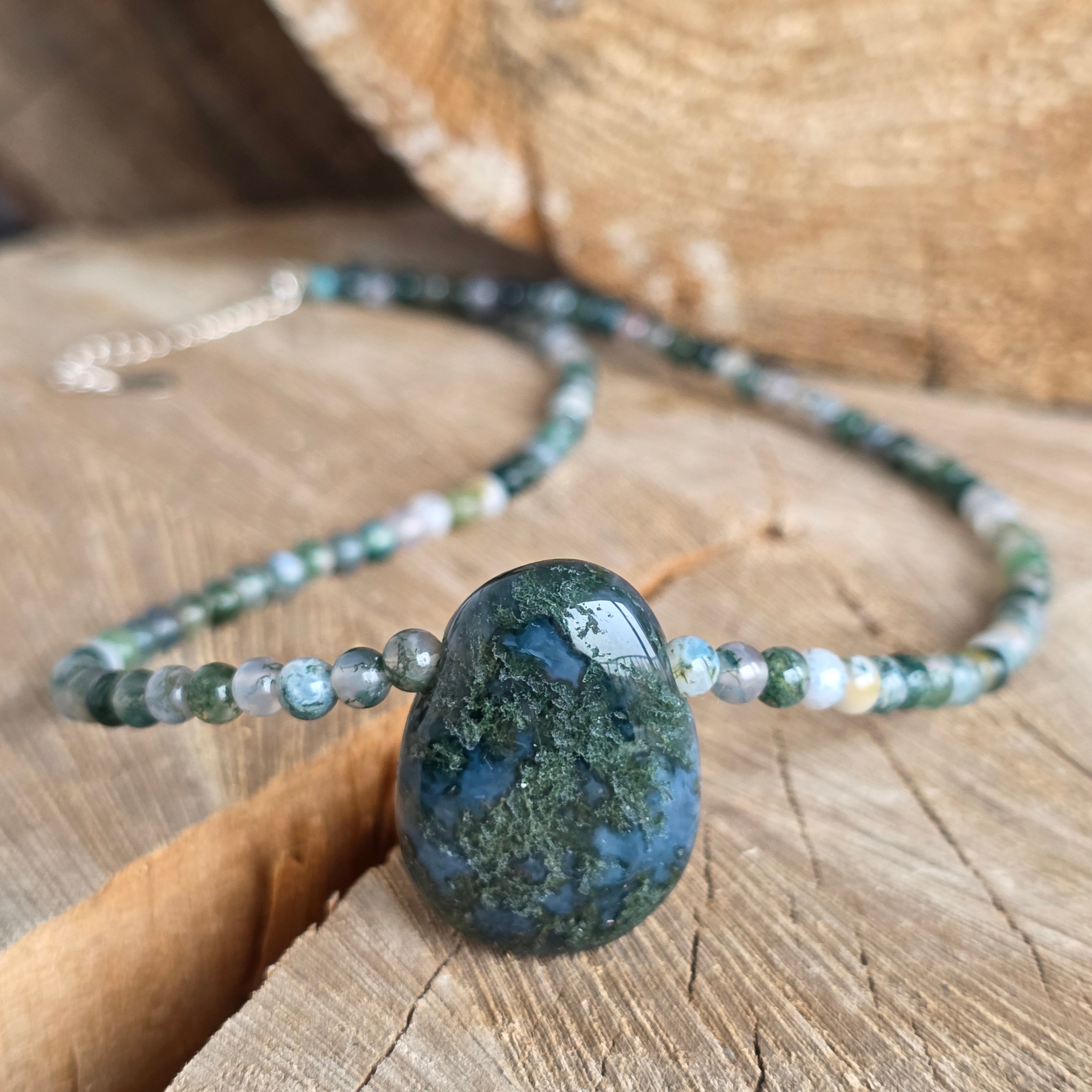 W centrum kompozycji wisiorek o około 3 cm z tego samego mięśnia agatu dodaje symbolicznej wagi i naturalnej elegancji. Jest to kropla skondensowanego lasu-fragment cichego świata, ale pełen siły.