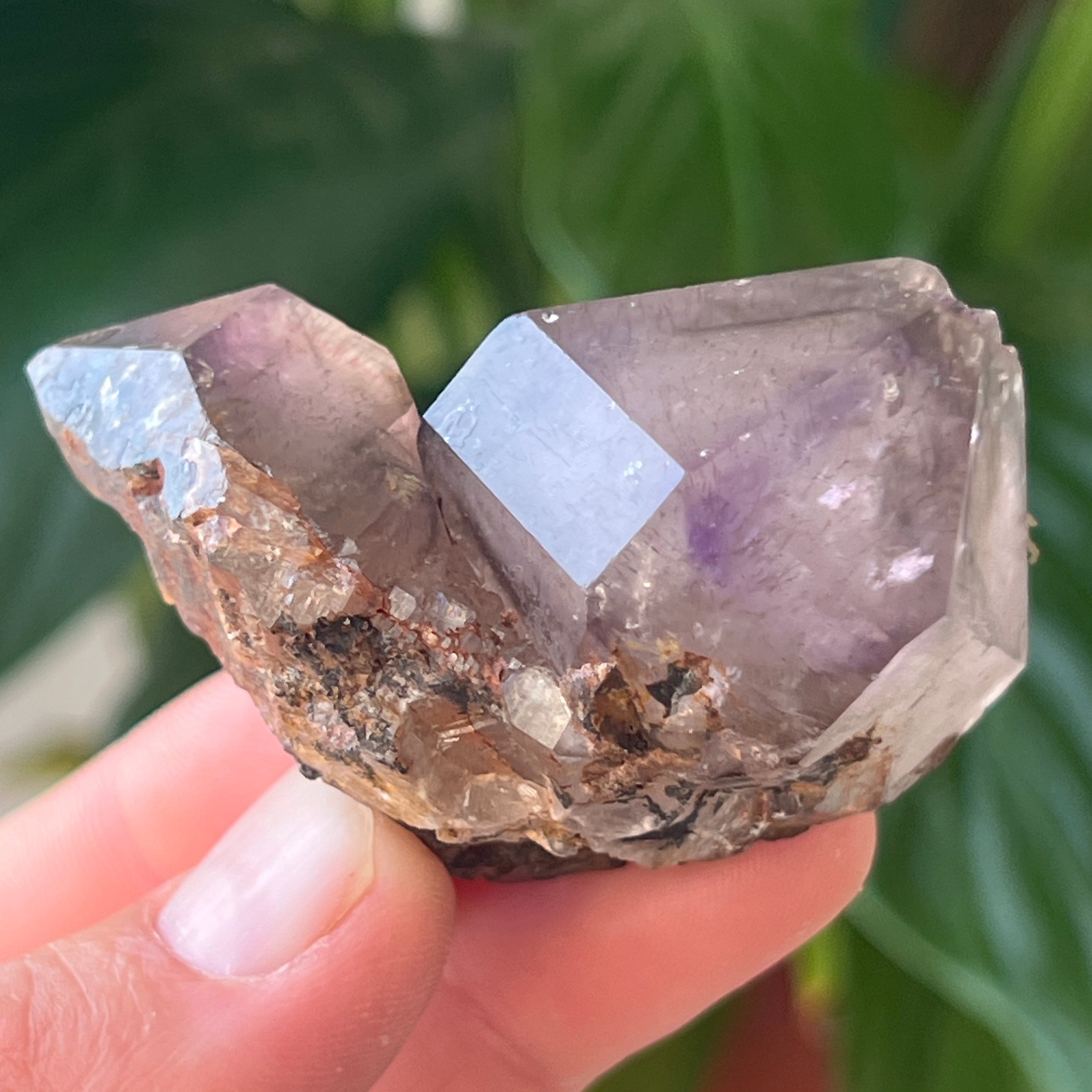 Cristalizând în sistem trigonal, acest specimen de SiO₂ (dioxid de siliciu) se remarcă prin transparența sa excelentă și formele sale naturale, hexagonale. Unele piese includ „fantome” – contururi interne care reflectă etape anterioare de creștere – sau prezintă bule mobile de lichid hidrotermal, hematit ori goethit, toate capturate în interiorul cristalului în urmă cu milioane de ani.