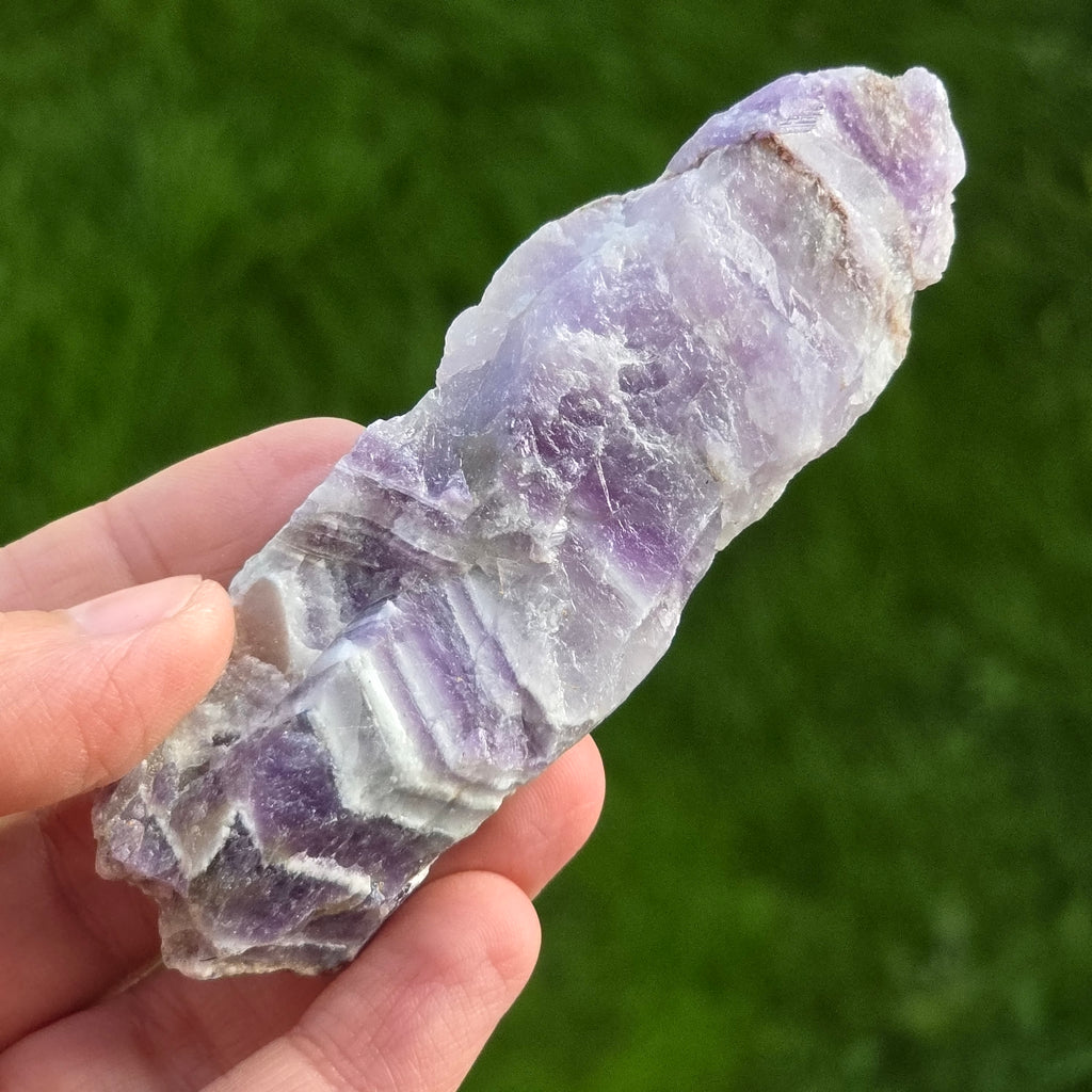 Ametyst Chevron jest znany ze swoich powiązań z czakrami korony i trzecim okiem, zwiększając intuicję i zdolność podejmowania decyzji.