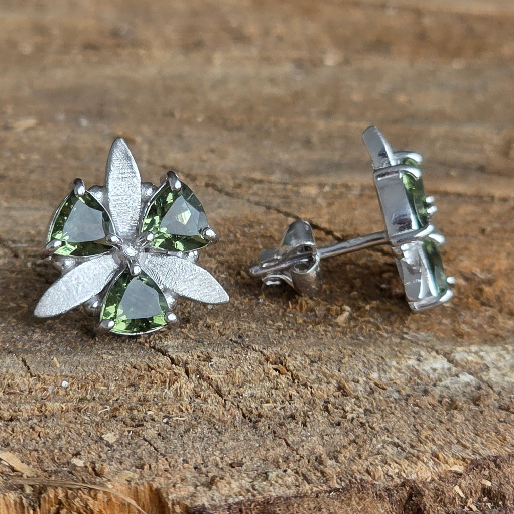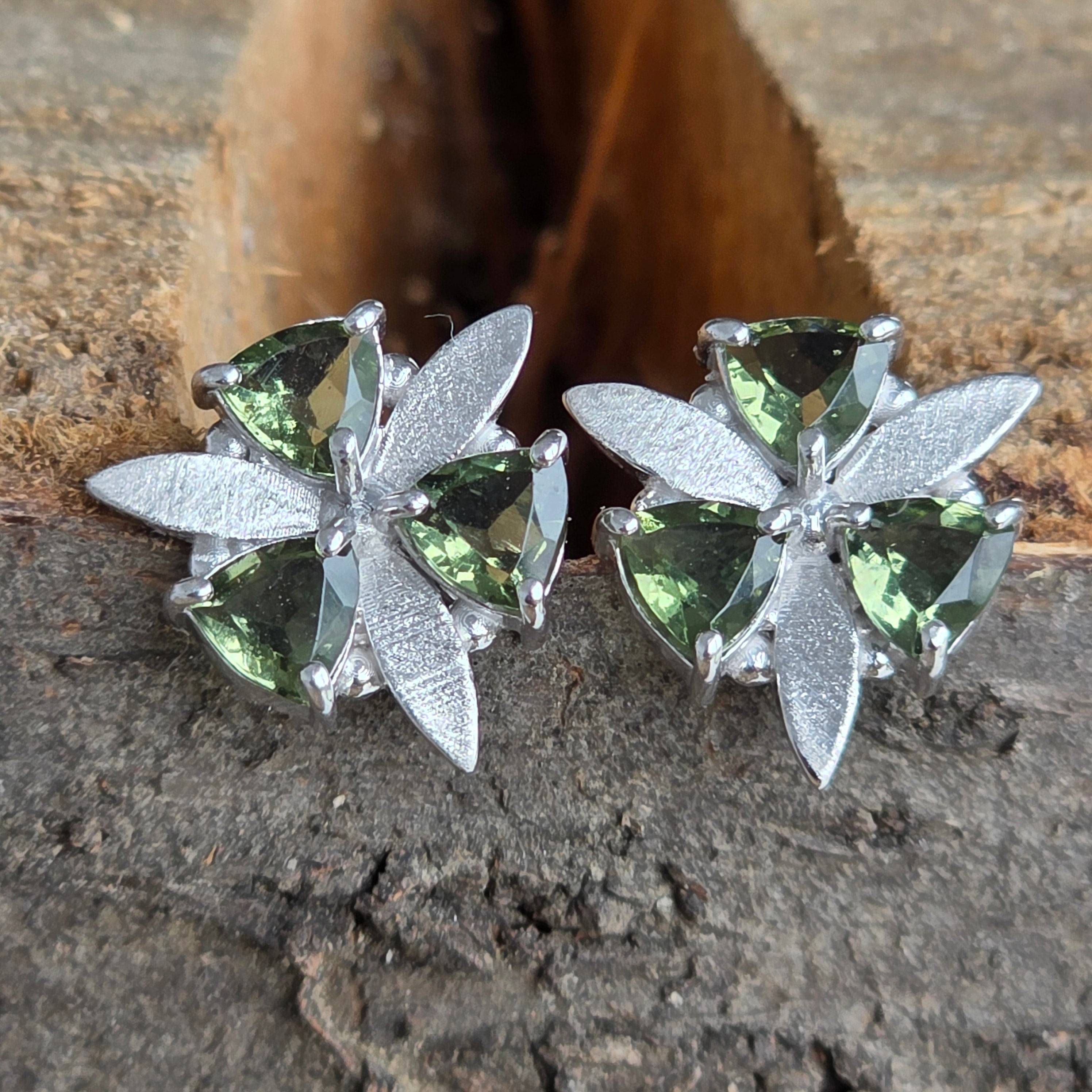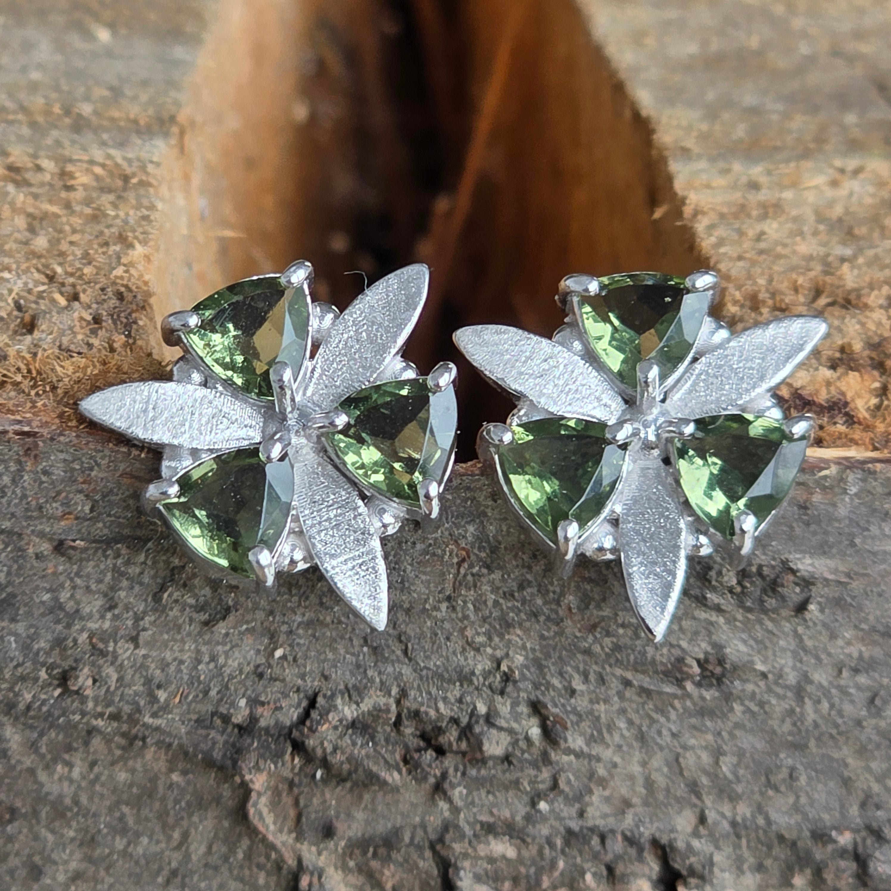 Te eleganckie srebrne kolczyki 925 przynoszą naturalne piękno Moldavit do kwiatowej inspiracji. Każde kolczyki składa się z trzech fasetowanych kamieni Mołdovit, ułożonych harmonijnie jak płatki rzadkiego kwiatu, które łączą przysmak projektu z unikalnymi wibracjami kamiennymi.
