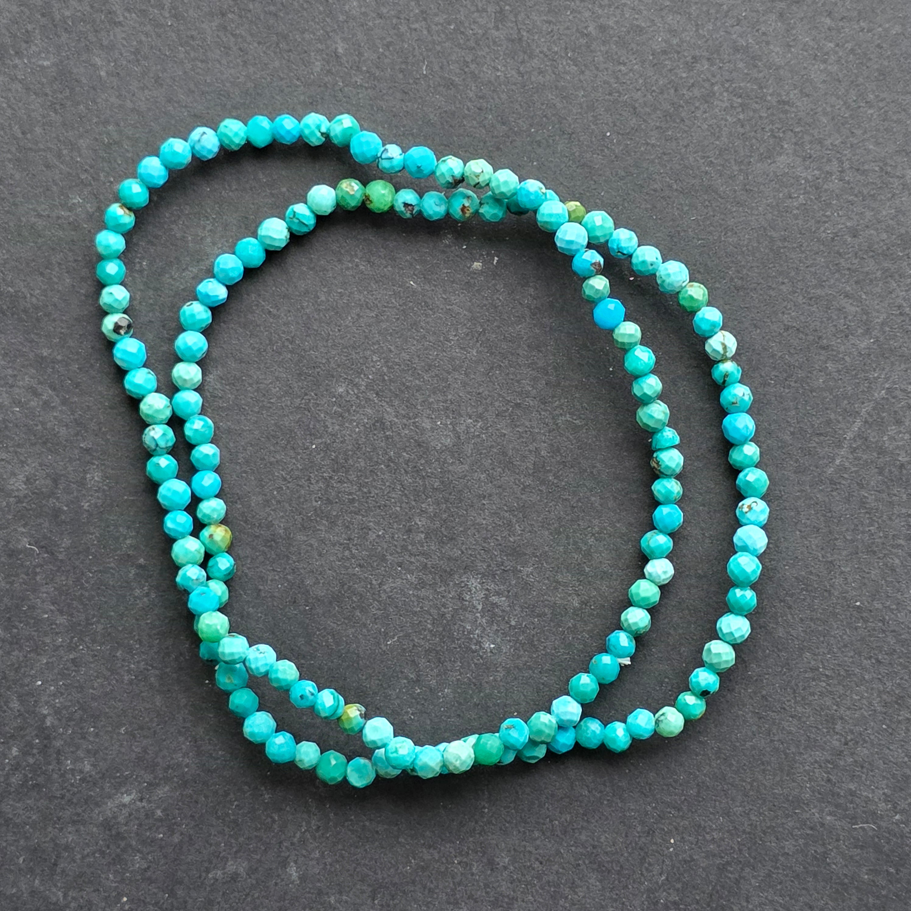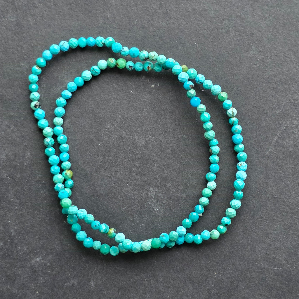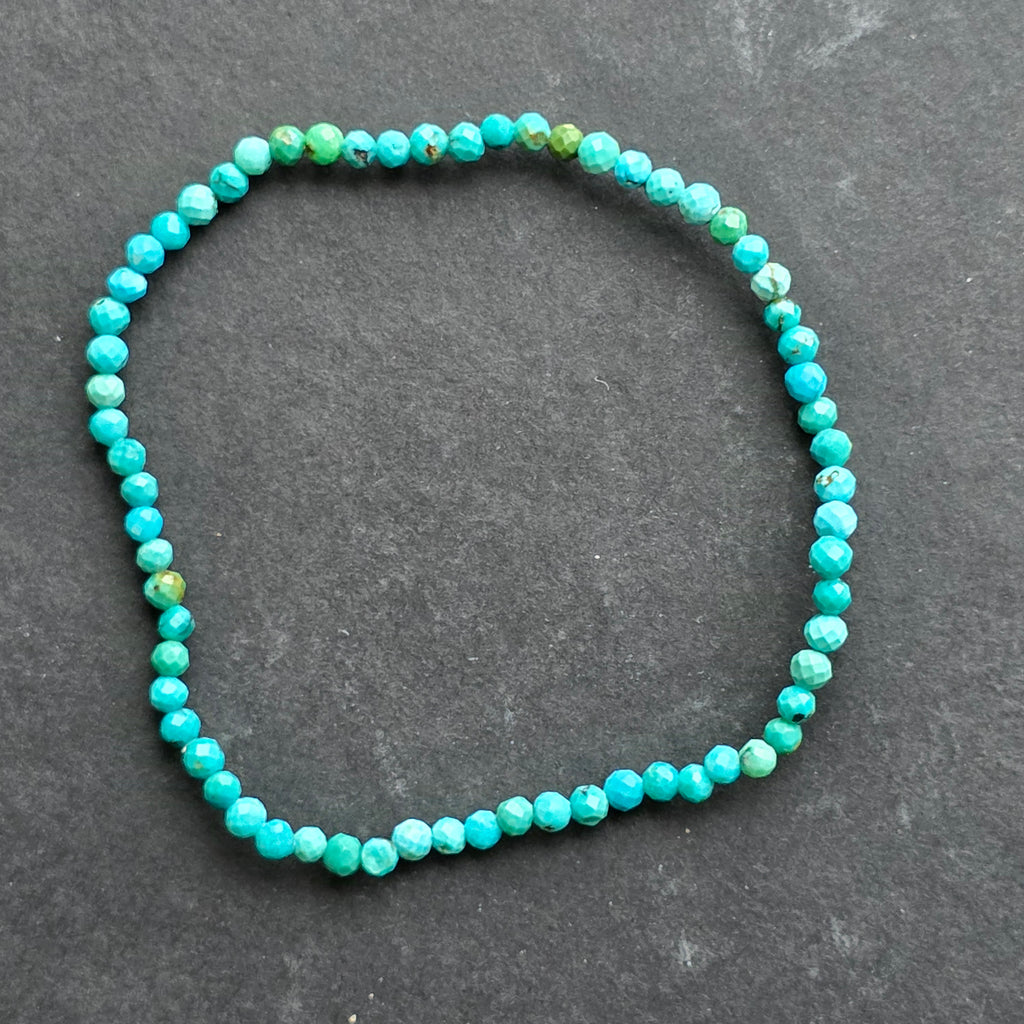O brățară care poartă culorile cerului și ale deșertului, îmbinate într-o strălucire atemporală. Mărgelele fațetate de turcoaz natural, cu diametrul de 3 mm, reflectă o gamă fermecătoare de tonuri albastre și verzi, cu vene fine de cupru și maro care le oferă un caracter unic și pământiu. Strălucirea lor delicată aduce un aer de pace, protecție și noblețe discretă.
