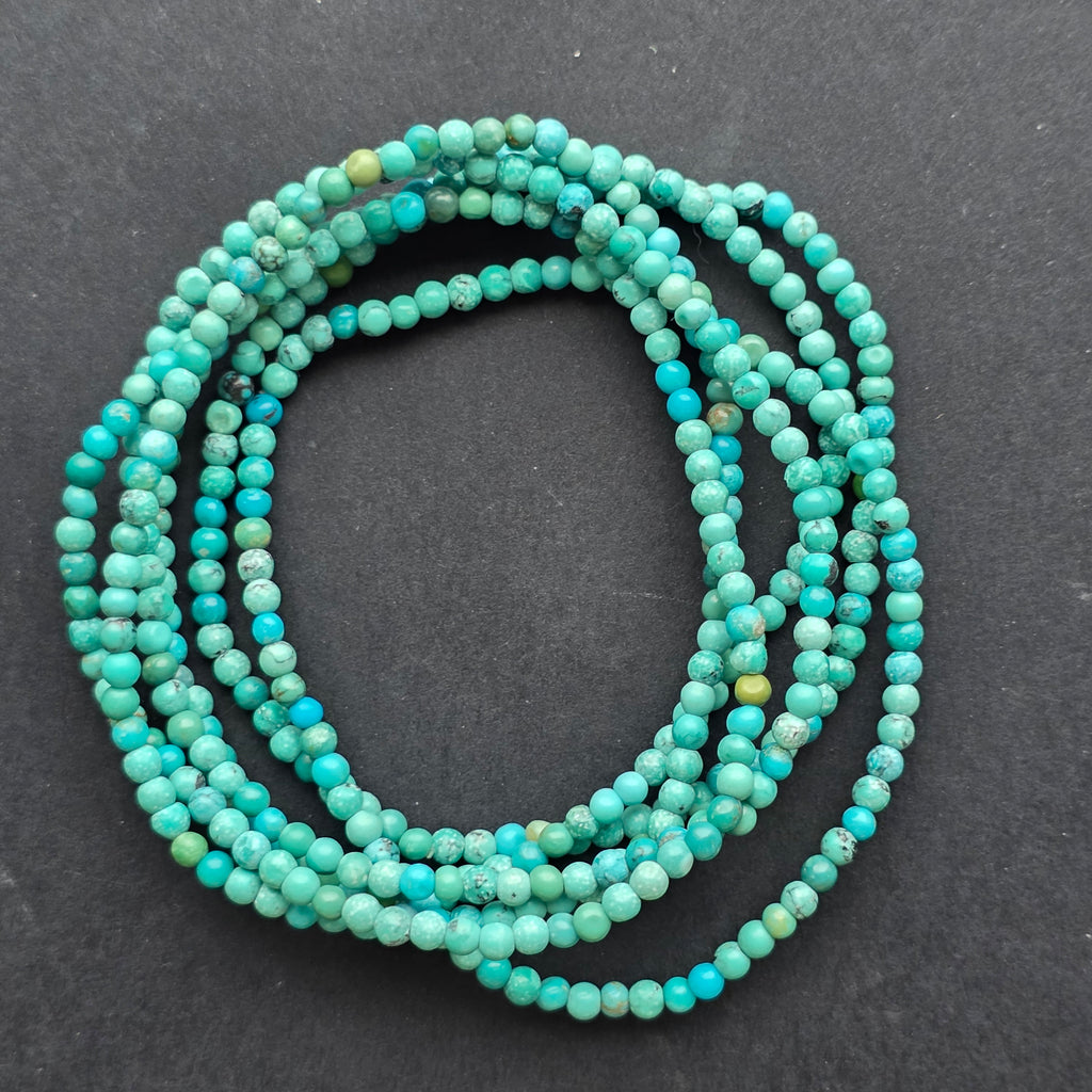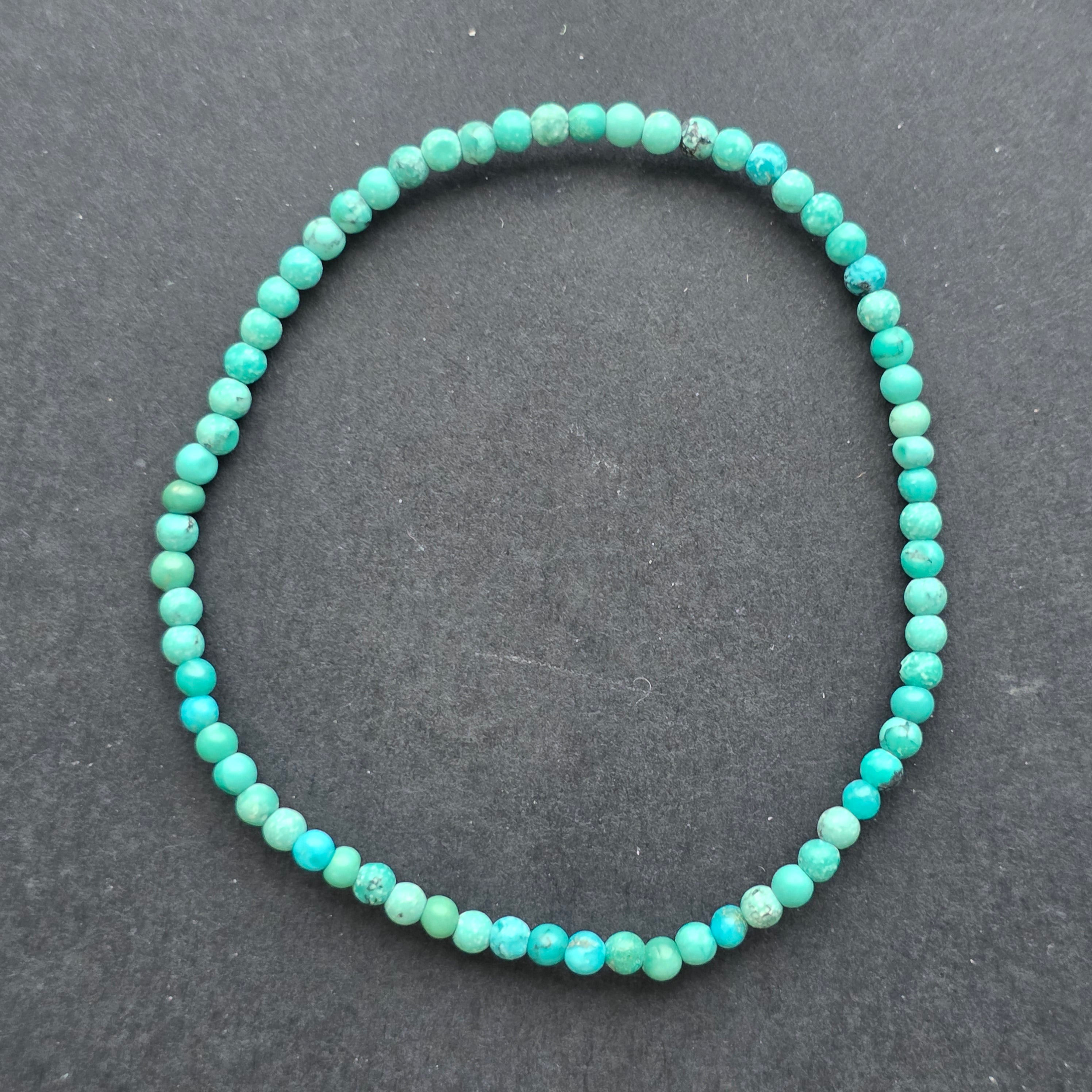 O brățară care poartă culorile cerului și ale deșertului, îmbinate într-o strălucire atemporală. Mărgelele de turcoaz natural, cu diametrul de 3 mm, reflectă o gamă fermecătoare de tonuri albastre și verzi, cu vene fine de cupru și maro care le oferă un caracter unic și pământiu. Strălucirea lor delicată aduce un aer de pace, protecție și noblețe discretă.