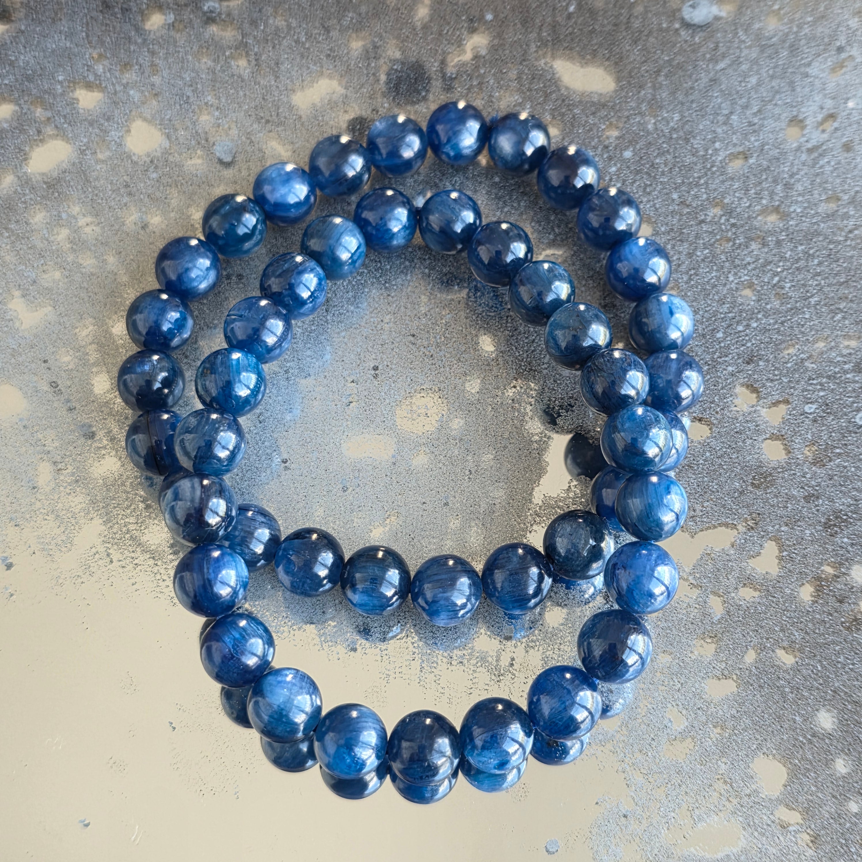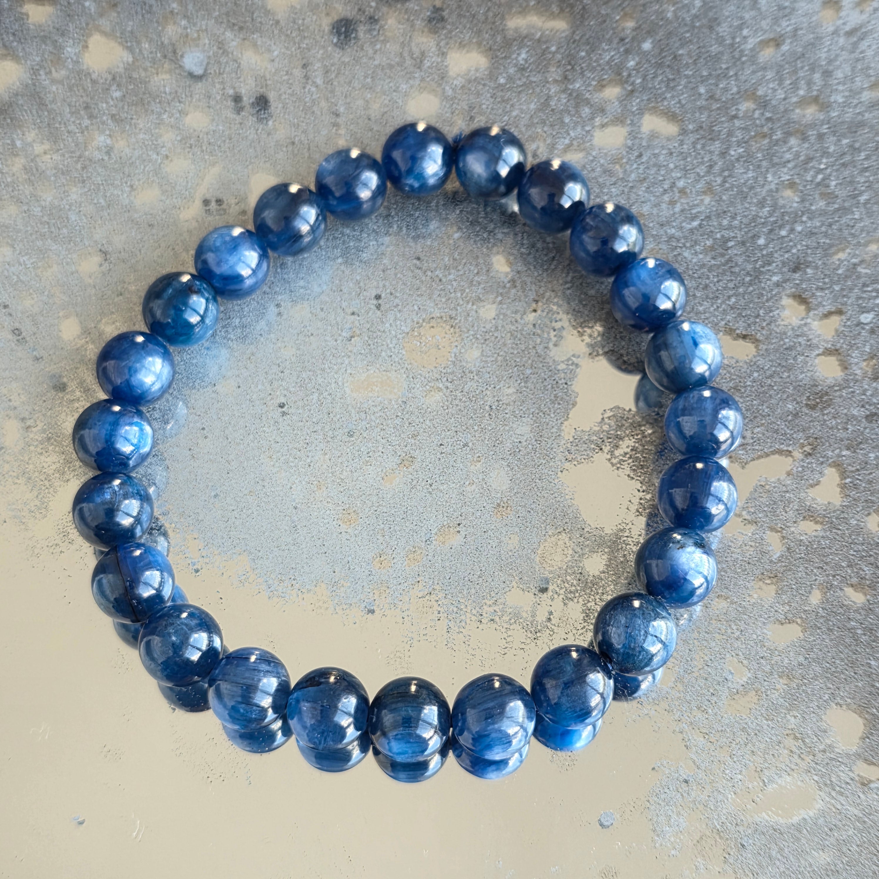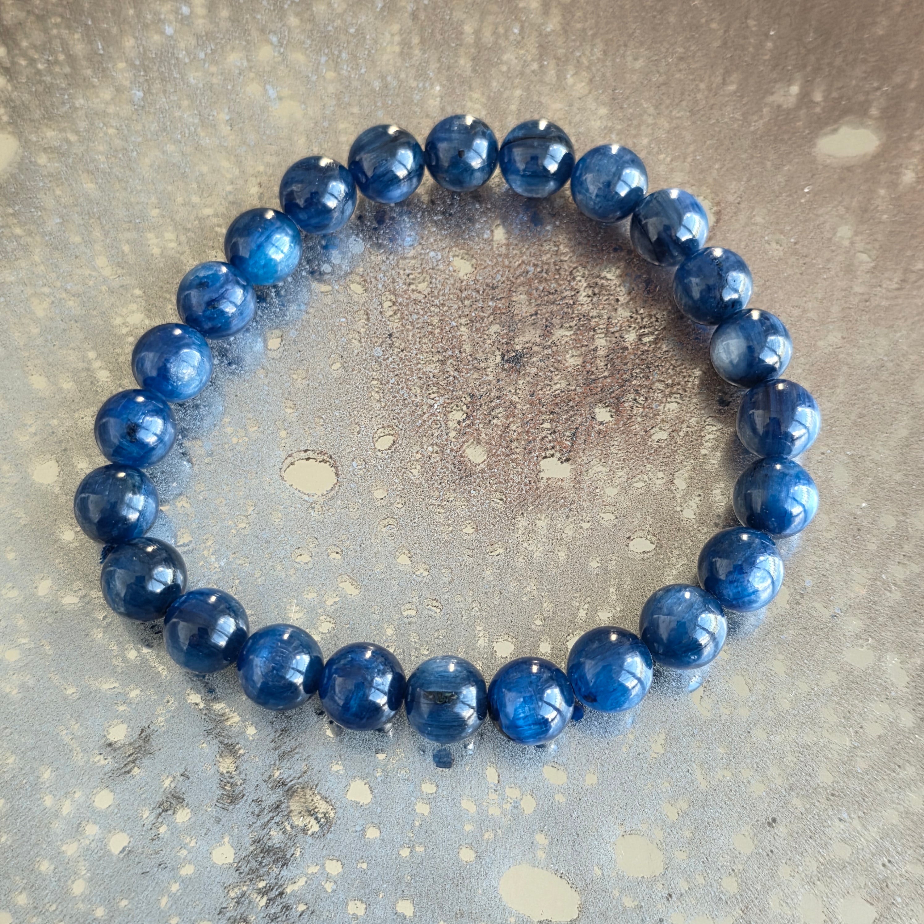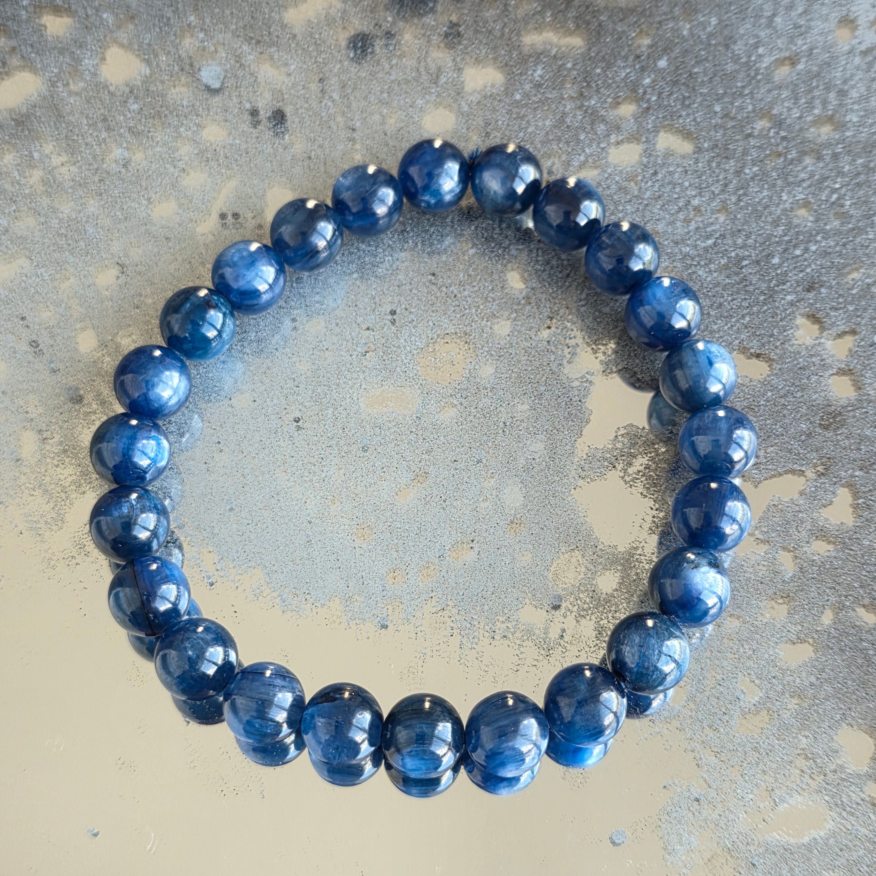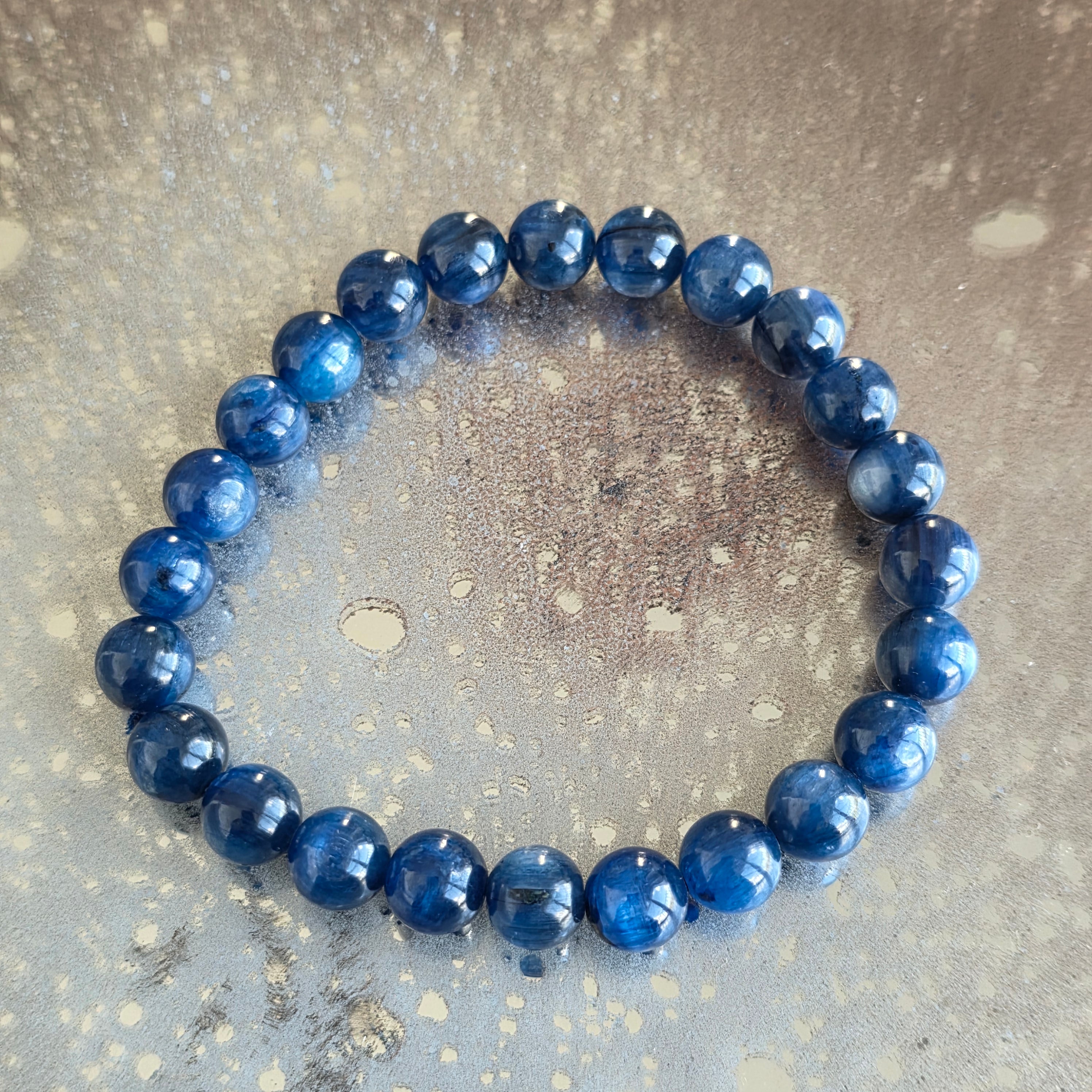 Wyrafinowana i pełna obecności bransoletka, w której głębokie odcienie niebieskiego kyanitu tworzą subtelną grę światła i refleksów. Koraliki o średnicy 8 mm podkreślają naturalne piękno kamienia, oferując równowagę między elegancją a wyrazistością.