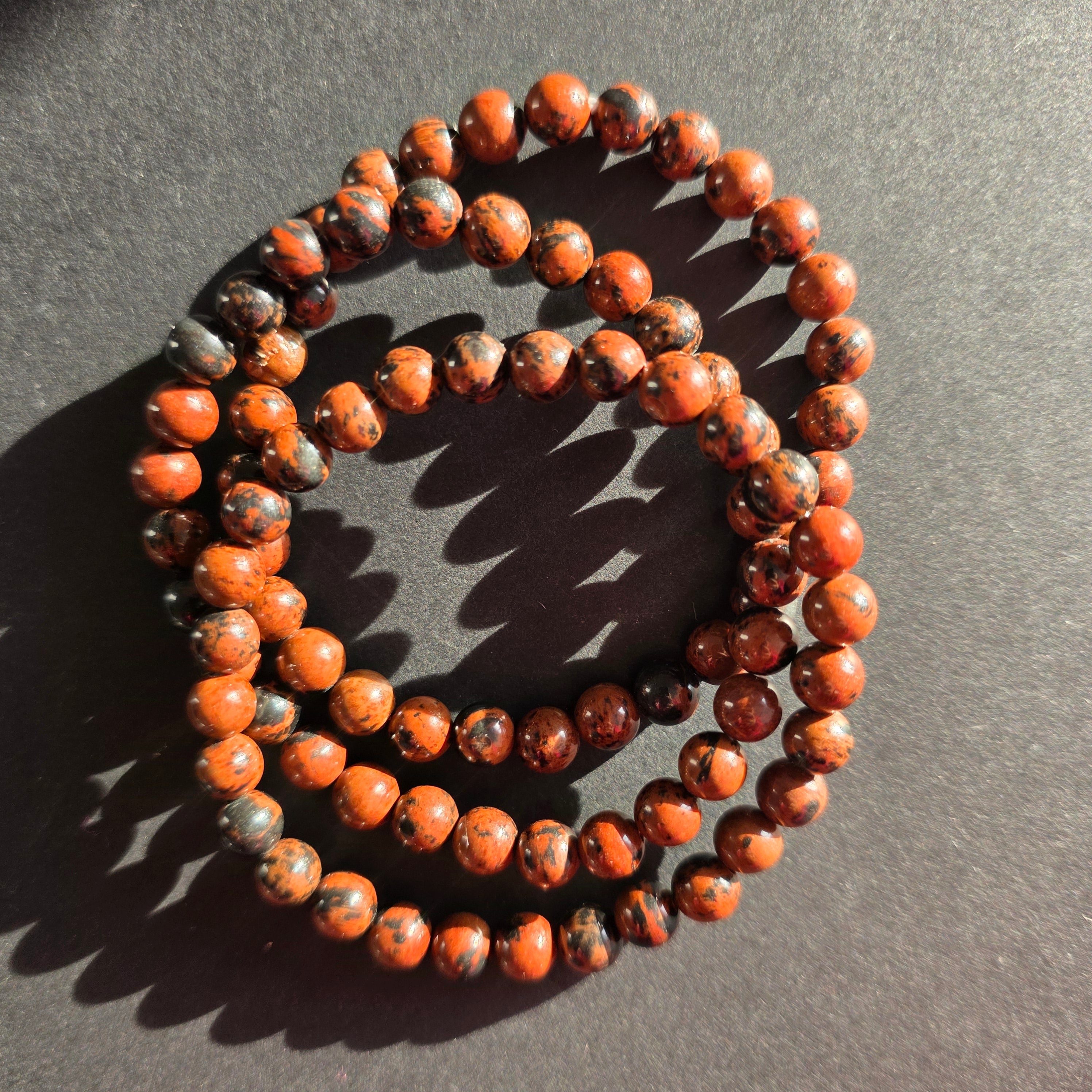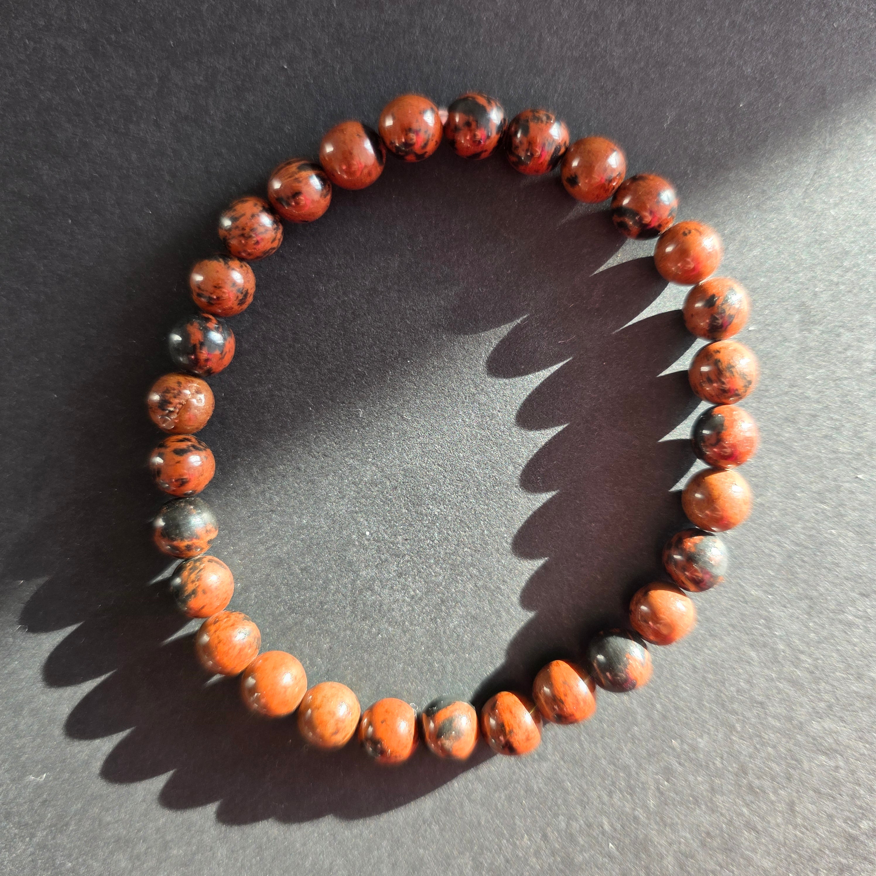 Bransoletka z obsydianu mahoniowego to element o ciepłej, ziemistej estetyce, łączący odcienie czekoladowego brązu z głębokimi czarnymi cieniami, w organicznym kontraście charakterystycznym dla tego typu obsydianu. Każdy koralik to mały fragment zastygłej lawy, noszący w sobie ślady ujarzmionego ognia i naturalną strukturę.