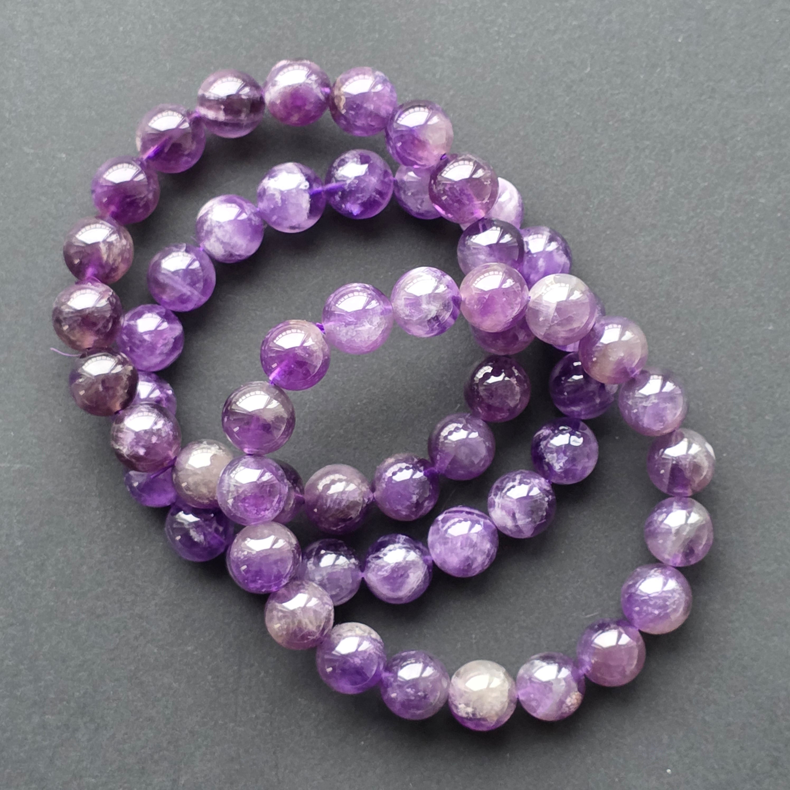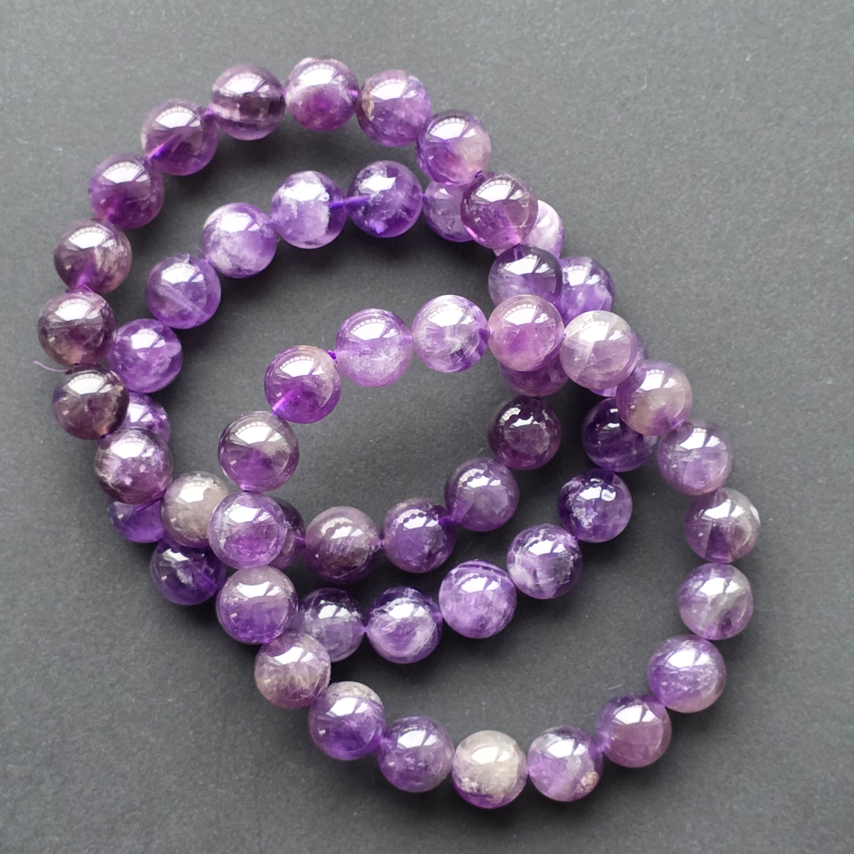 Fiecare mărgea surprinde lumina în reflexii subtile, iar tonurile variate de mov — de la nuanțe profunde până la accente diafane — transformă brățara într-o piesă elegantă, calmă și armonioasă. Este ușor de purtat, fină la încheietură și potrivită atât pentru ținute casual, cât și pentru un stil mai sofisticat.