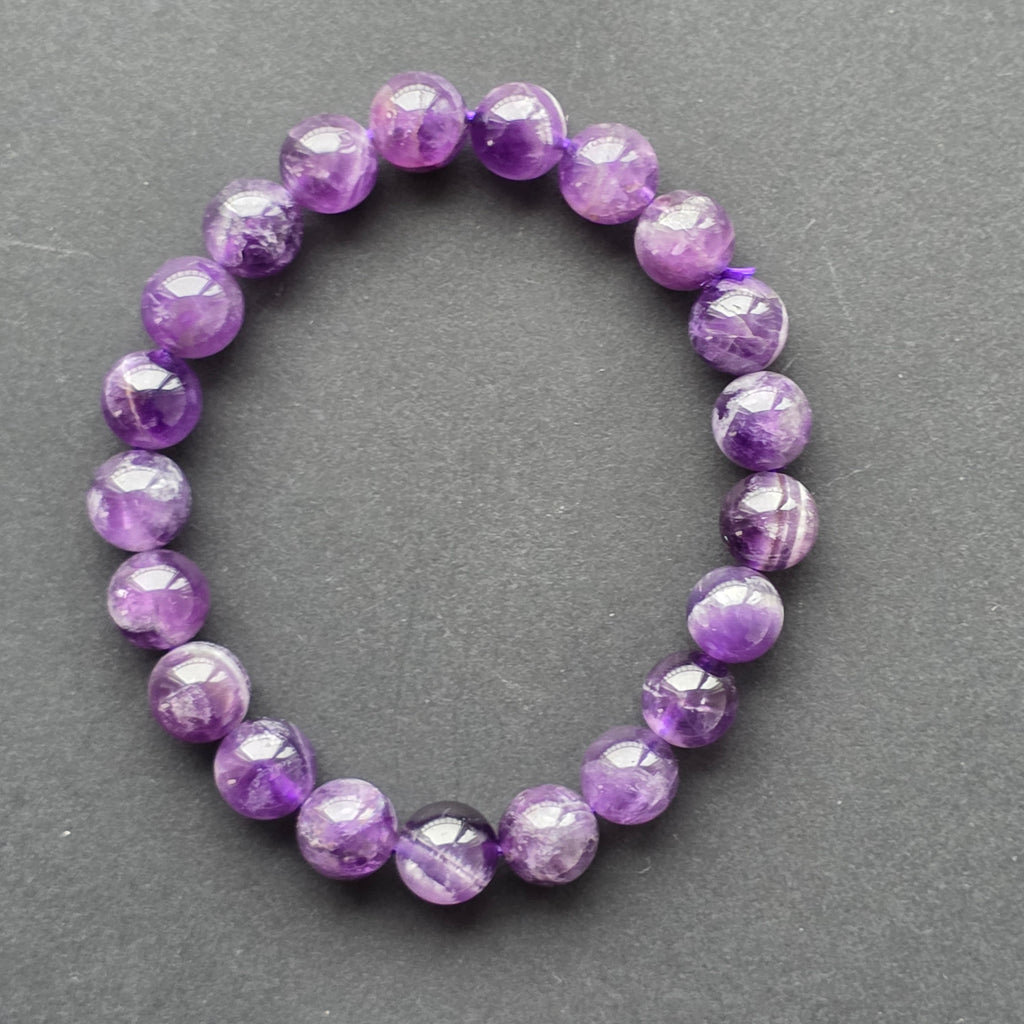 Fiecare mărgea surprinde lumina în reflexii subtile, iar tonurile variate de mov — de la nuanțe profunde până la accente diafane — transformă brățara într-o piesă elegantă, calmă și armonioasă. Este ușor de purtat, fină la încheietură și potrivită atât pentru ținute casual, cât și pentru un stil mai sofisticat.