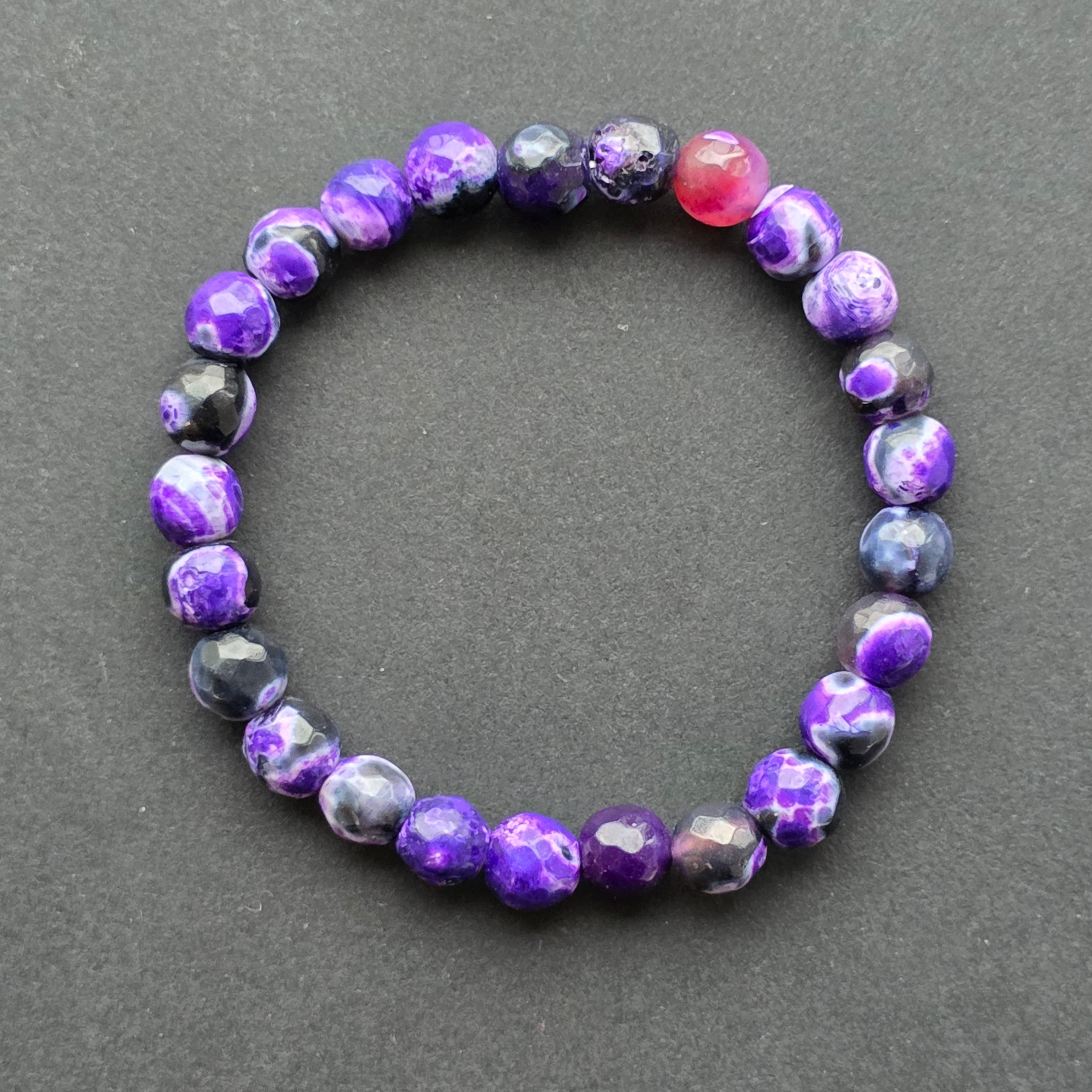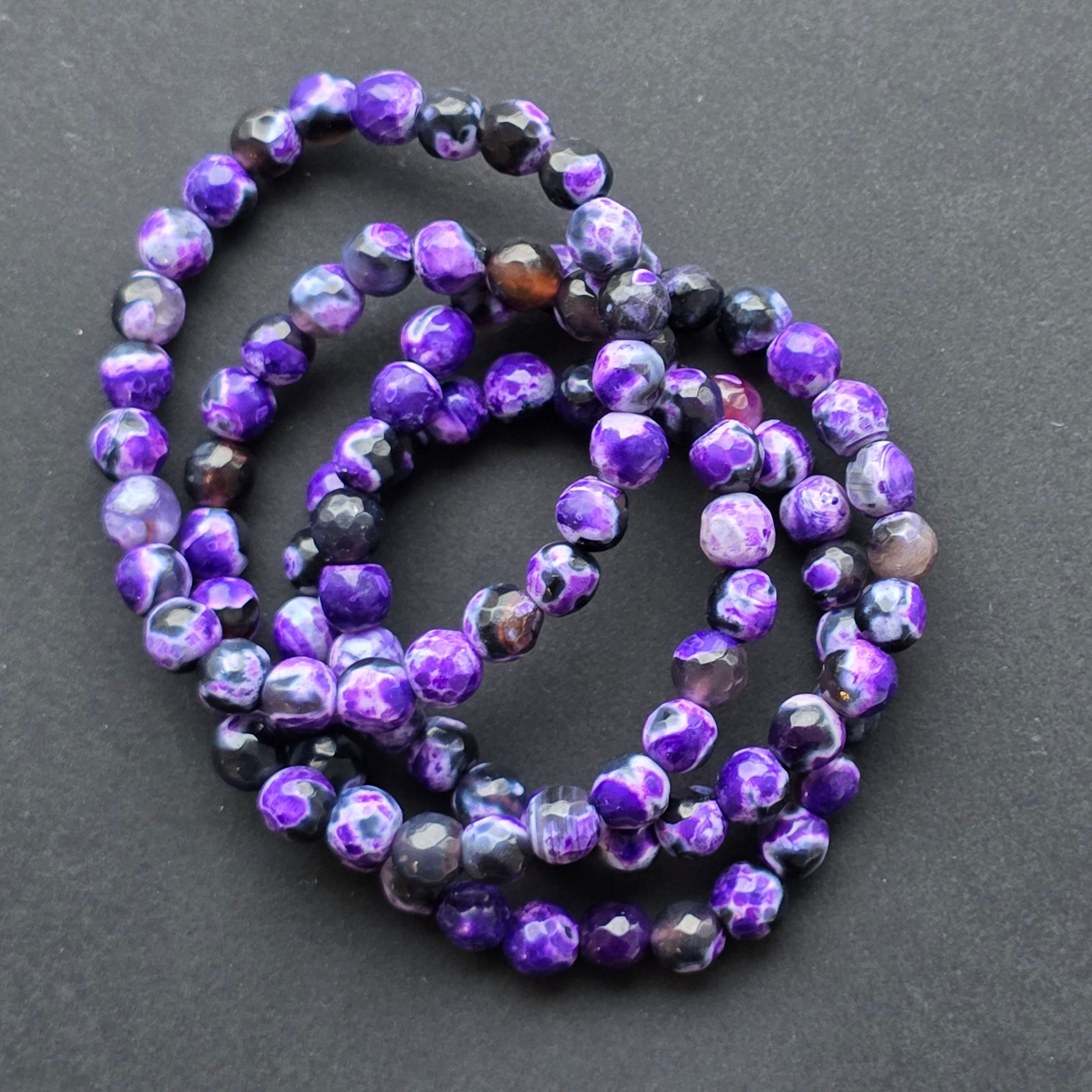 • Piatra: agat mov (agate fire, colorat) – mărgele sferice fațetate 6 mm