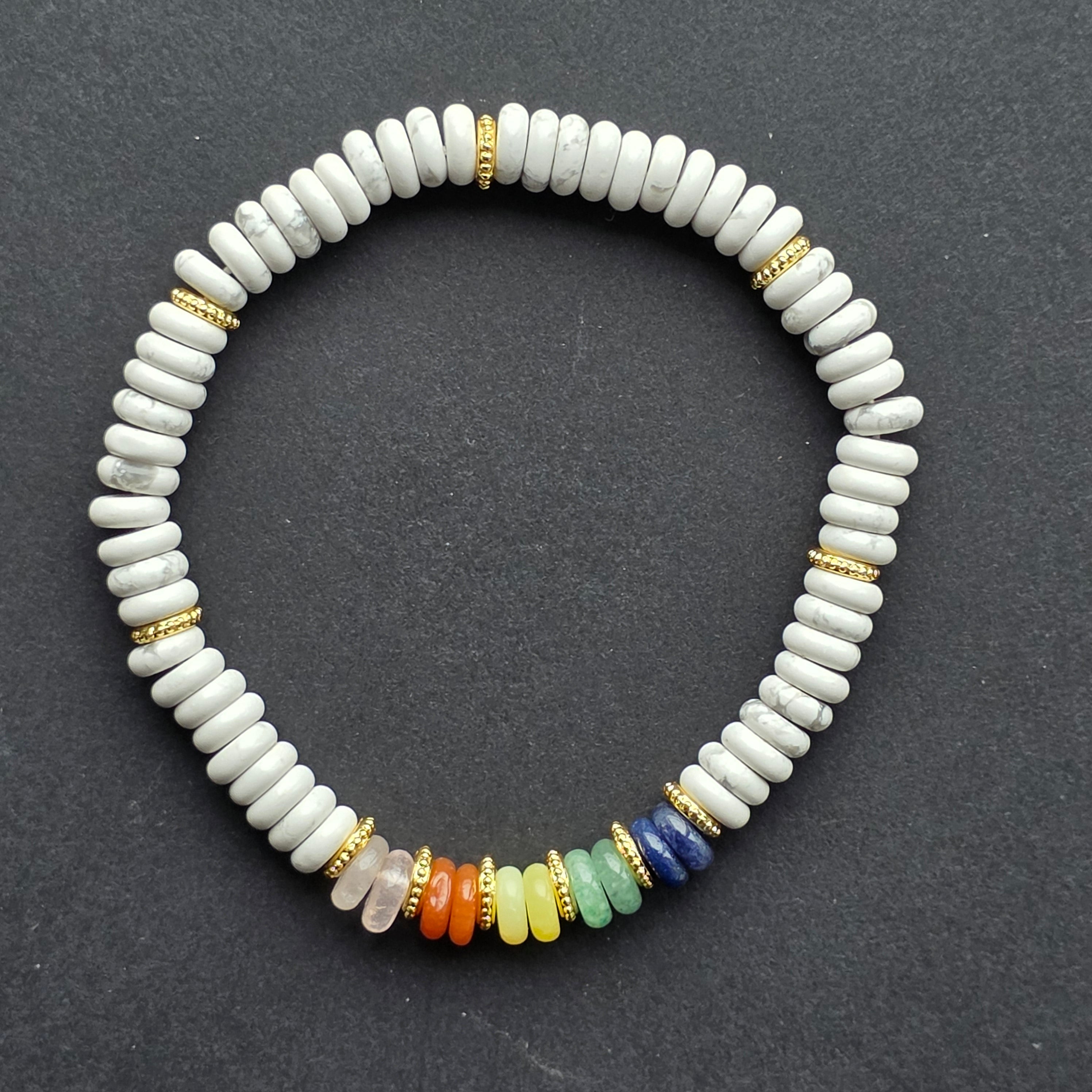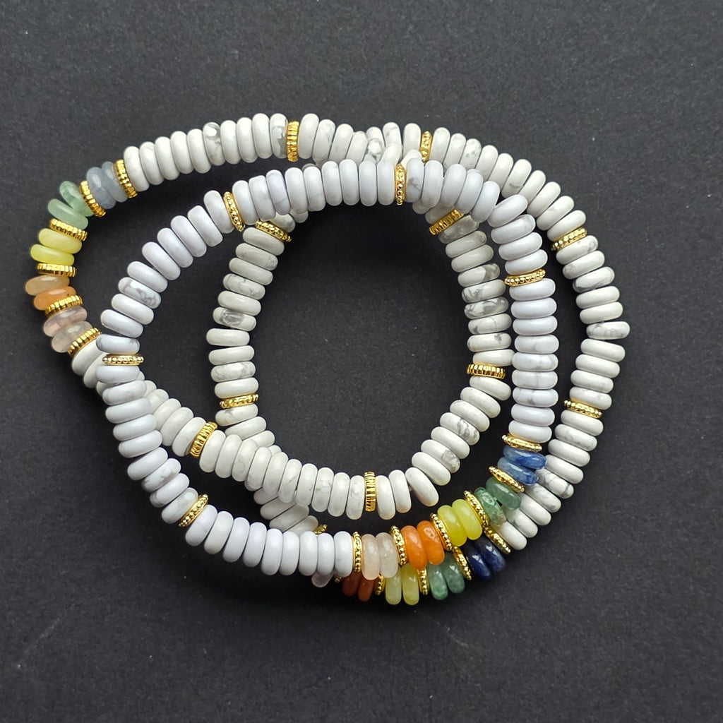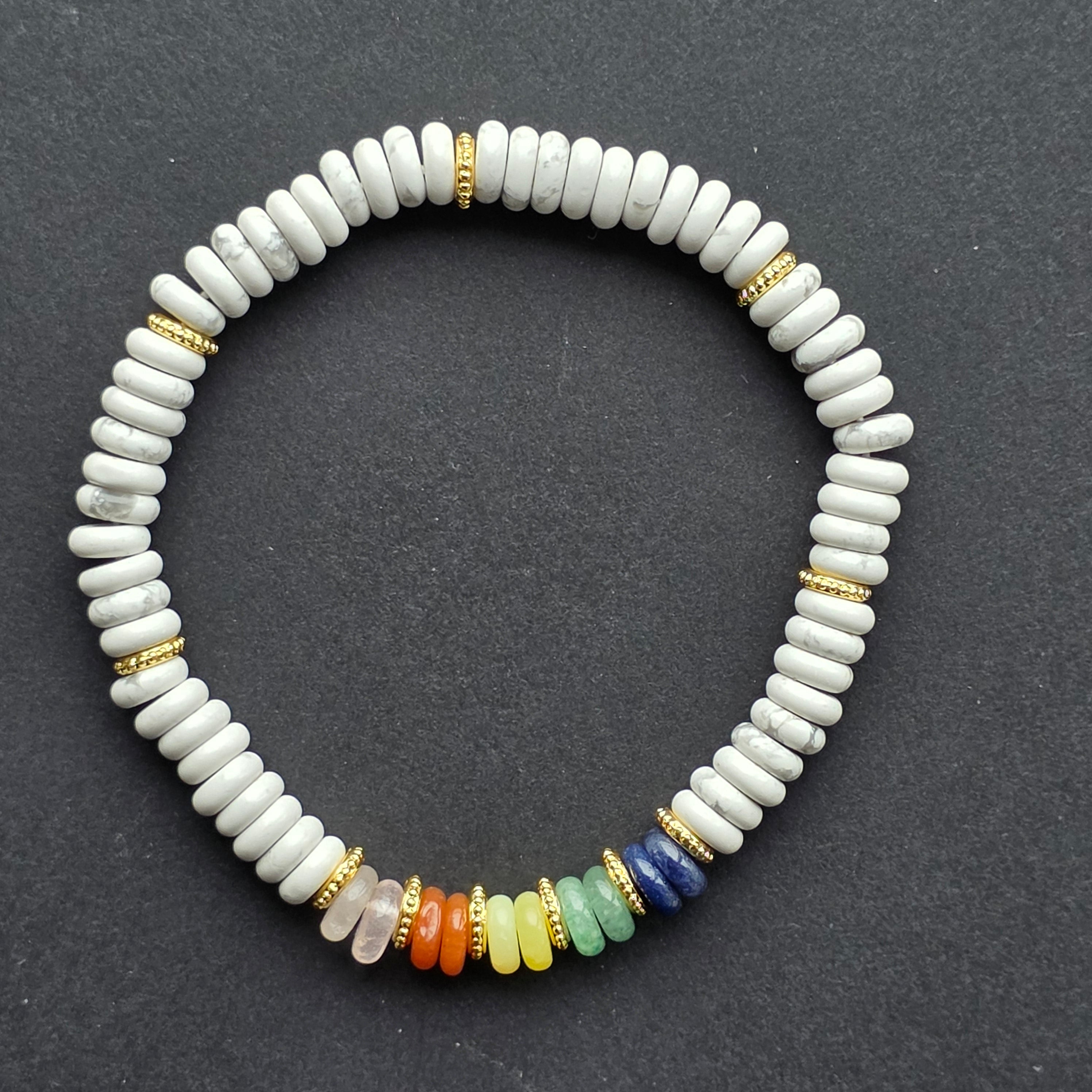 Brățară creată din howlit alb natural, un mineral cunoscut pentru liniile sale subtile și pentru aspectul calm, minimalist. Discurile fine creează o textură plăcută la atingere, iar nuanțele albe, marmorate, oferă o eleganță pură și neutră — ușor de asortat cu orice ținută.