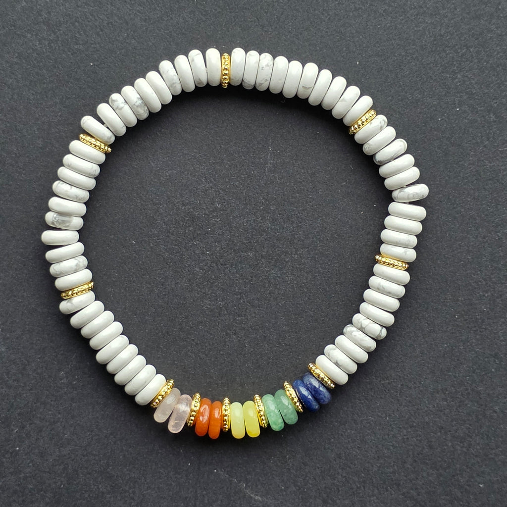 În partea centrală, șirul de pietre colorate aduce energia cromatică a celor 7 chakre, fiecare culoare reprezentând o etapă a echilibrului interior. Împreună, formează un accent vibrant și armonios, care dă viață brățării și o transformă într-un simbol al alinierii, al intențiilor clare și al revenirii către sine.