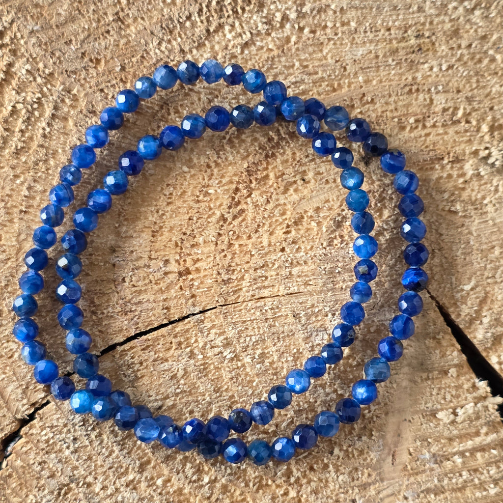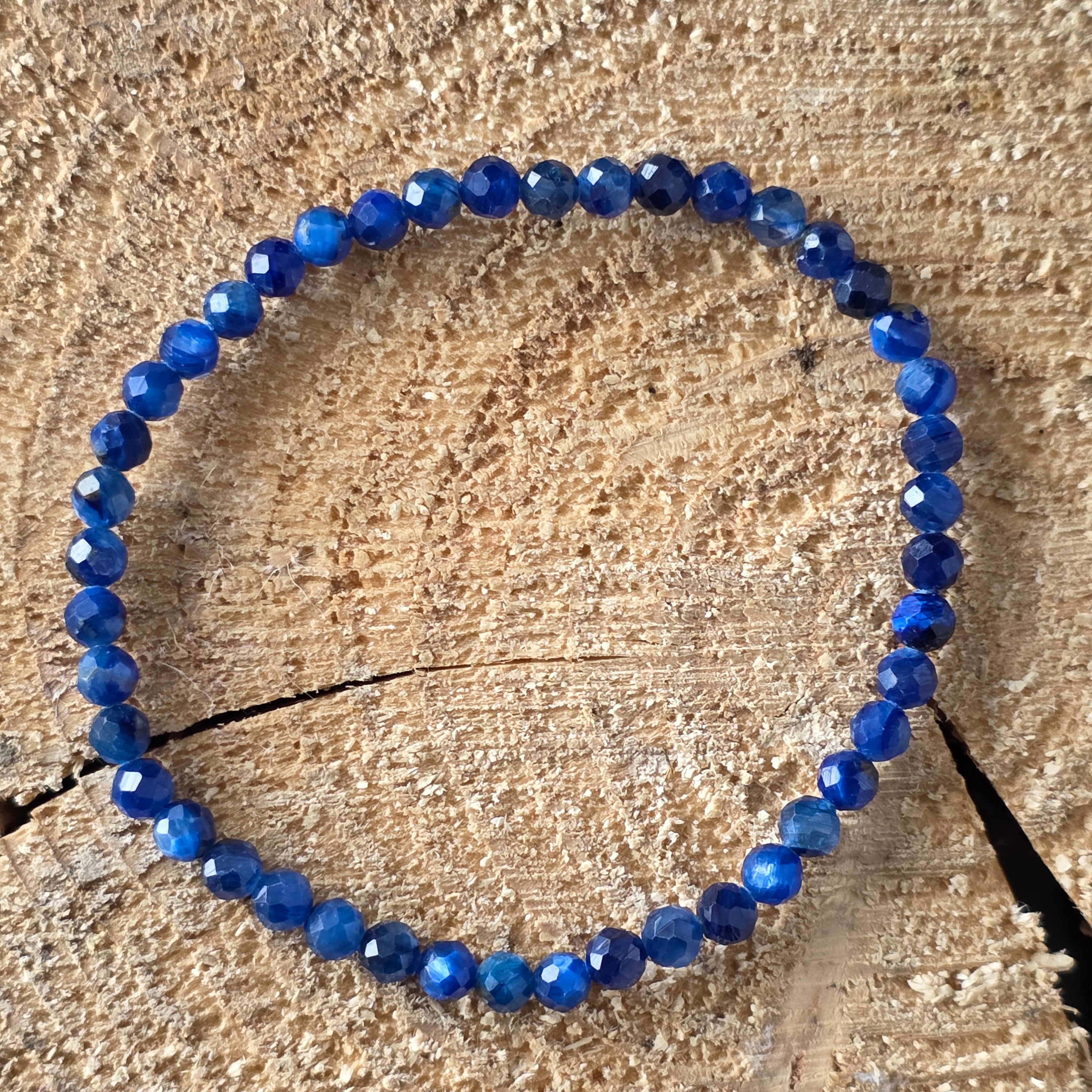 O brățară care poartă adâncimea cerului și liniștea valurilor. Mărgelele fațetate de kyanit natural, cu diametrul de 4 mm, reflectă nuanțe fascinante de albastru intens, uneori străbătute de umbre argintii sau linii deschise ce amintesc de textura cristalină a gheții. Este o bijuterie rafinată și plină de prezență, creată pentru cei care caută claritate, armonie și conectare la adevărul propriu.