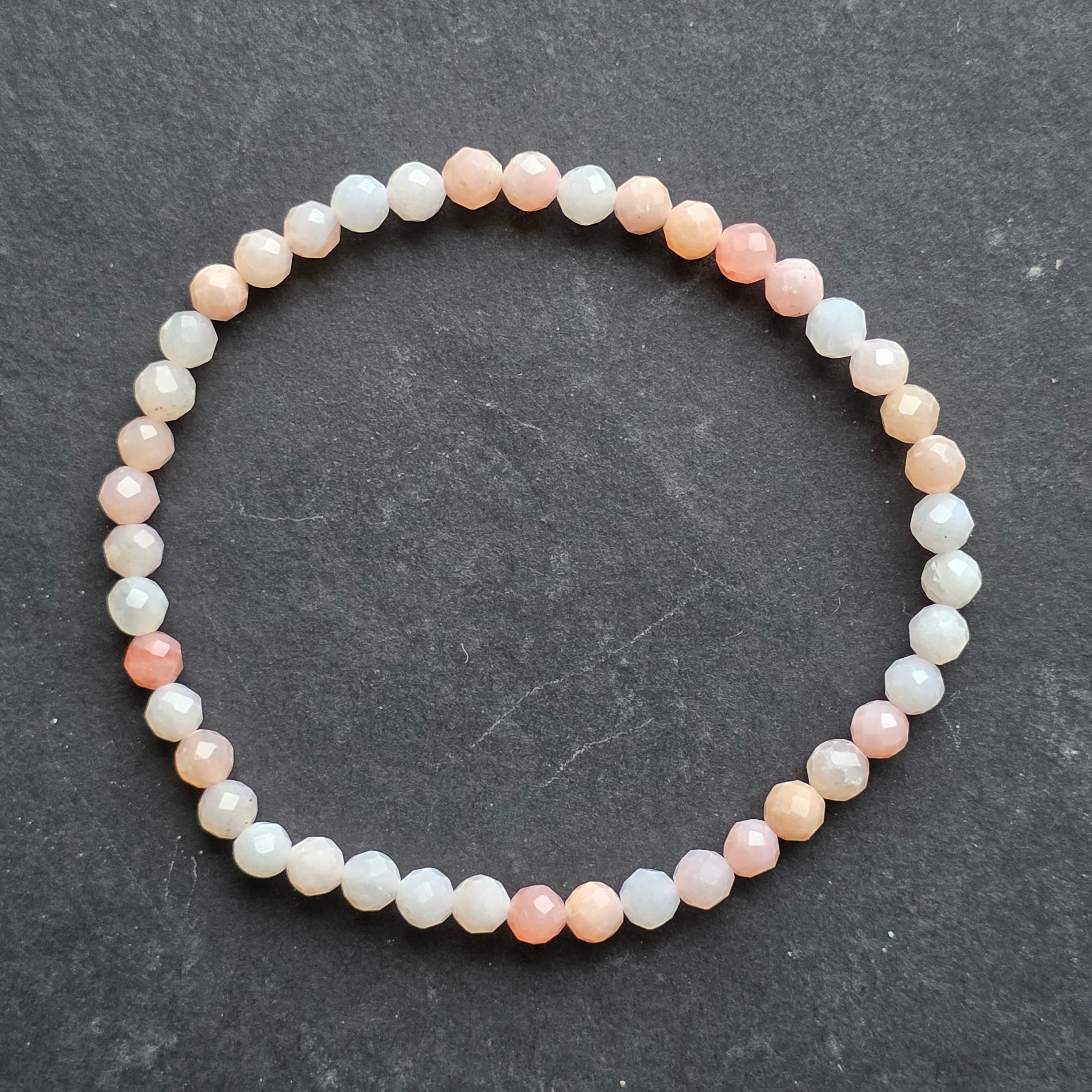 O brățară delicată ca o promisiune de lumină. Mărgelele fațetate de opal roz natural, cu diametrul de 4 mm, strălucesc în nuanțe diafane de roz pal, crem și bej cald, formând un joc subtil de culori ce emană feminitate și armonie. Este o bijuterie fină, cu o energie calmă și protectoare, menită să aducă liniște inimii și încredere în propriul drum.