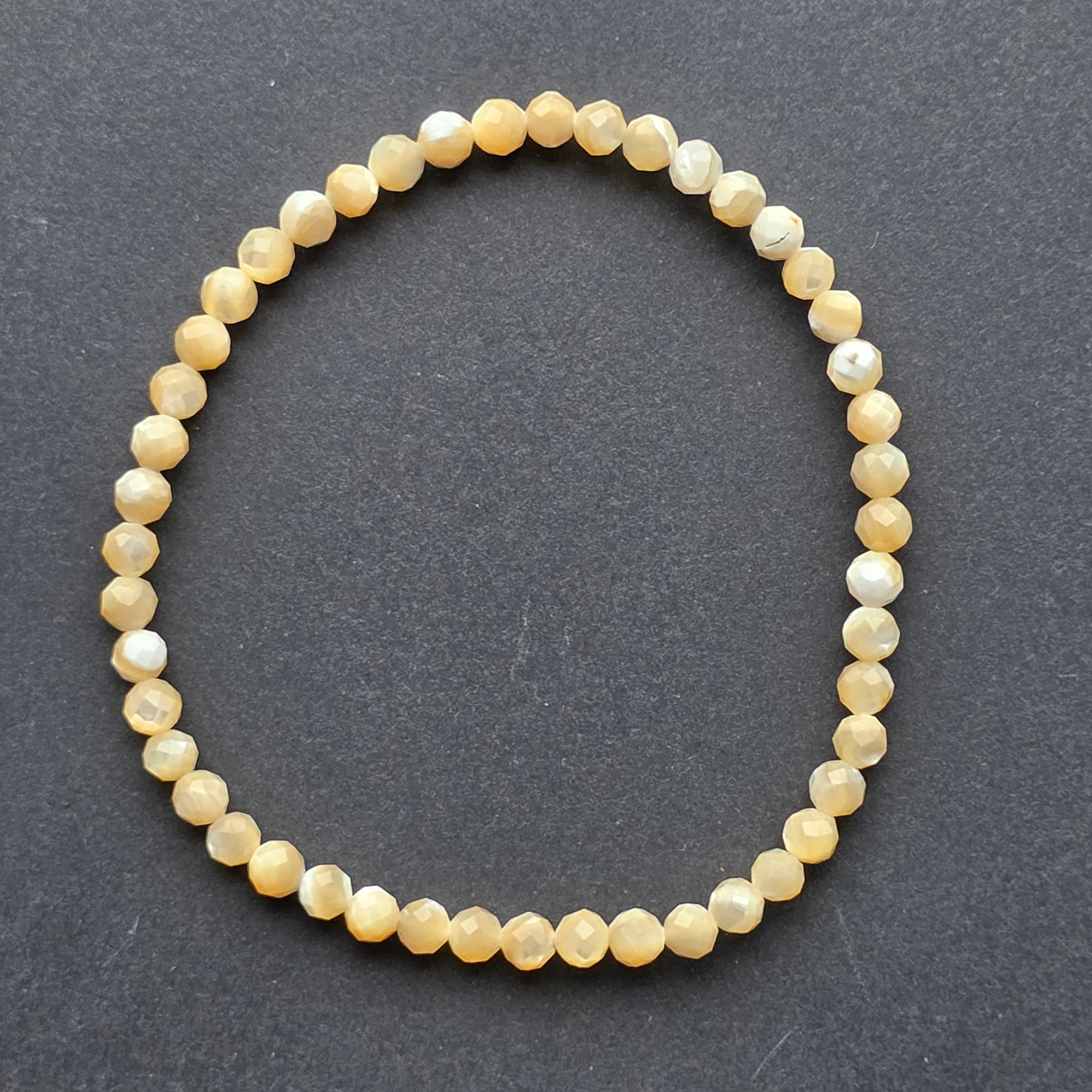 Brățara fațetată din sidef este o piesă cu lumină proprie — delicată, caldă și subtil perlată. Mărgelele mici, atent fațetate, surprind fiecare rază de lumină într-un joc fin de reflexii, păstrând totuși naturalețea organică a scoicii din care sunt create.