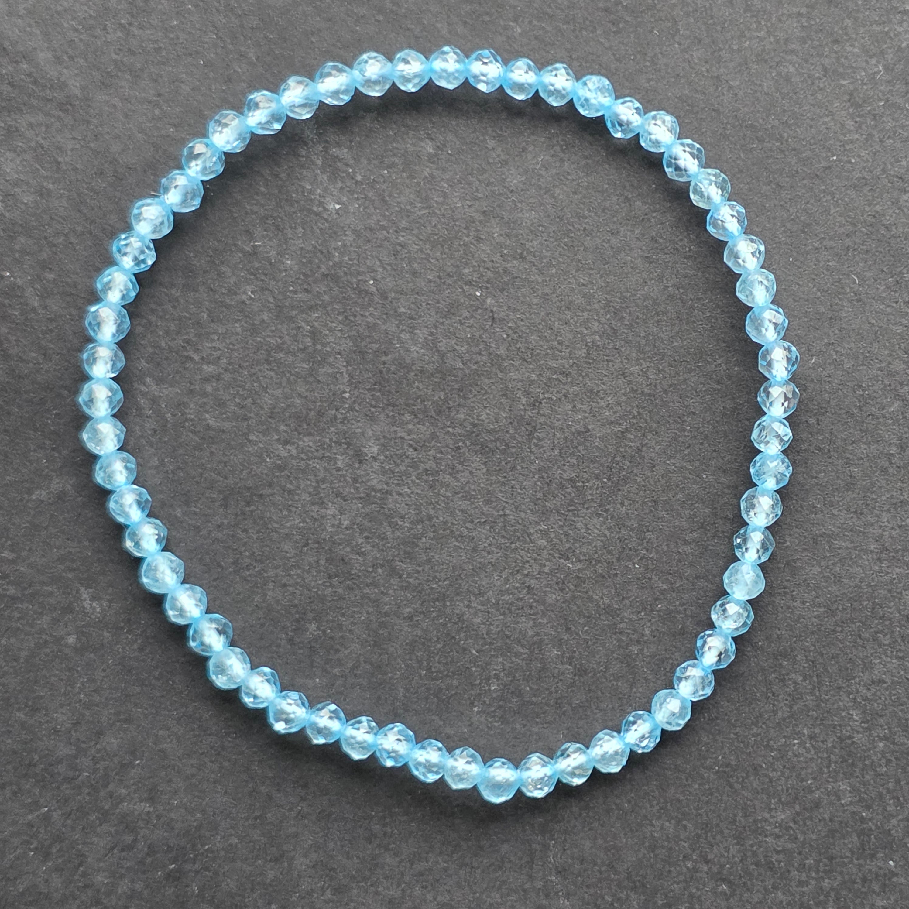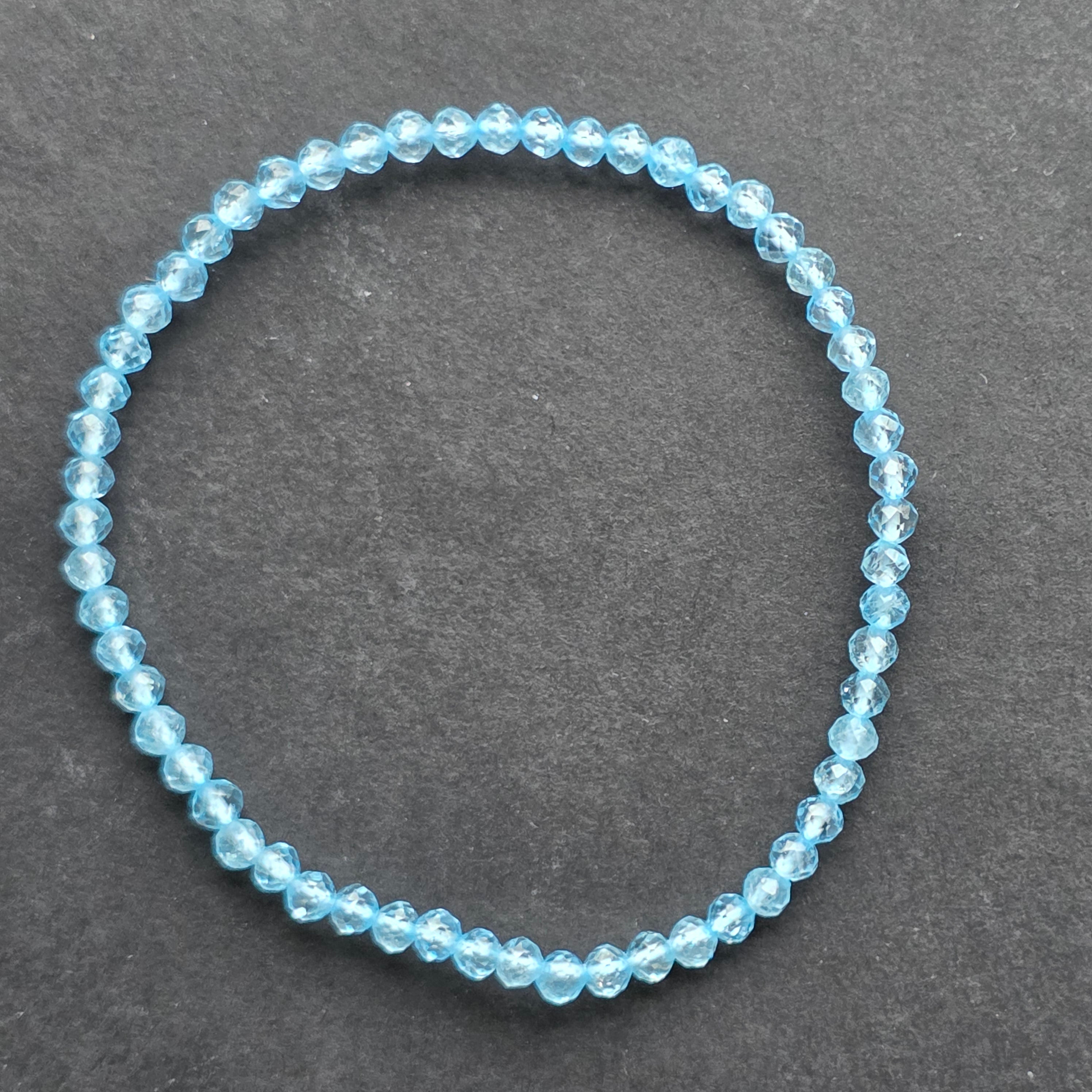O brățară delicată ca o adiere de mare, unde lumina cerului se reflectă în fiecare fațetă. Mărgelele fațetate de topaz albastru natural, cu diametrul de 3 mm, emană o strălucire pură, cristalină, ce amintește de apele limpezi ale unei dimineți senine. Este o bijuterie subtilă și rafinată, creată pentru cei care caută echilibru și pace interioară.