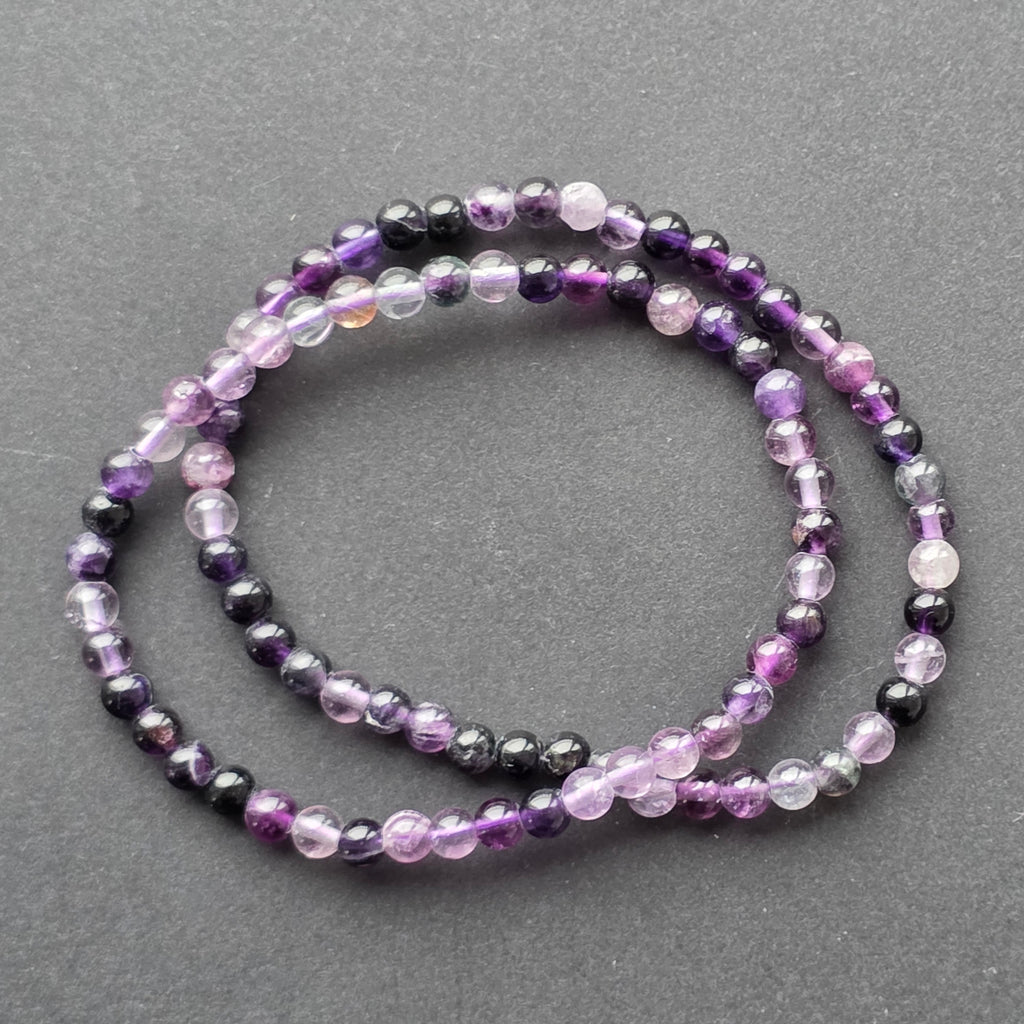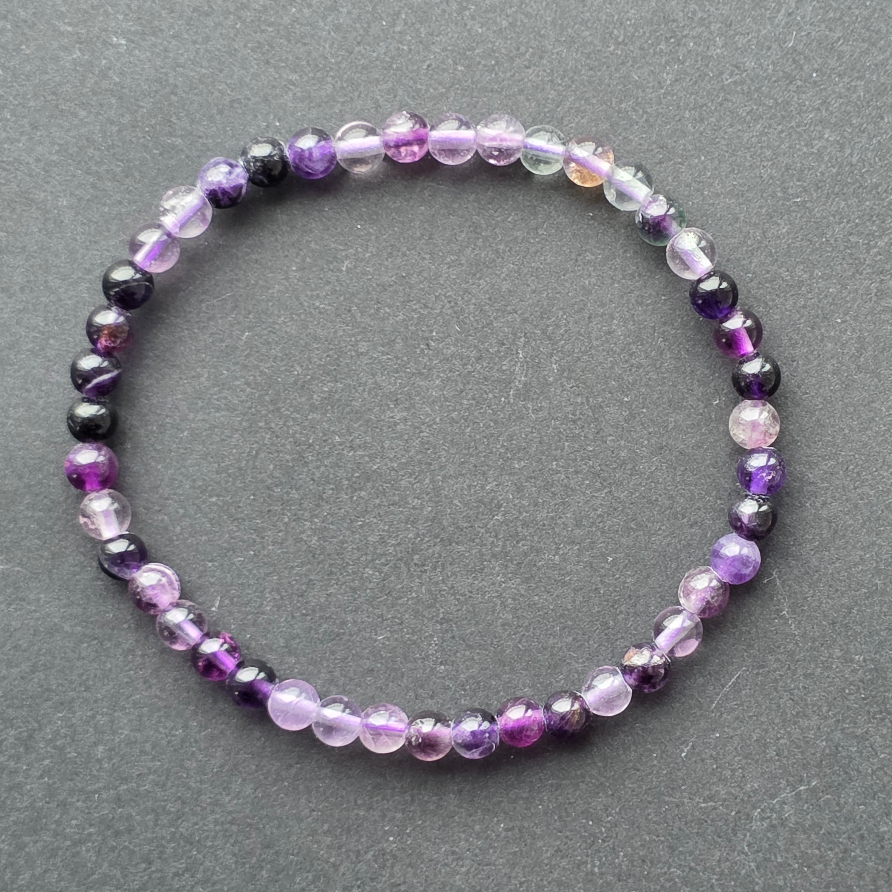 Brățara din fluorină mov este o bijuterie delicată, în care lumina pare să circule liber printre nuanțe de violet pal, mov intens și mici accente mai închise. Pietrele sunt naturale, fiecare cu propria transparență, propriul joc de reflexii și propria amprentă subtilă lăsată de natură.