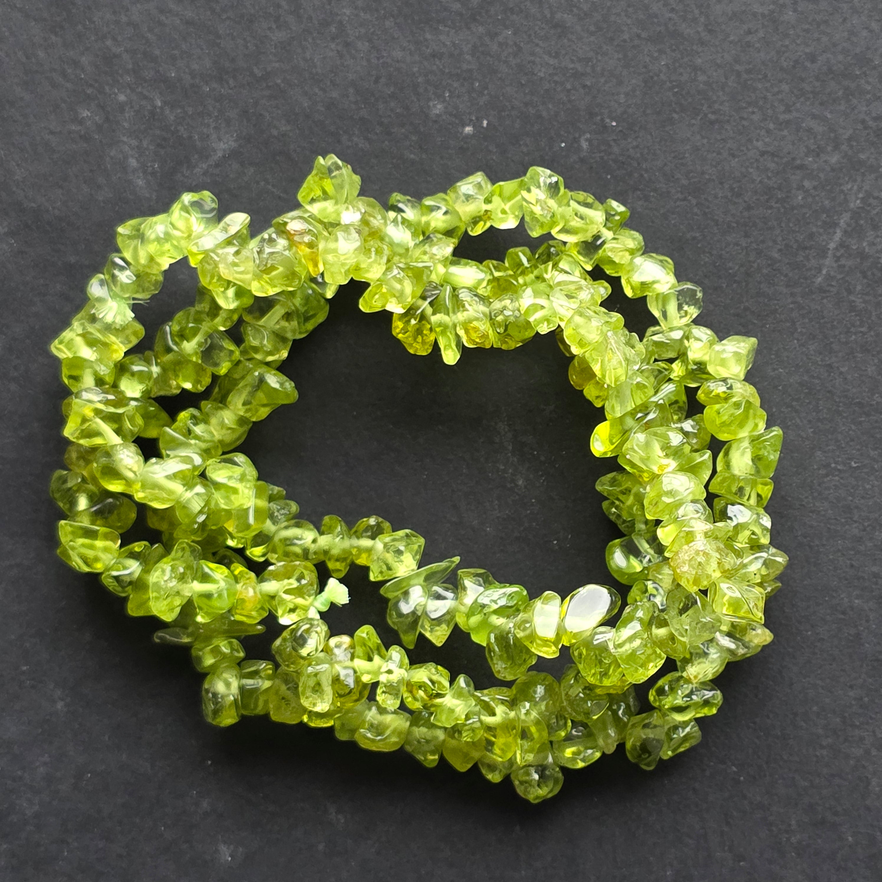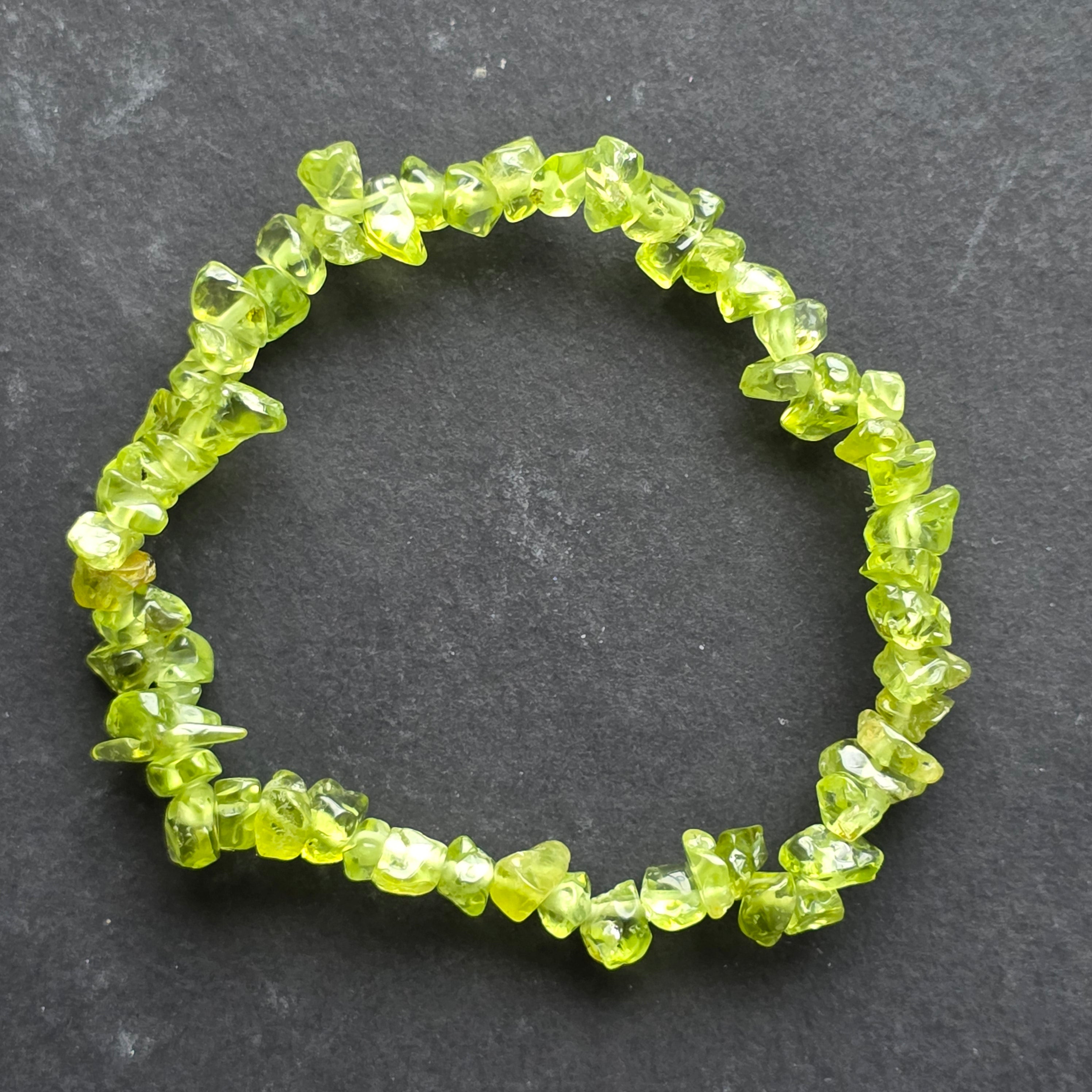 O brățară care poartă prospețimea dimineților verzi și lumina blândă a soarelui de vară. Chipsurile naturale de peridot, șlefuite manual și înșirate pe fir elastic, creează o compoziție vie, plină de strălucire și vitalitate. Nuanțele sale de verde translucid, cu accente aurii subtile, emană o eleganță naturală și o energie care inspiră calm și regenerare.