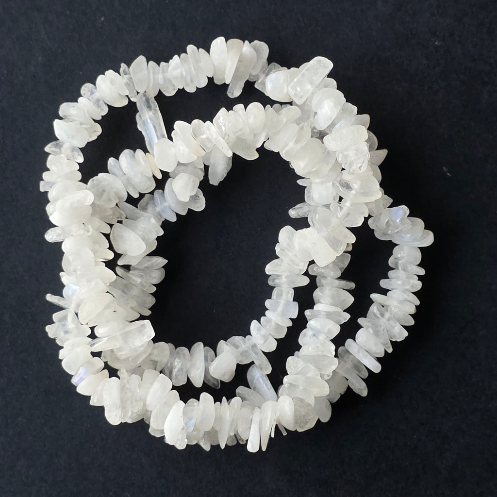 • Piatra: piatra lunii naturală (chipsuri neregulate, șlefuite manual) – asociată cu puritatea emoțiilor, intuiția crescută și echilibrul interior