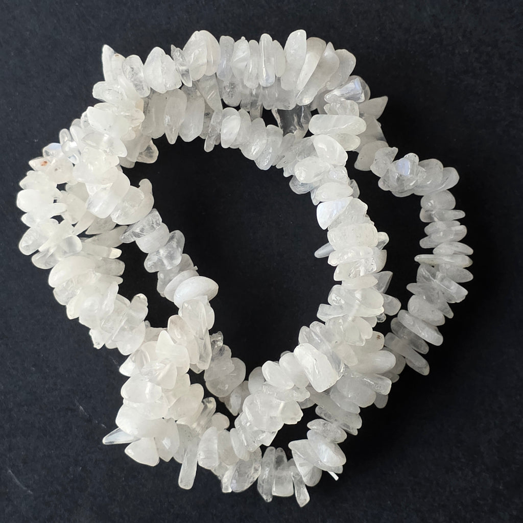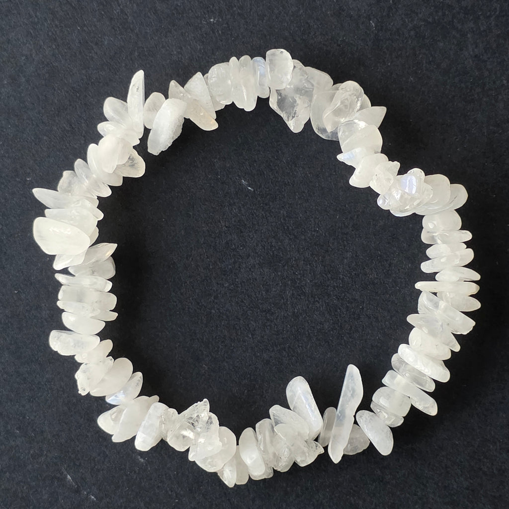 O brățară ce pare decupată din lumina unei dimineți calme, acolo unde albul nu este doar culoare, ci început, puritate și promisiune. Chipsurile de piatra lunii albă, delicate și imperfecte în mod intenționat, se așază într-un cerc armonios, ca un șir de lumini care se ating una pe alta într-un dans silențios.