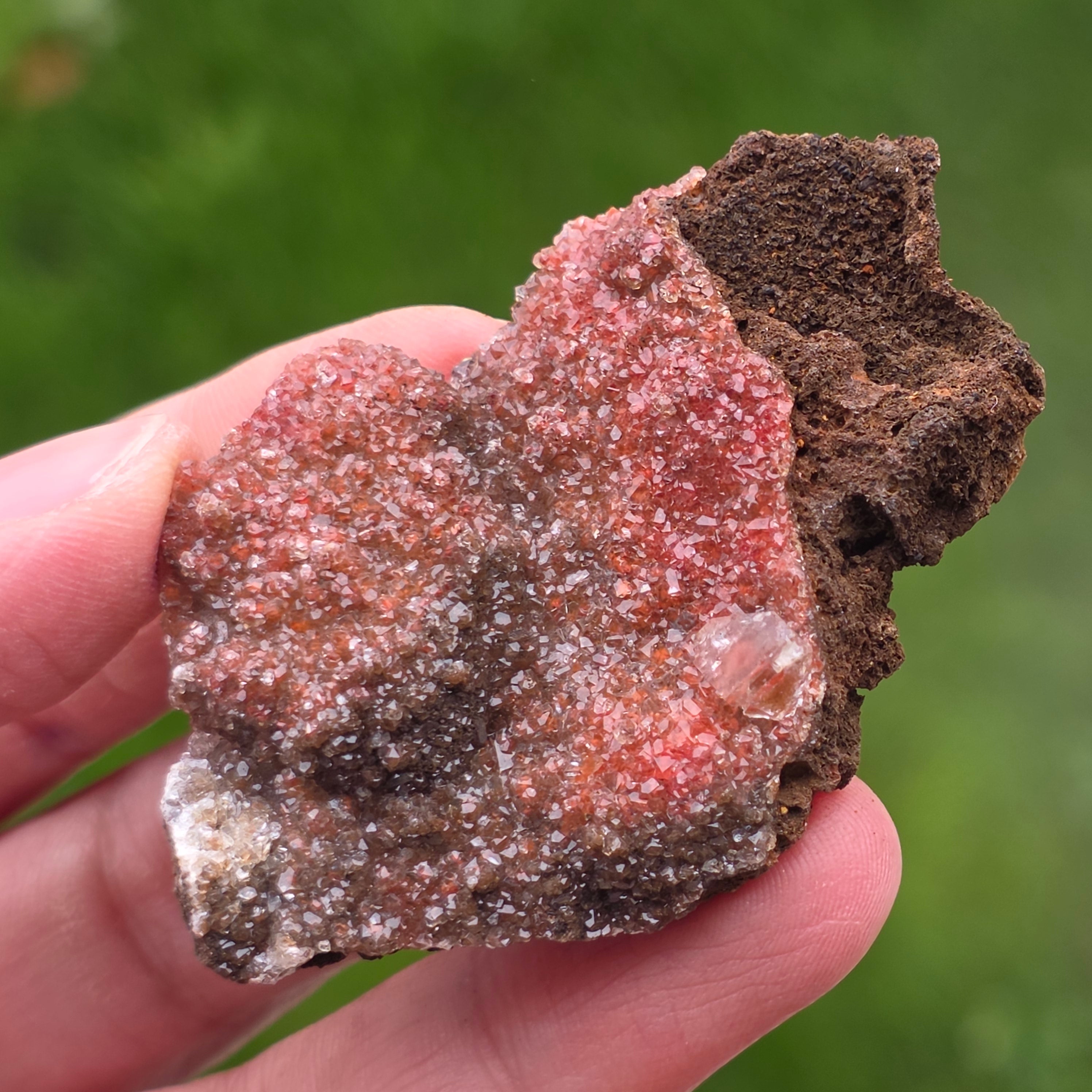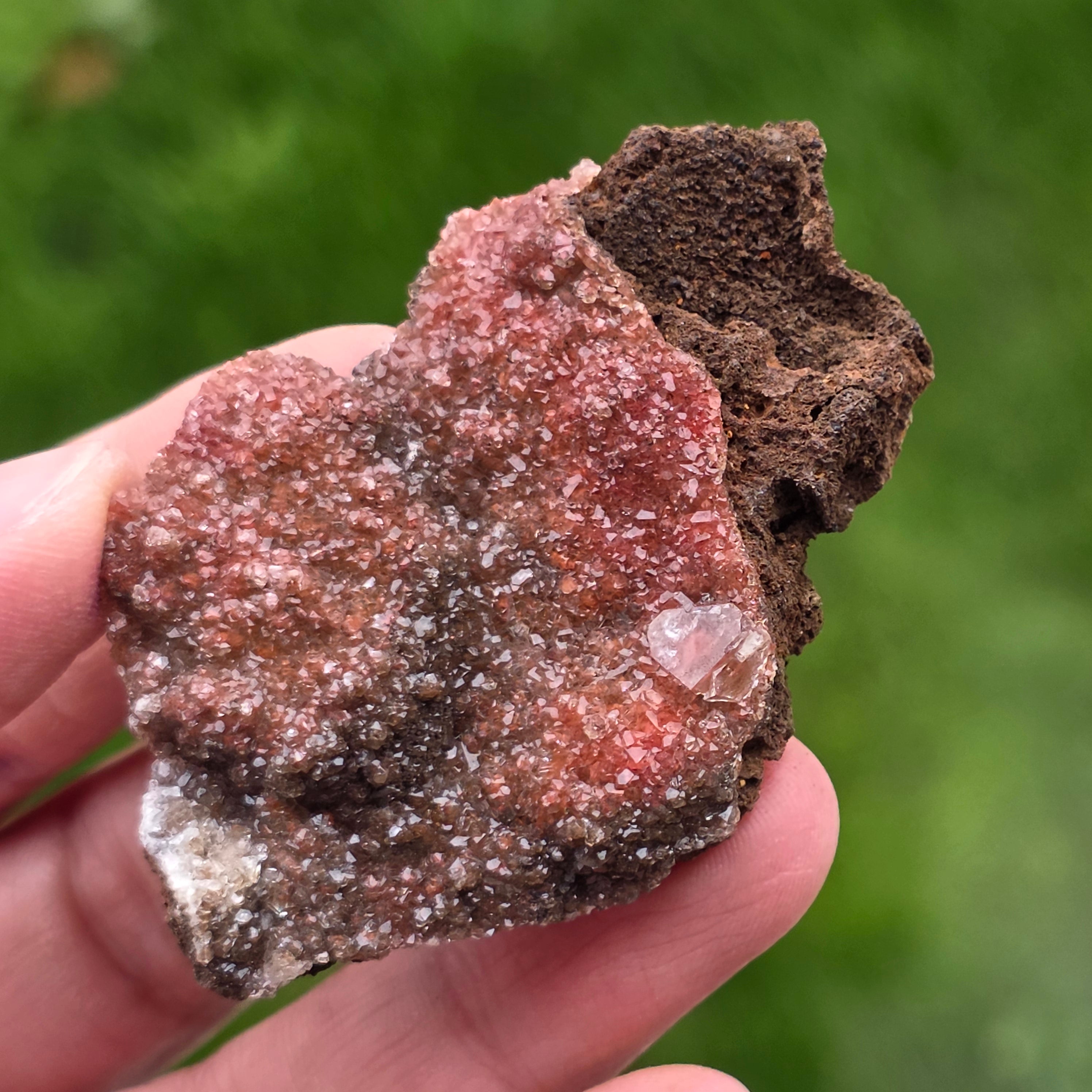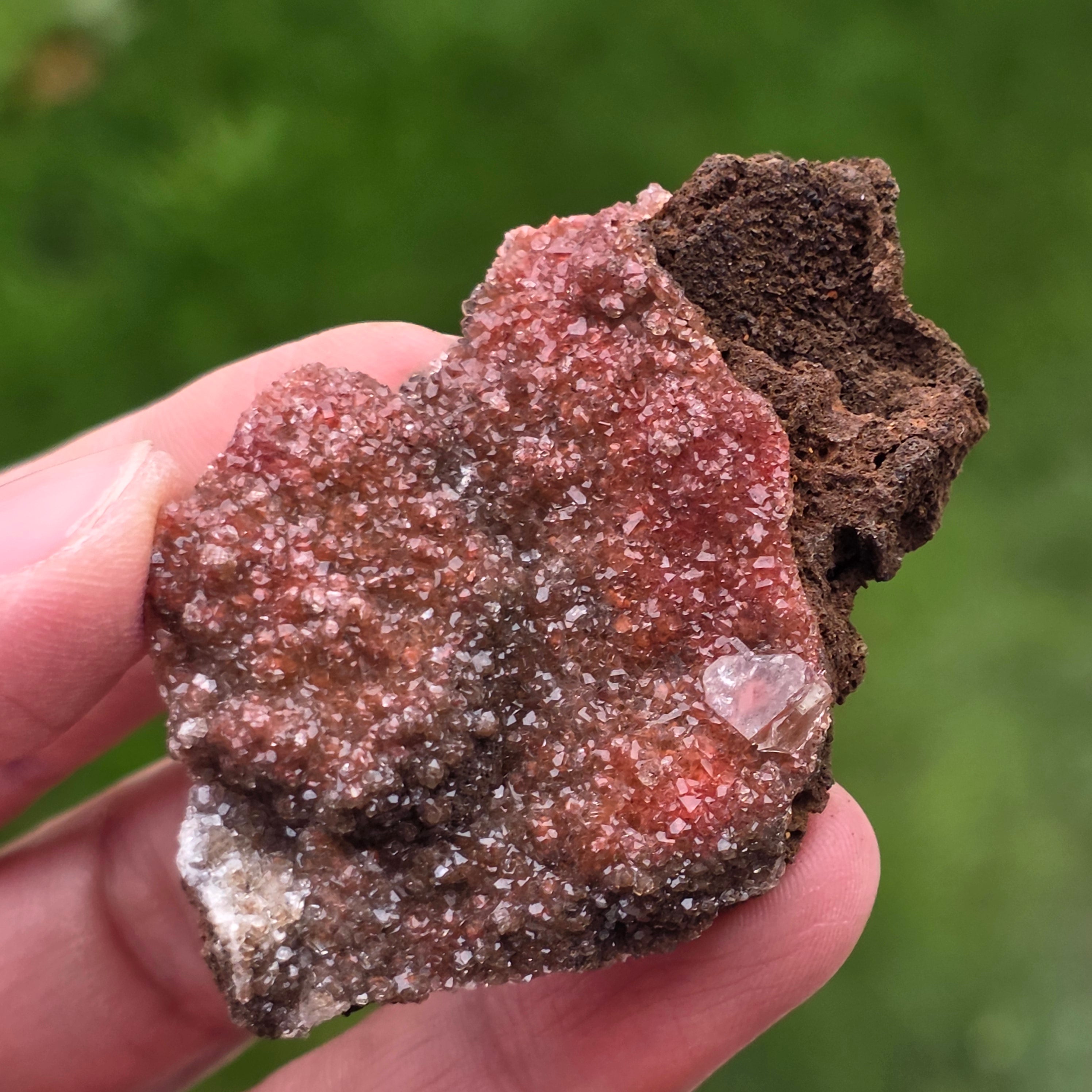 Cristalele de calcit prezintă habitul specific numit „diamond calcite”, caracterizat prin terminații bine definite și fețe strălucitoare, care reflectă lumina într-un mod subtil, dar expresiv. Dispunerea compactă a cristalelor creează o suprafață sclipitoare, cu textură bogată, fiecare piesă fiind diferită ca formă, intensitate a culorii și distribuție a cristalelor.