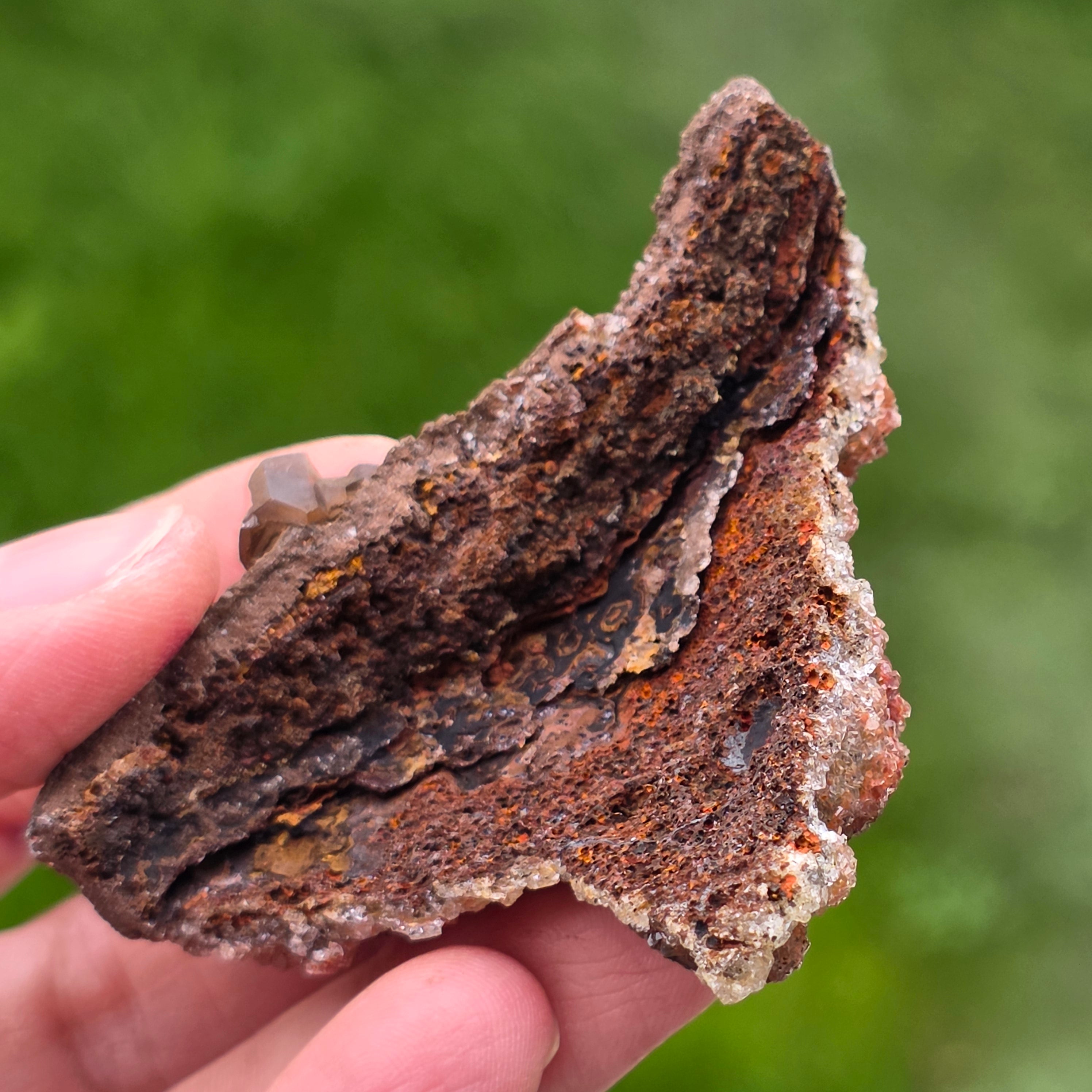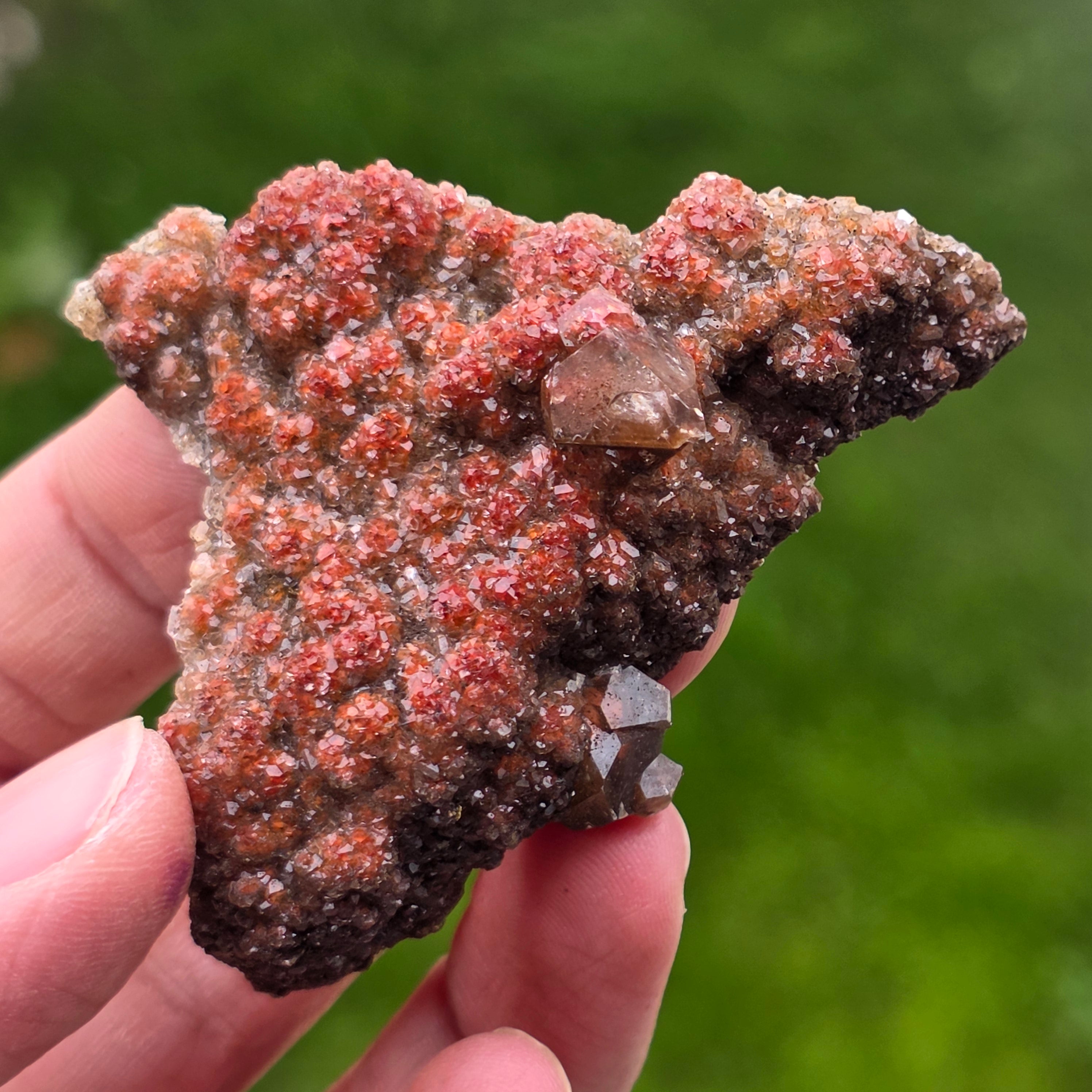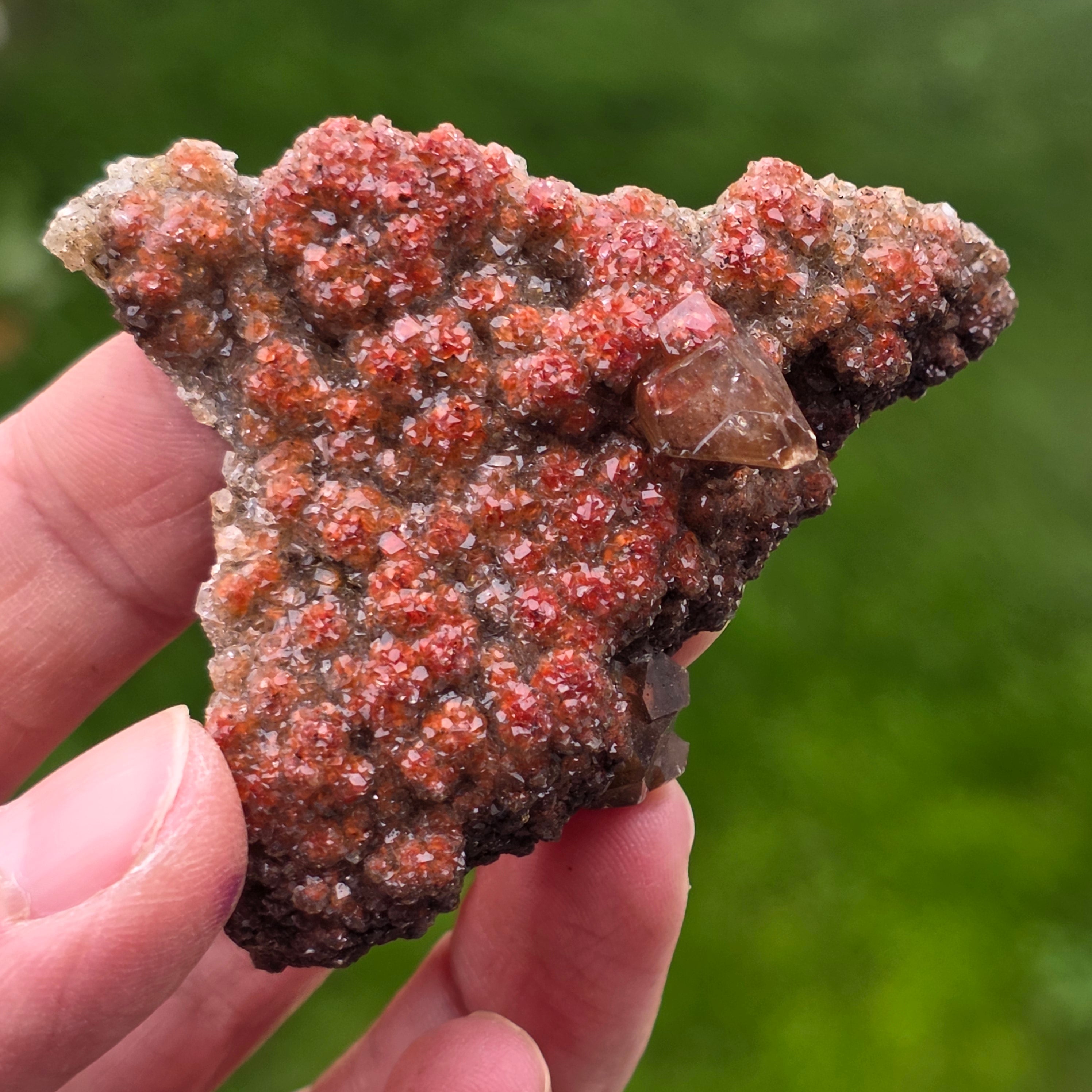 Cristalele de calcit prezintă habitul specific numit „diamond calcite”, caracterizat prin terminații bine definite și fețe strălucitoare, care reflectă lumina într-un mod subtil, dar expresiv. Dispunerea compactă a cristalelor creează o suprafață sclipitoare, cu textură bogată, fiecare piesă fiind diferită ca formă, intensitate a culorii și distribuție a cristalelor.