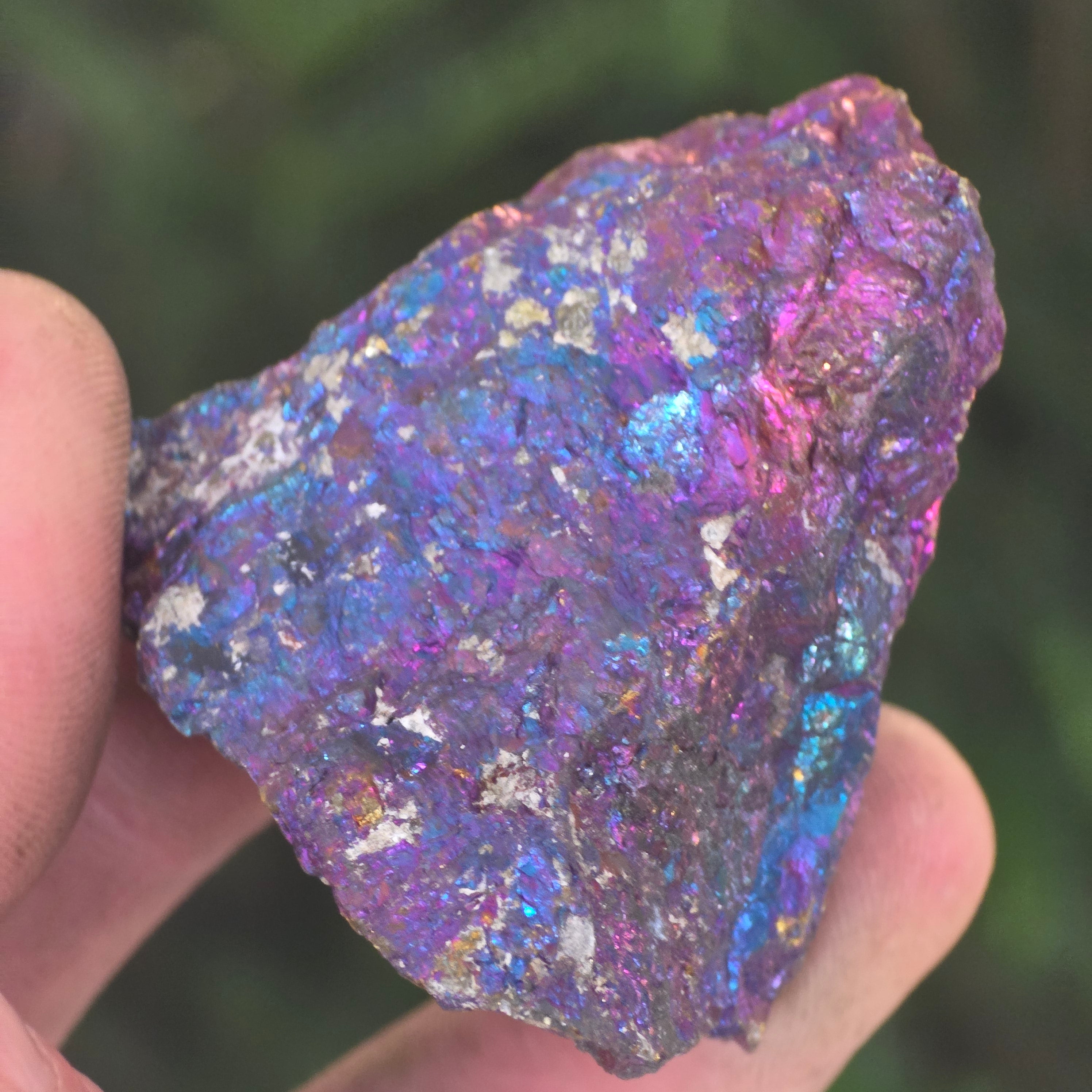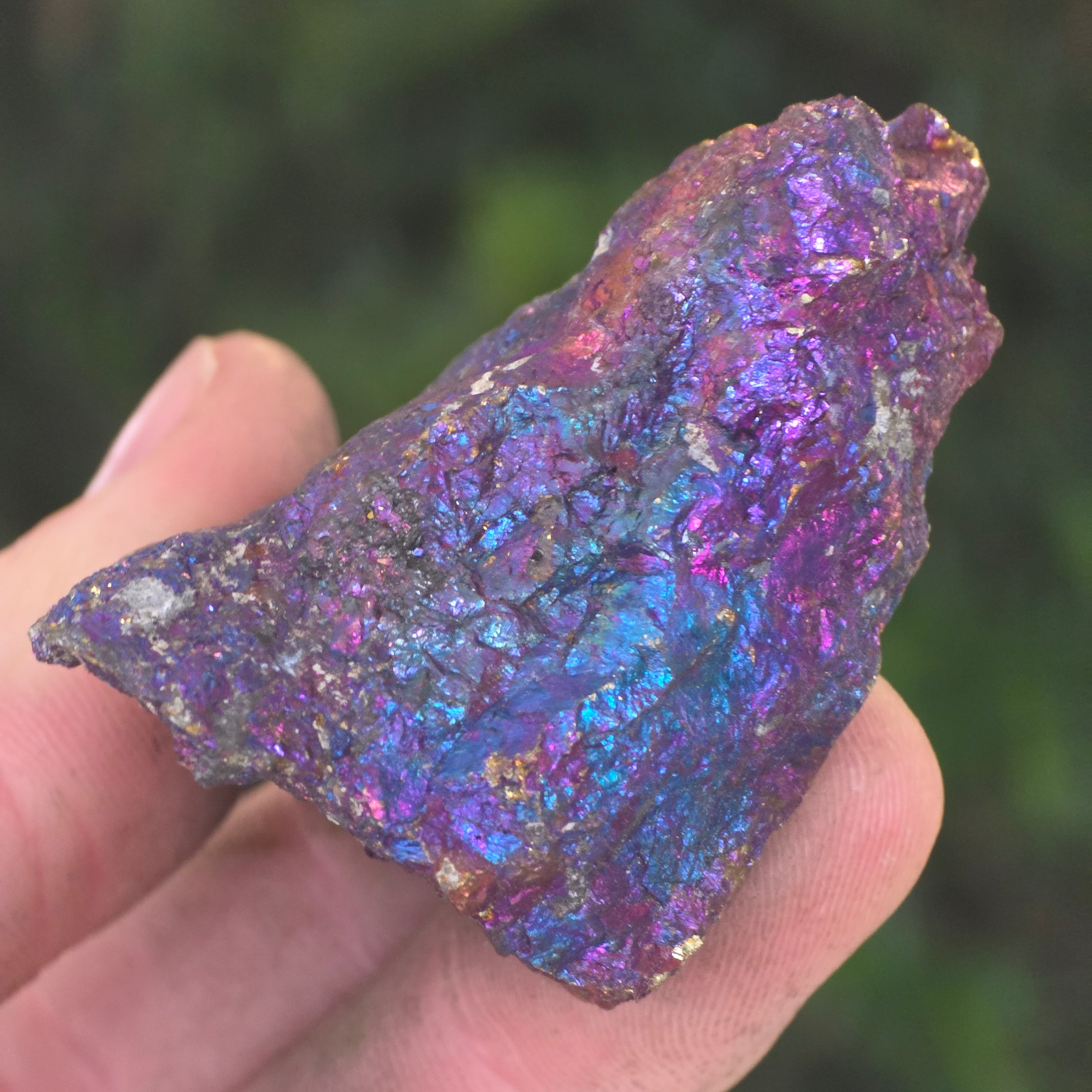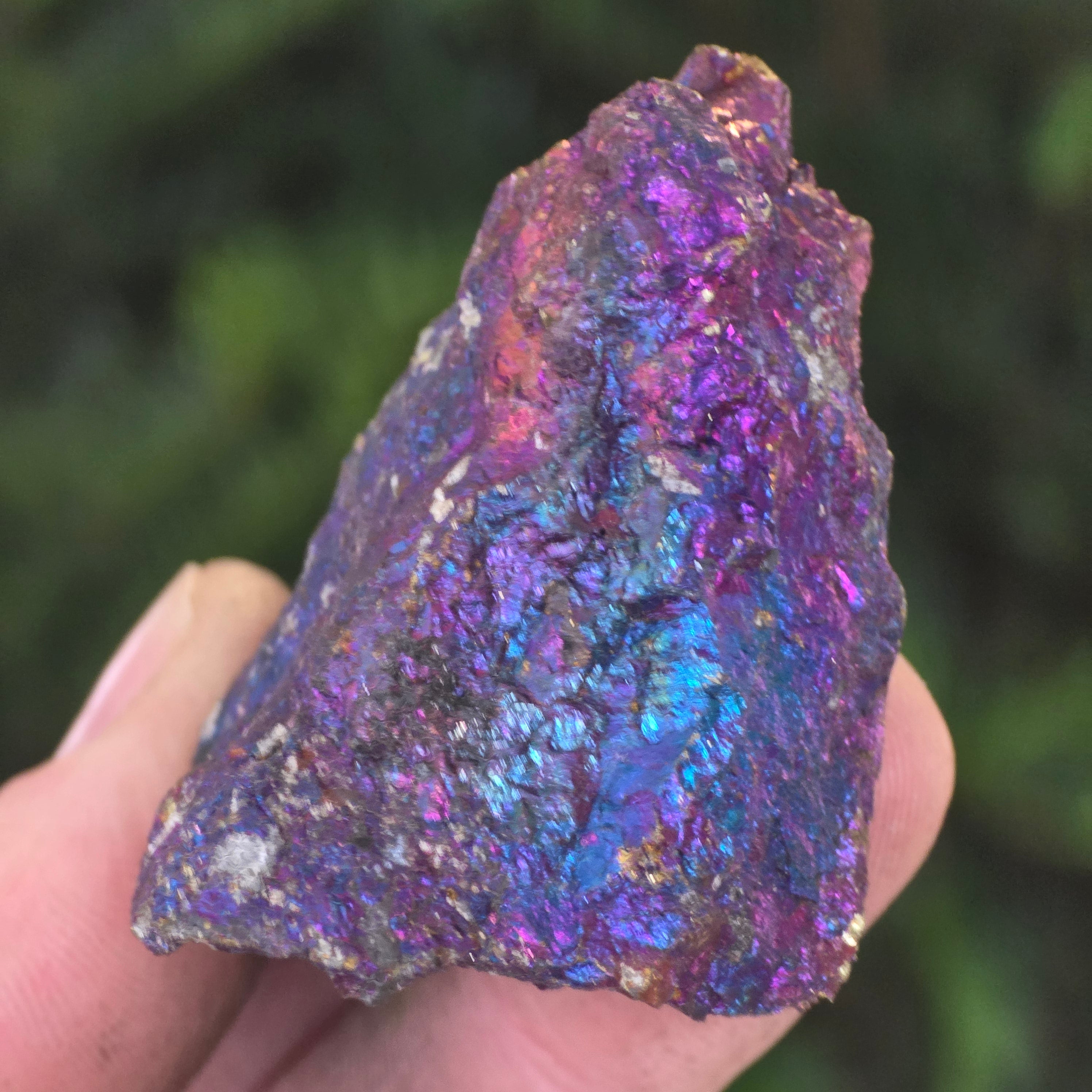 Calcopirita albastră și cea mov sunt asociate cu creșterea spirituală, intuiția și conectarea cu energiile superioare. Se crede că ajută la calmarea minții și stimularea creativității. Nuanțele sale irizate sunt legate simbolic de echilibru și armonie.