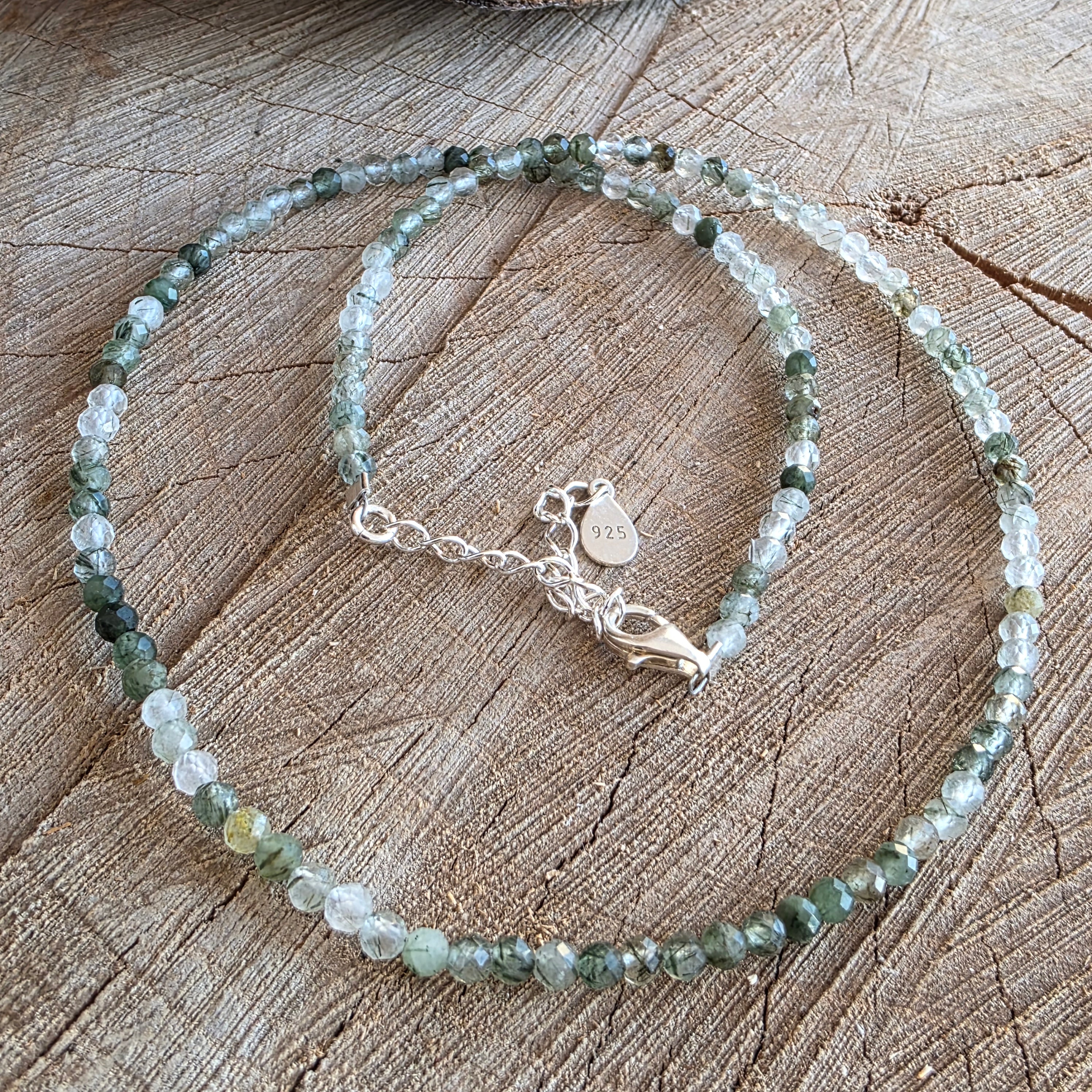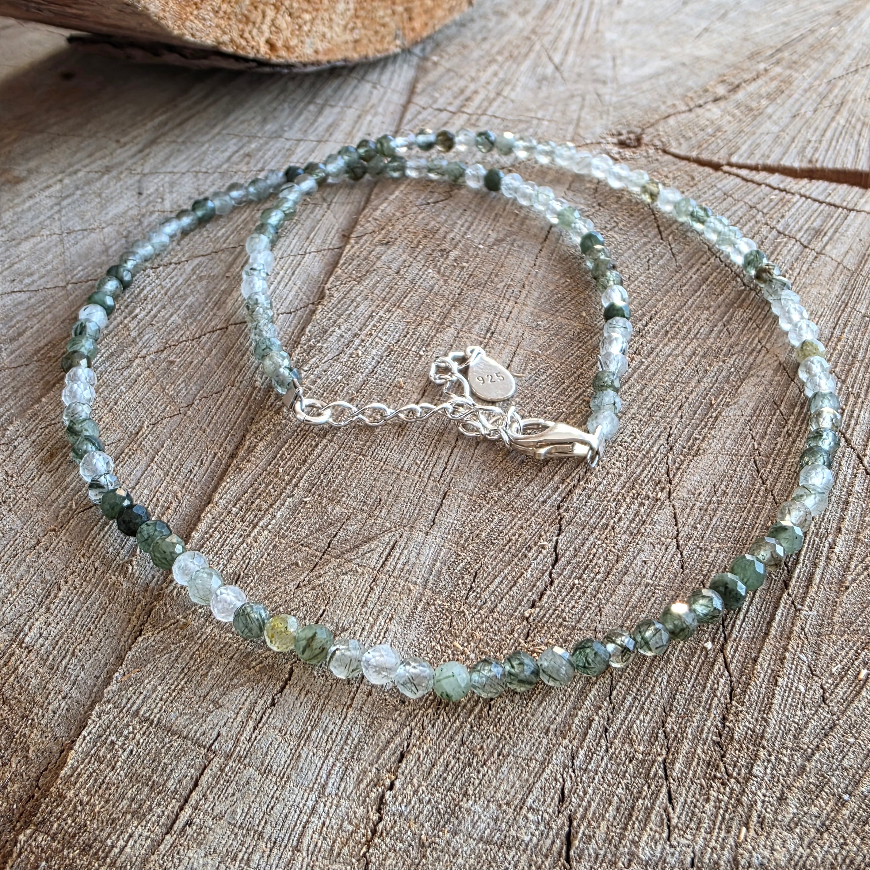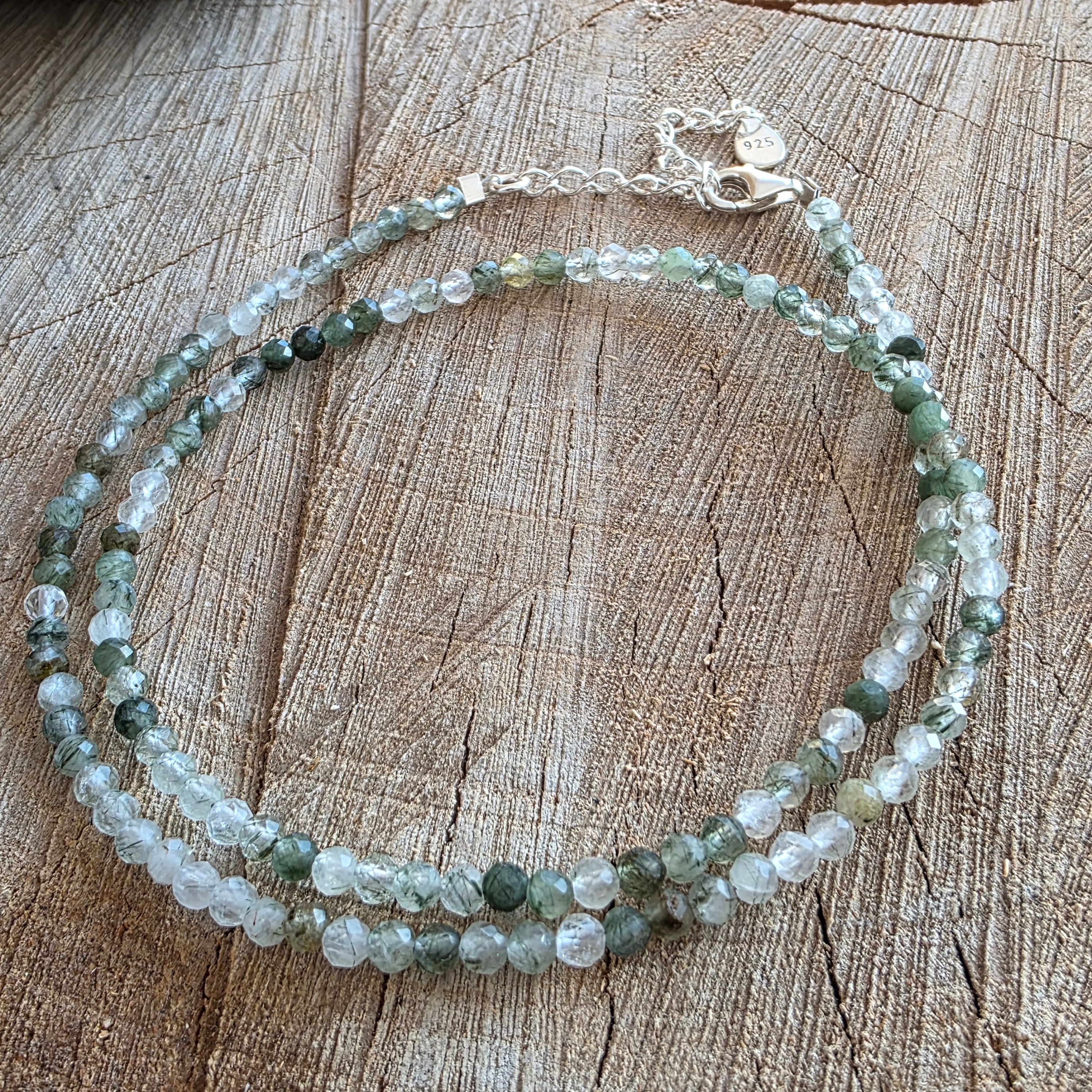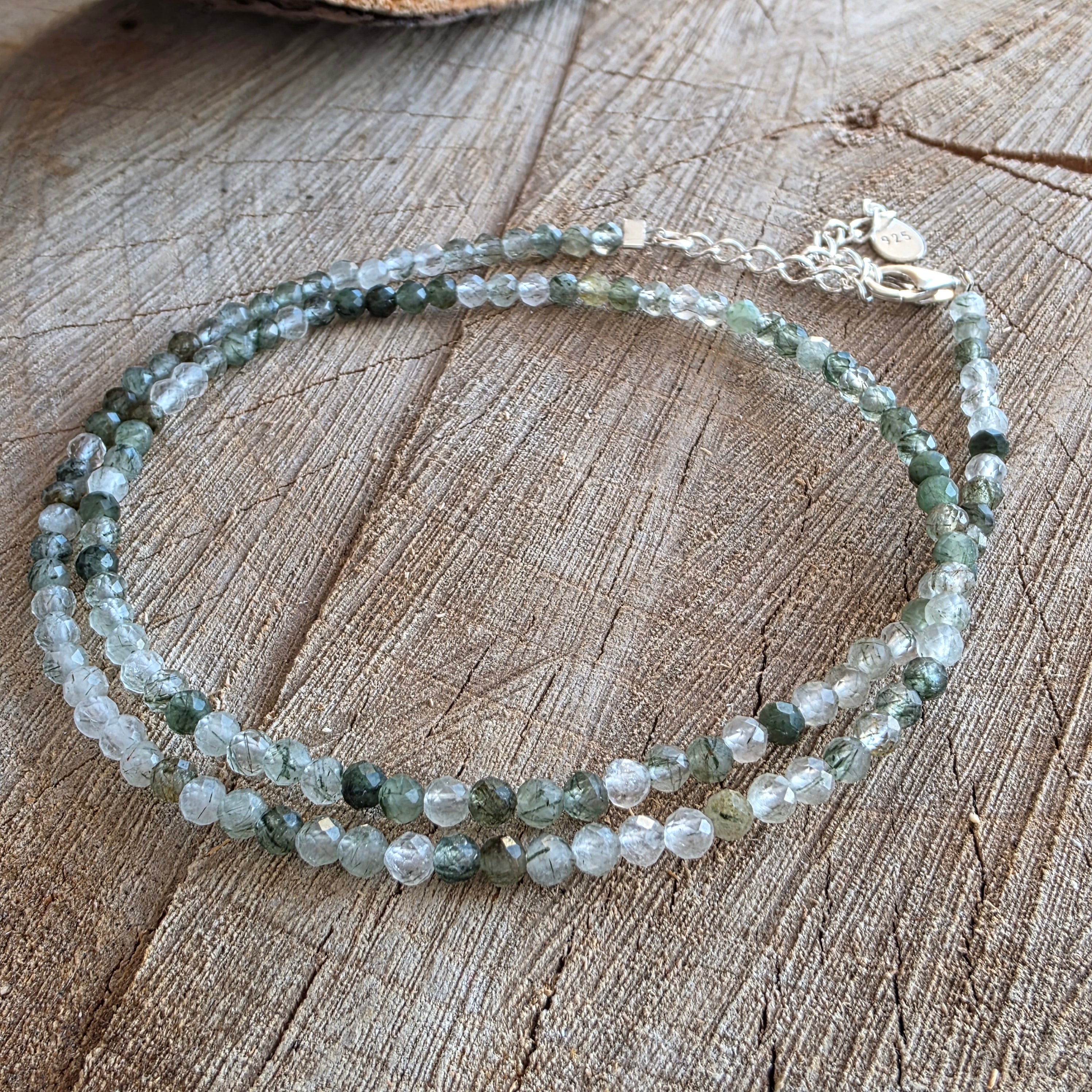 Wątek składa się z sfer fasetowanych przez 3 mm, każda koralika sama w sobie jest małym światem: przezroczyste kryształy skrzyżowane przez drobne zielone wtrącenia, takie jak przewody mięśniowe lub korzenie zawieszone w czystej wodzie. Gra między klarownością a gęstością tworzy subtelną, organiczną teksturę wizualną, w której zielony nie jest kolor, ale pulsacja.