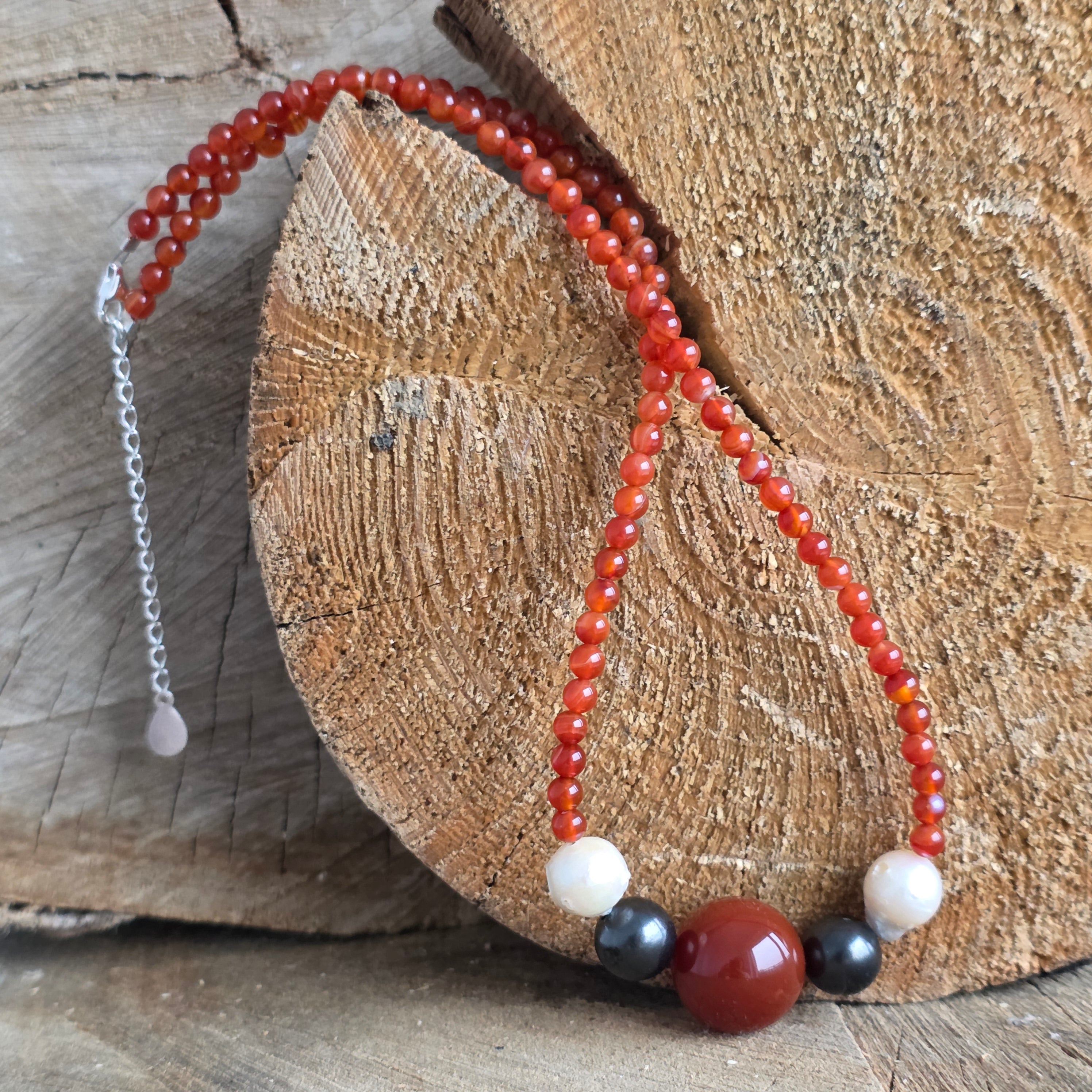 Wykonany z naturalnego mięsa 4 mm, naszyjnik robi wrażenie na ciepłych półprzezroczystym pomarańczowym tonach, symbolu energii witalnej i pewności siebie. Projekt uzupełnia małe czarne wkładki shungit - kamień rozpoznany ze swoich właściwości ochronnych - i dwie białe naturalne perły, które dodają nutę udoskonalania i czystości.