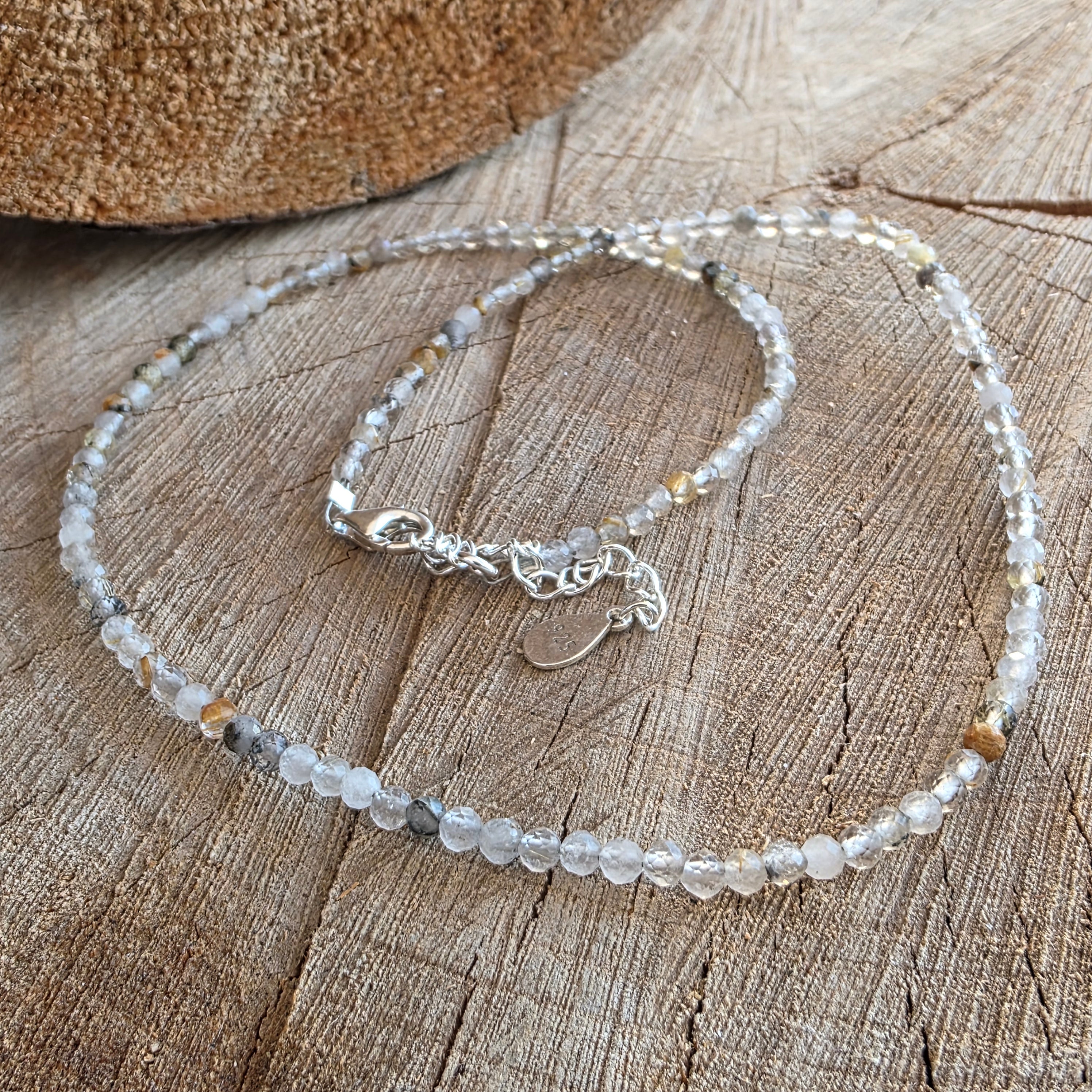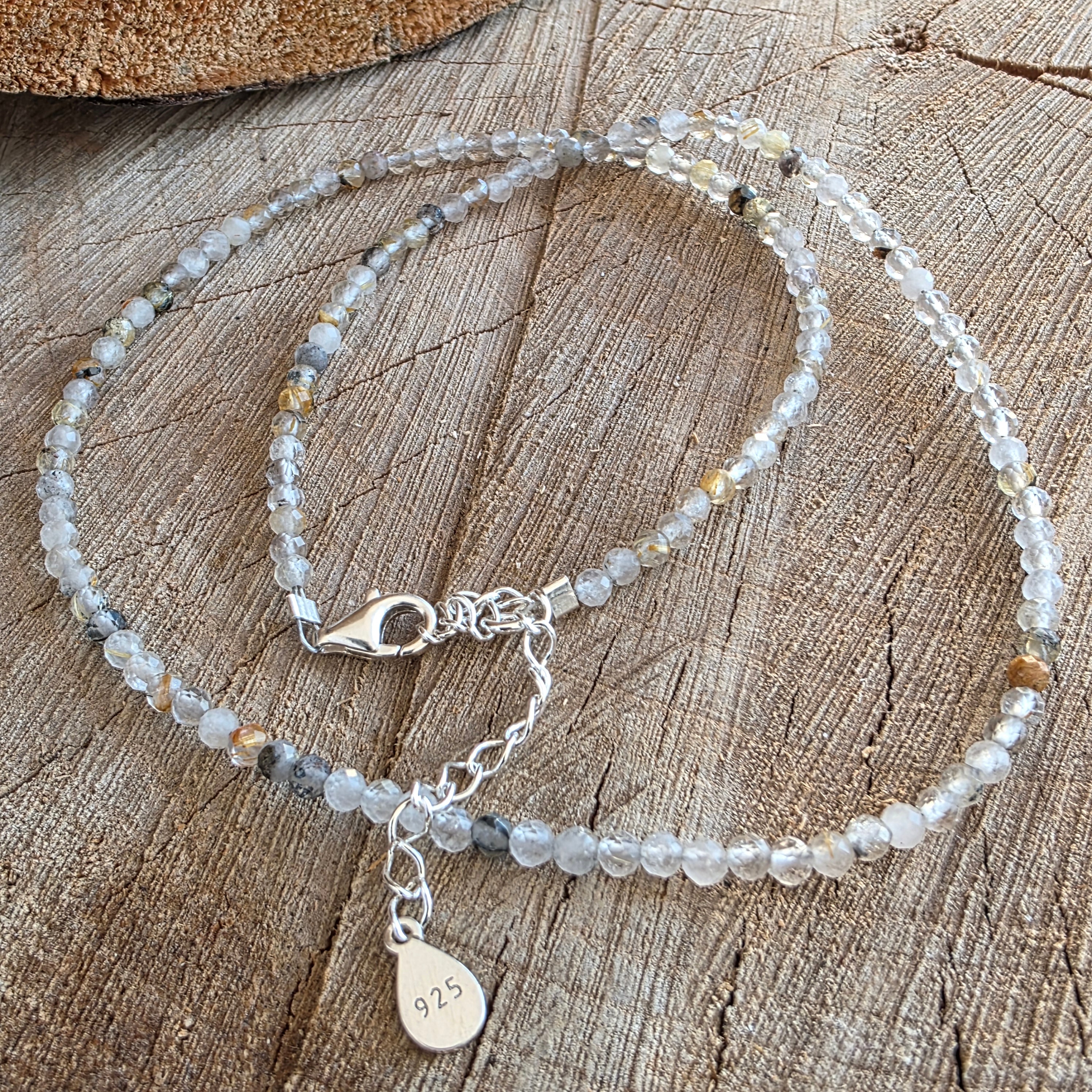 Wątek składa się z koralików wykonanych przez 3 mm, każdy z nich utrzymuje cały świat w środku. Ta rzadka odmiana kwarcowa zawiera drobne igły rutylowe - złote przędze lub miedź miedzi, takie jak włókna słoneczne przymocowane do kryształu. Jego dyskretne refleksy łapią światło pod subtelnymi kątami, powodując wrażenie żywego, ale spokojnego ruchu.