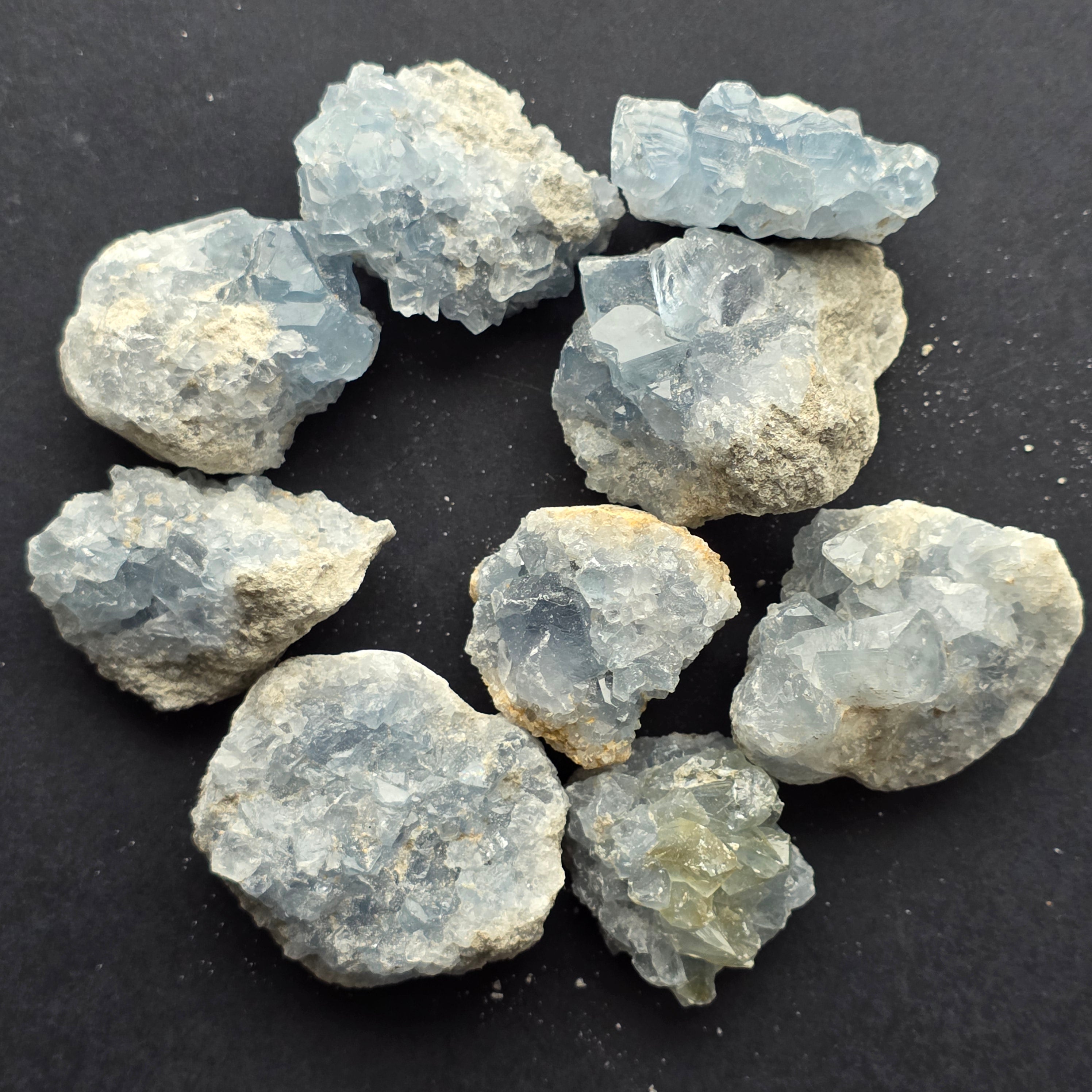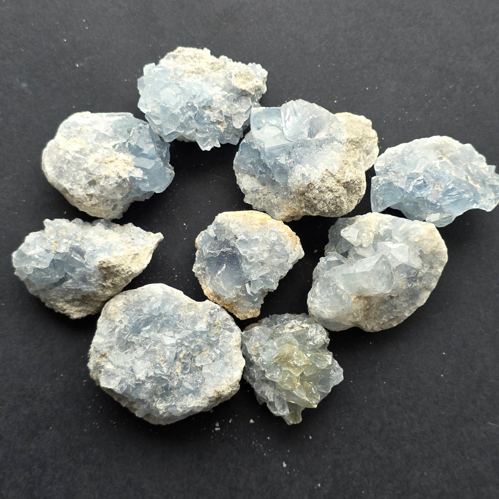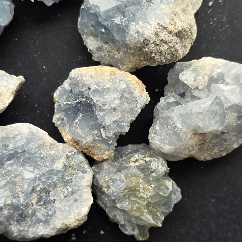 Celestyt to kamień półszlachetny w kolorze niebieskim lub bezbarwnym, zbudowany z siarczanu strontu. Posiada właściwości uspokajające i relaksujące, często stosowany w medytacji i praktykach duchowych w celu promowania wewnętrznego spokoju i klarowności umysłu. Celestyt związany jest z czakrą gardła i może wspomagać jasną komunikację oraz wyrażanie uczuć. Wierzy się również, że wzmacnia kreatywność, intuicję i zdolności psychiczne.