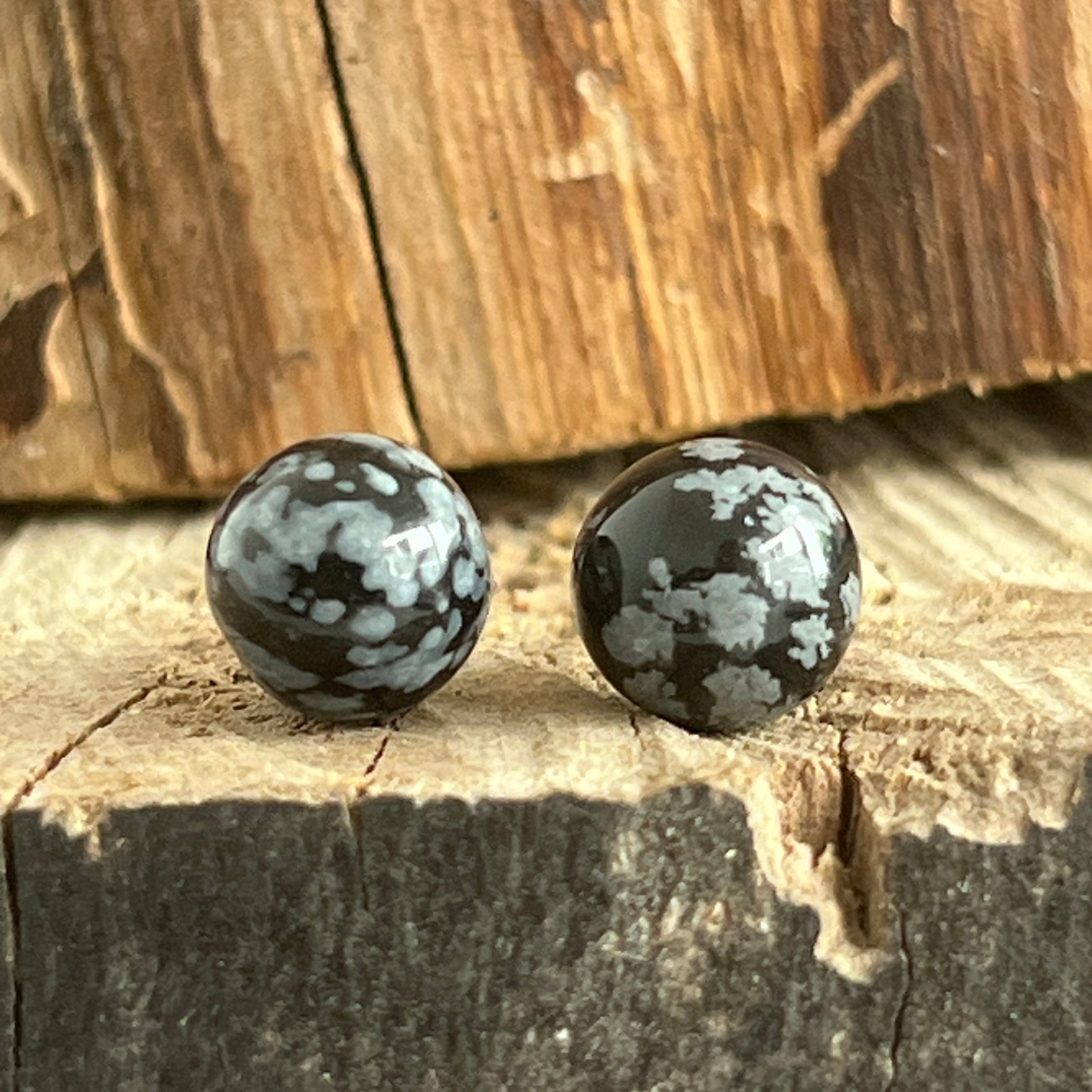Acești cercei stud din obsidian fulgi de zăpadă sunt o invitație la liniște și centrare. Nuanțele lor contrastante, negru profund cu pete delicate albe, amintesc de cerul de iarnă presărat cu primele ninsori.