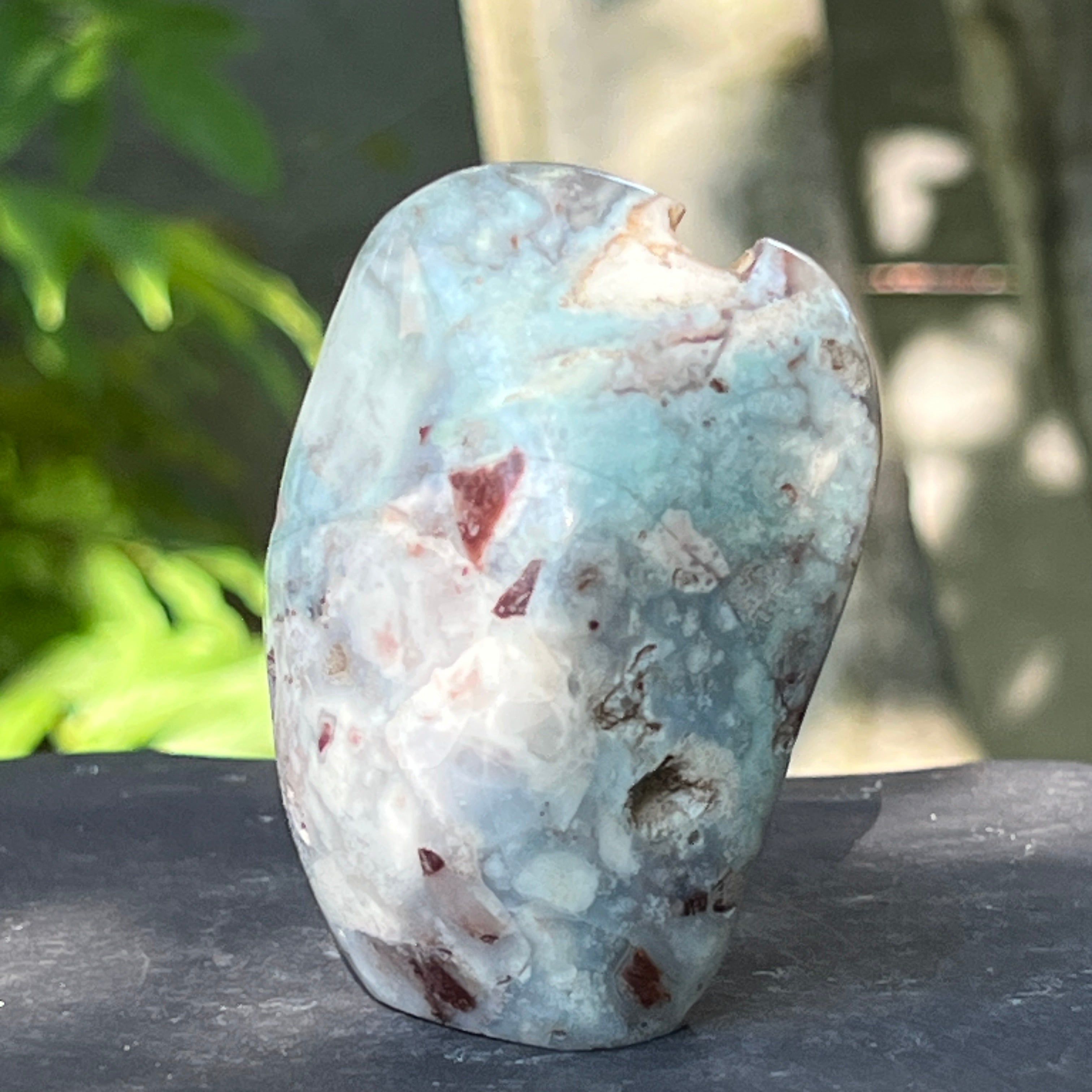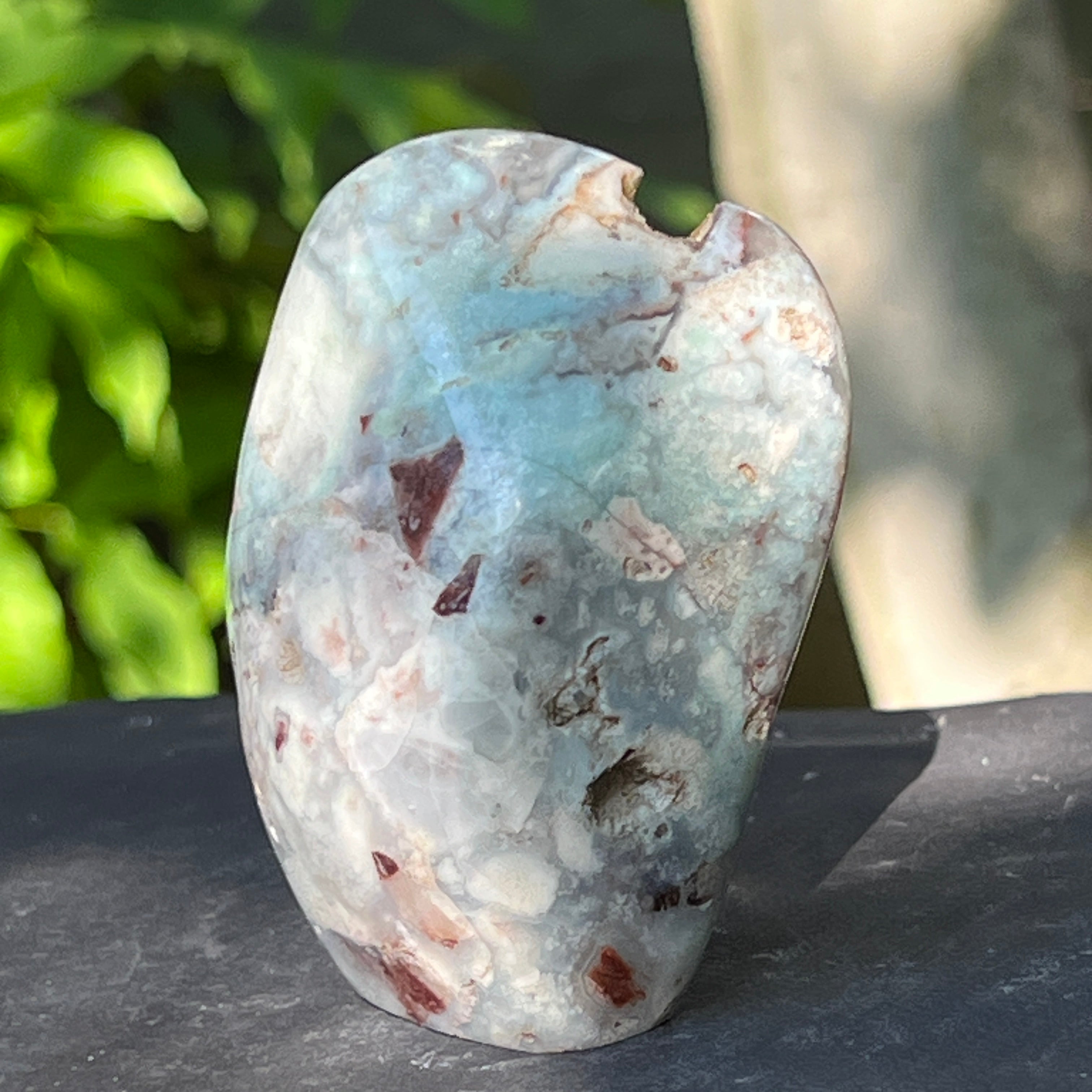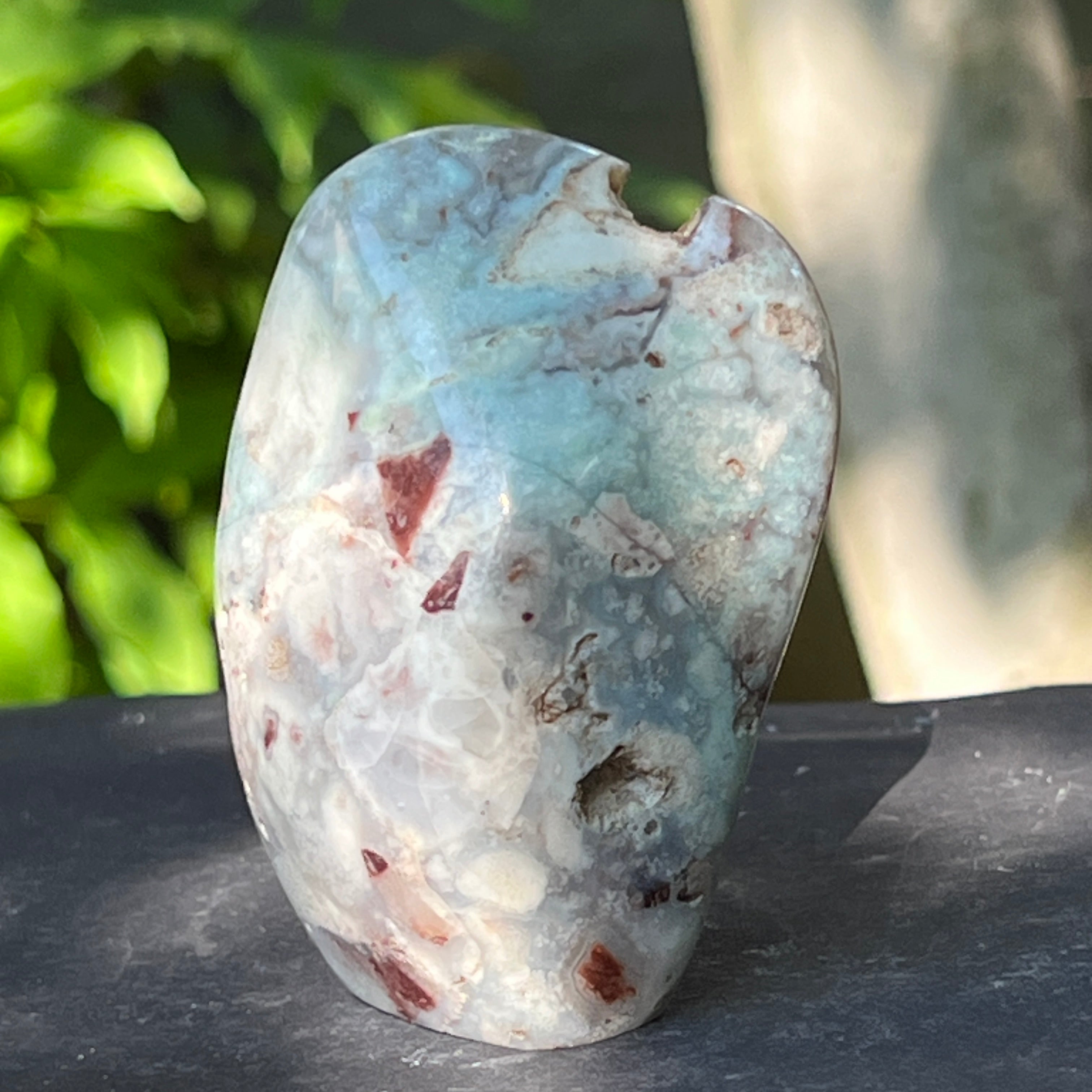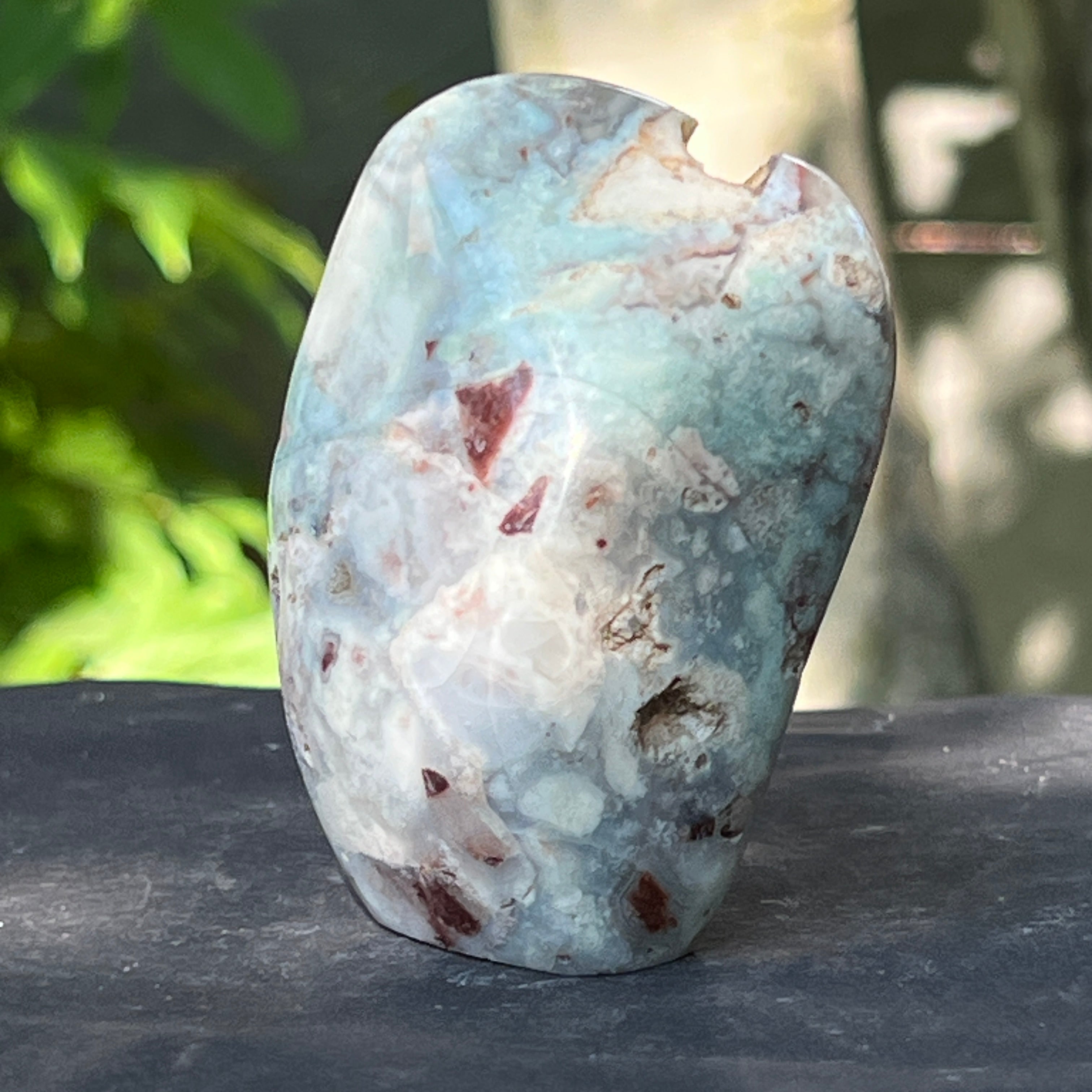 Jego tekstura jest żywa – z żyłkami mlecznego chalcedonu, dyskretnymi uskokami kwarcu i rdzawymi plamami matrycy – wszystko to świadczy o powolnym powstawaniu w złożonym środowisku geologicznym pełnym napięć.