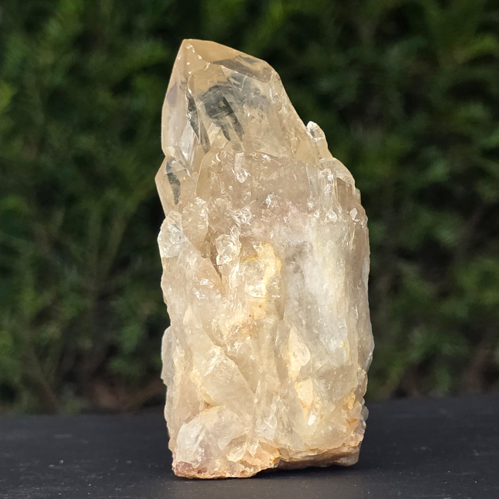 În adâncurile continentului african, acolo unde pământul freamătă de viață primordială, a luat naștere acest citrin – o piatră rară și misterioasă, extrasă din solurile bogate ale Congo-ului. Cu nuanțe calde, ce pendulează între galben-auriu și umbre discrete de fum, acest specimen natural poartă amprenta timpului și a transformărilor lente ale Pământului.