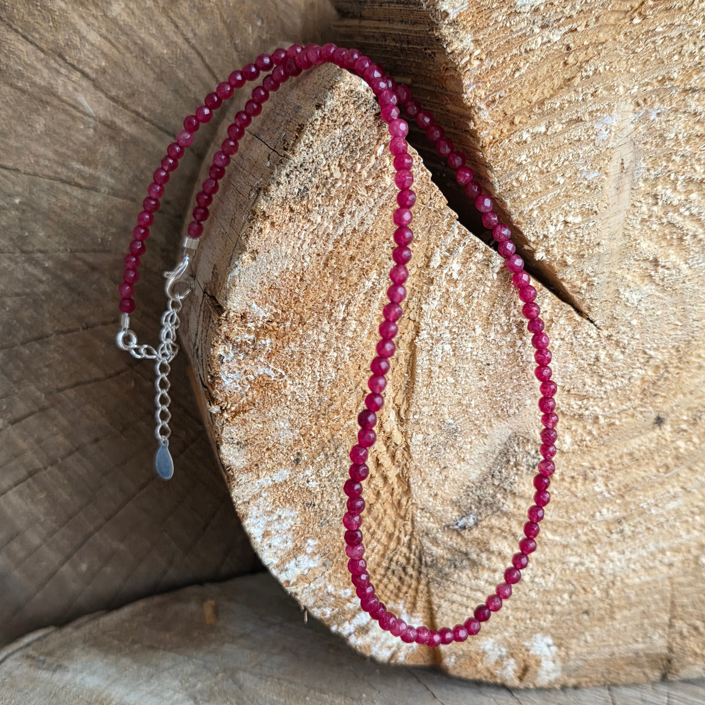 Firul este compus integral din sfere fațetate de agat burgundy de 3 mm, mărgele închise la culoare, cu reflexe subtile între rubiniu stins, vișiniu matur și umbre de vin roșu așezat. Fațetele fine prind lumina discret, ca un oftat abia ghicit, iar culoarea, adâncă și plină, are o gravitate care invită la liniște și prezență.