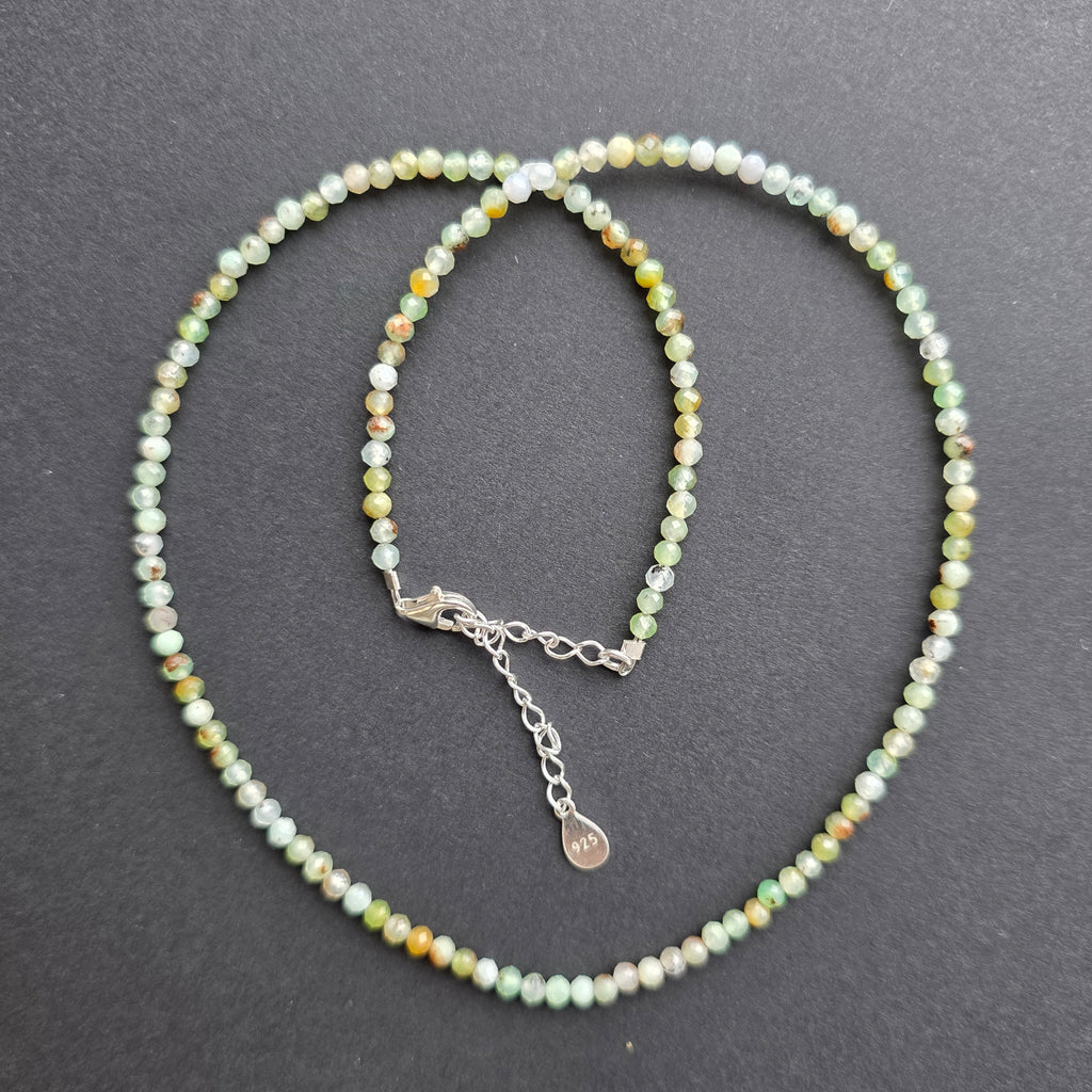Un colier ce poartă lumina verii și tandrețea unui început nou. Crisoprazul, cu verdele său luminos și translucid, este o piatră a inimii deschise — un simbol al iubirii pure, al compasiunii și al reînnoirii sufletului. Mărgelele fațetate de 3 mm captează fiecare rază de lumină, transformând colierul într-o bijuterie vie, radiantă și delicată.