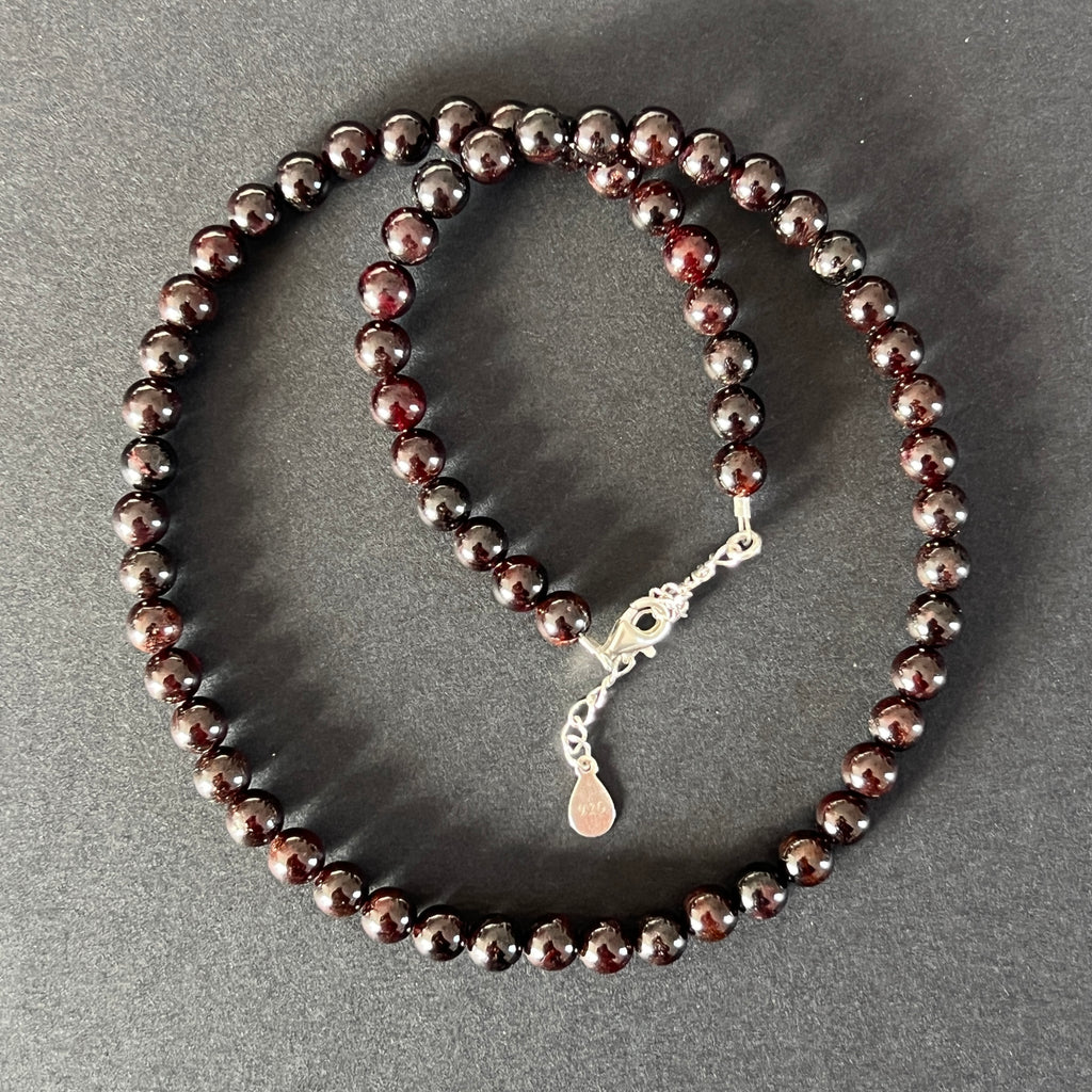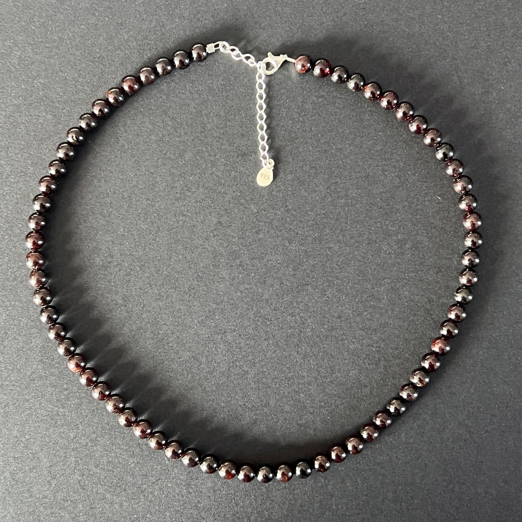 Un colier ce surprinde esența vitalității și a eleganței naturale. Granatul natural de 6 mm, cu nuanțele sale roșu-închis, poartă o strălucire discretă, ca o inimă care bate tăcut în adâncul pământului. Simplitatea sferelor netede oferă un aspect clasic și atemporal, punând în valoare frumusețea autentică a pietrei.
