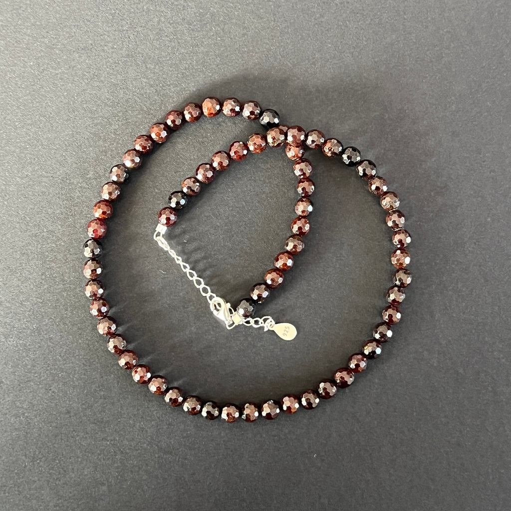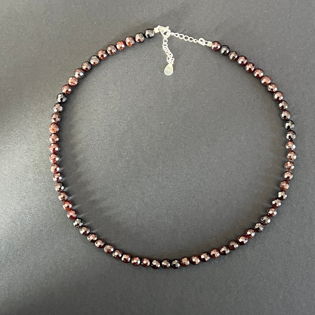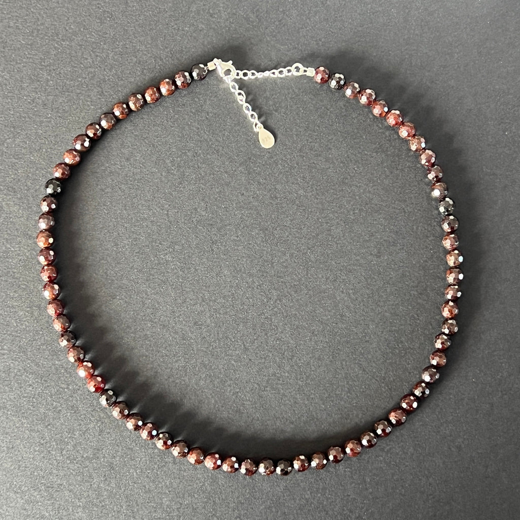 Un colier care emană intensitate și noblețe, asemenea unei scântei ascunse în adâncurile pământului. Granatul natural fațetat de 6 mm aduce la viață reflexe roșu-burgund care dansează în lumină, oferind bijuteriei o eleganță clasică și seducătoare.
