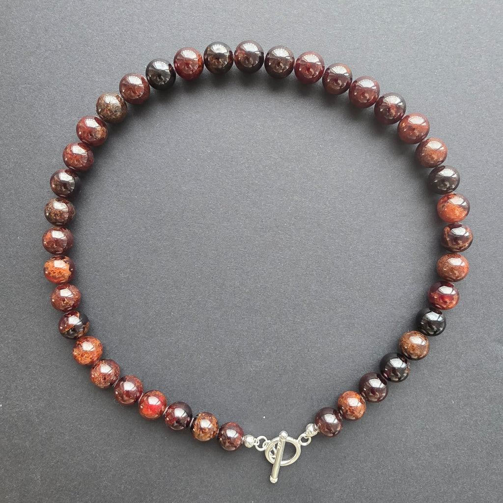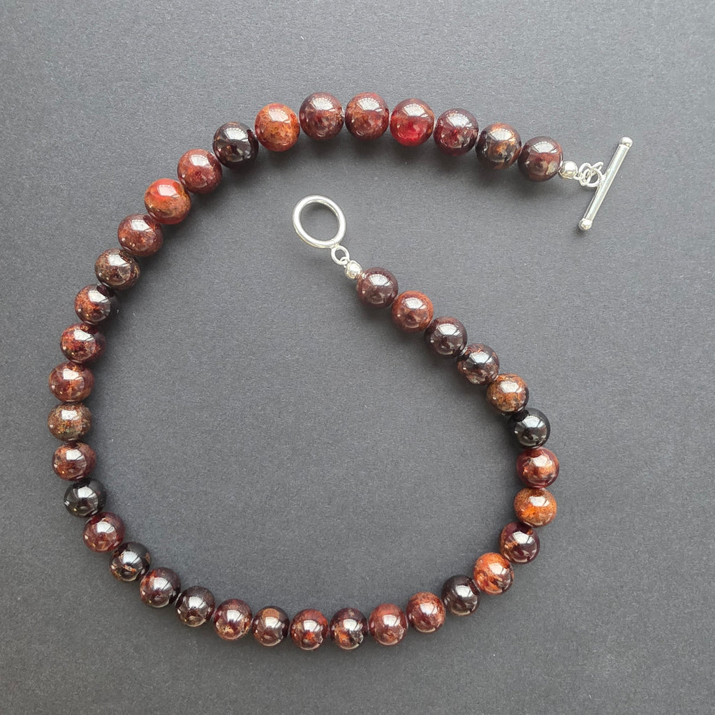Un colier care poartă focul pământului și eleganța nobilă a profunzimii. Granatul natural, cu tonurile sale roșu-închis și reflexele subtile de vin rubiniu, evocă pasiunea vie, energia vitală și forța interioară. Fiecare sferă de 10 mm este ca o inimă minerală, plină de viață și lumină tainică.