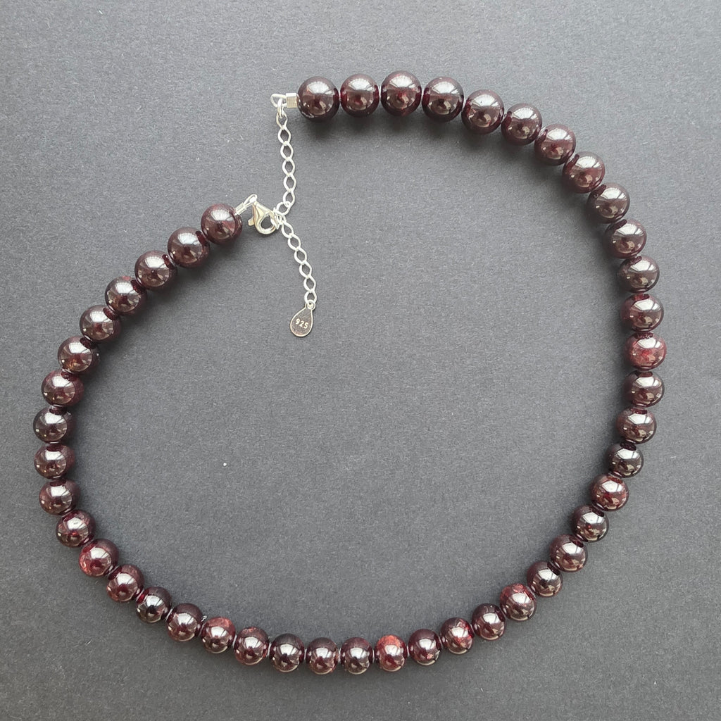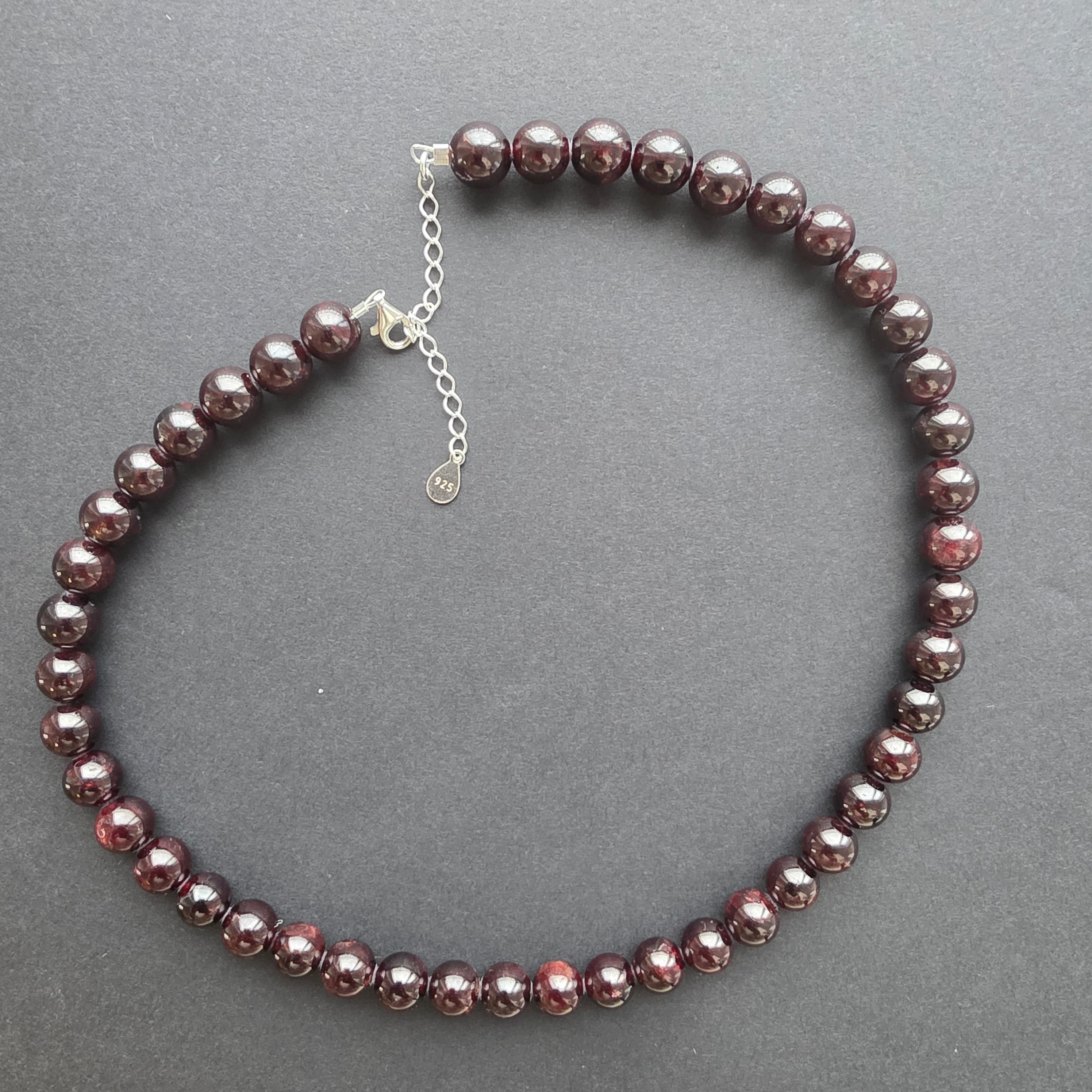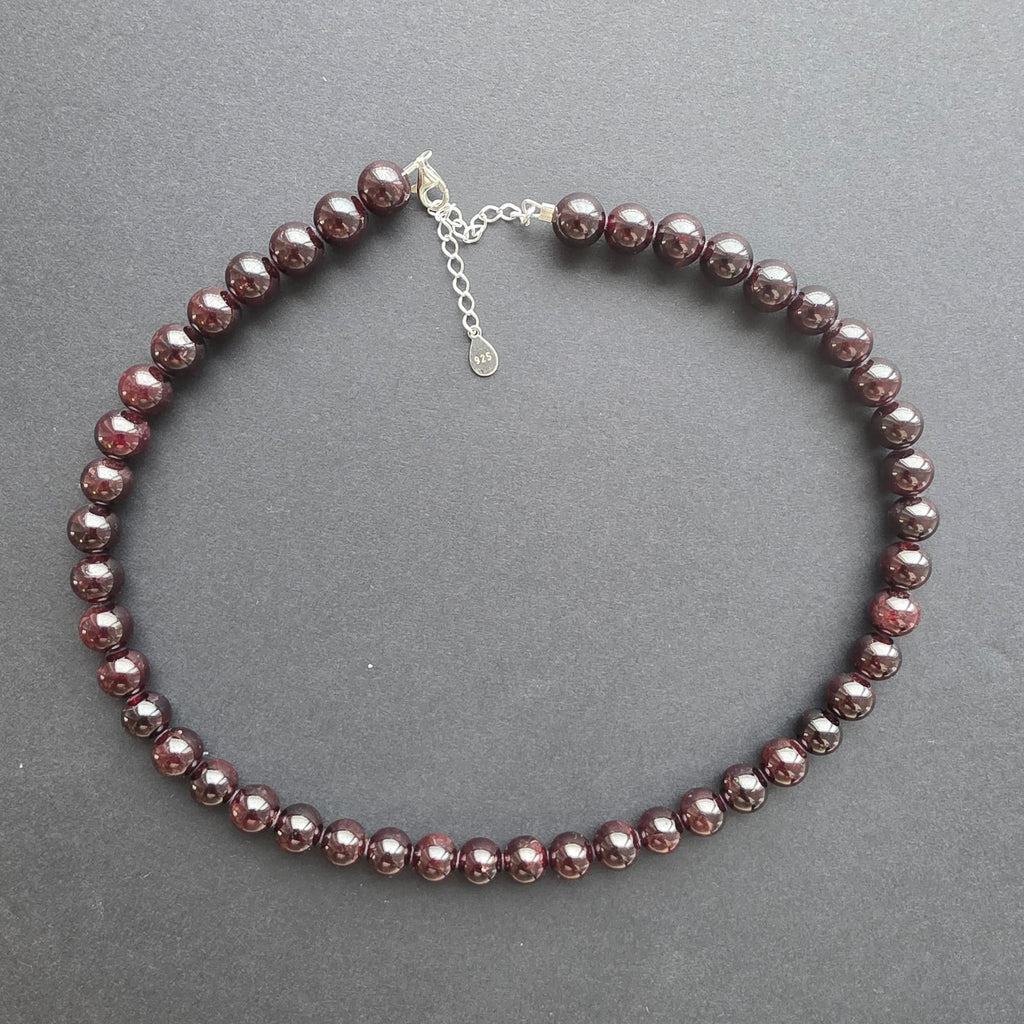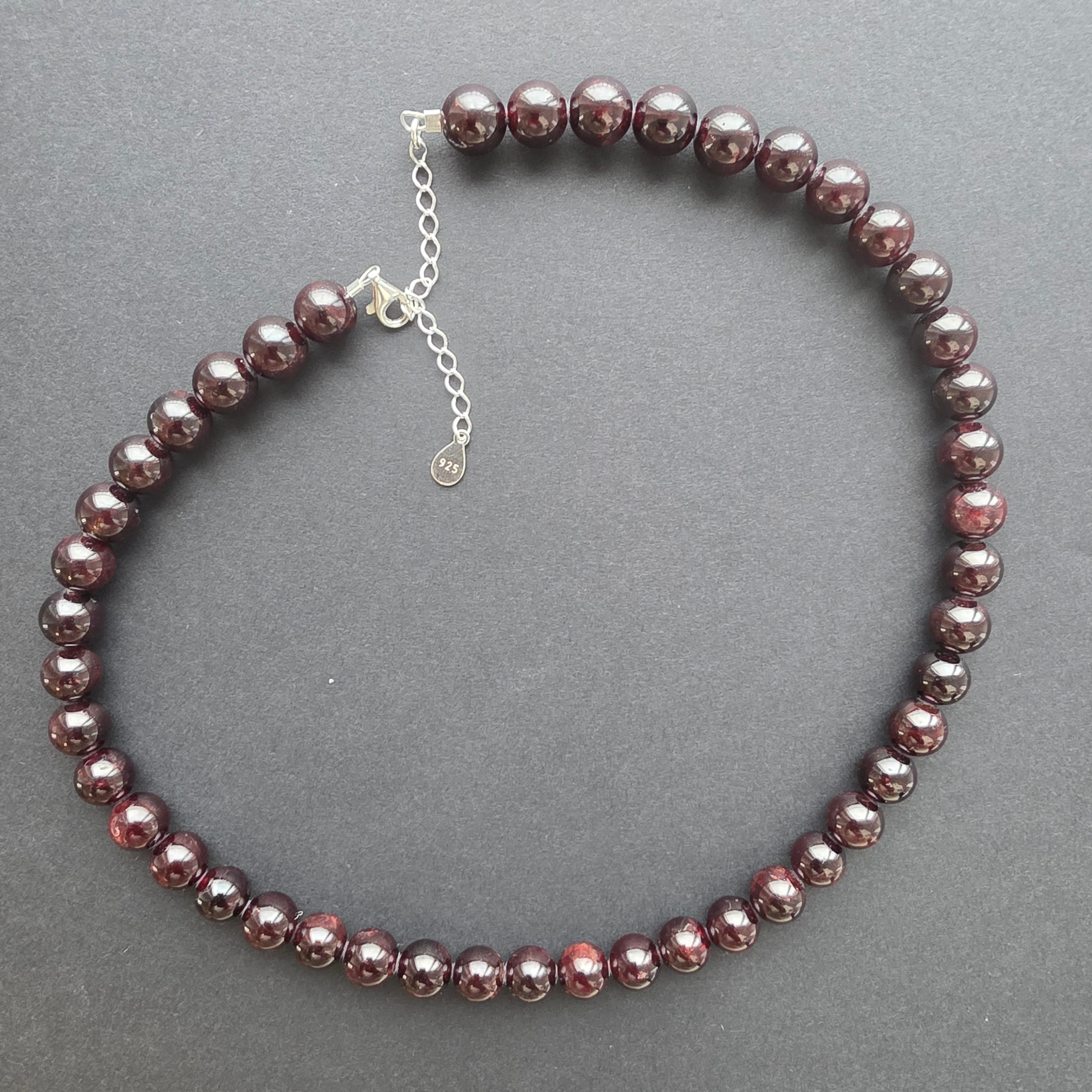 Un colier care pulsează de viață și eleganță, asemenea inimii pământului. Granatul natural de 9 mm, cu luciul său profund și culorile roșu închis, reflectă intensitatea emoțiilor și puterea iubirii mature. Este o piatră a pasiunii calme, a curajului interior și a stabilității sufletului care a învățat să strălucească fără a arde.