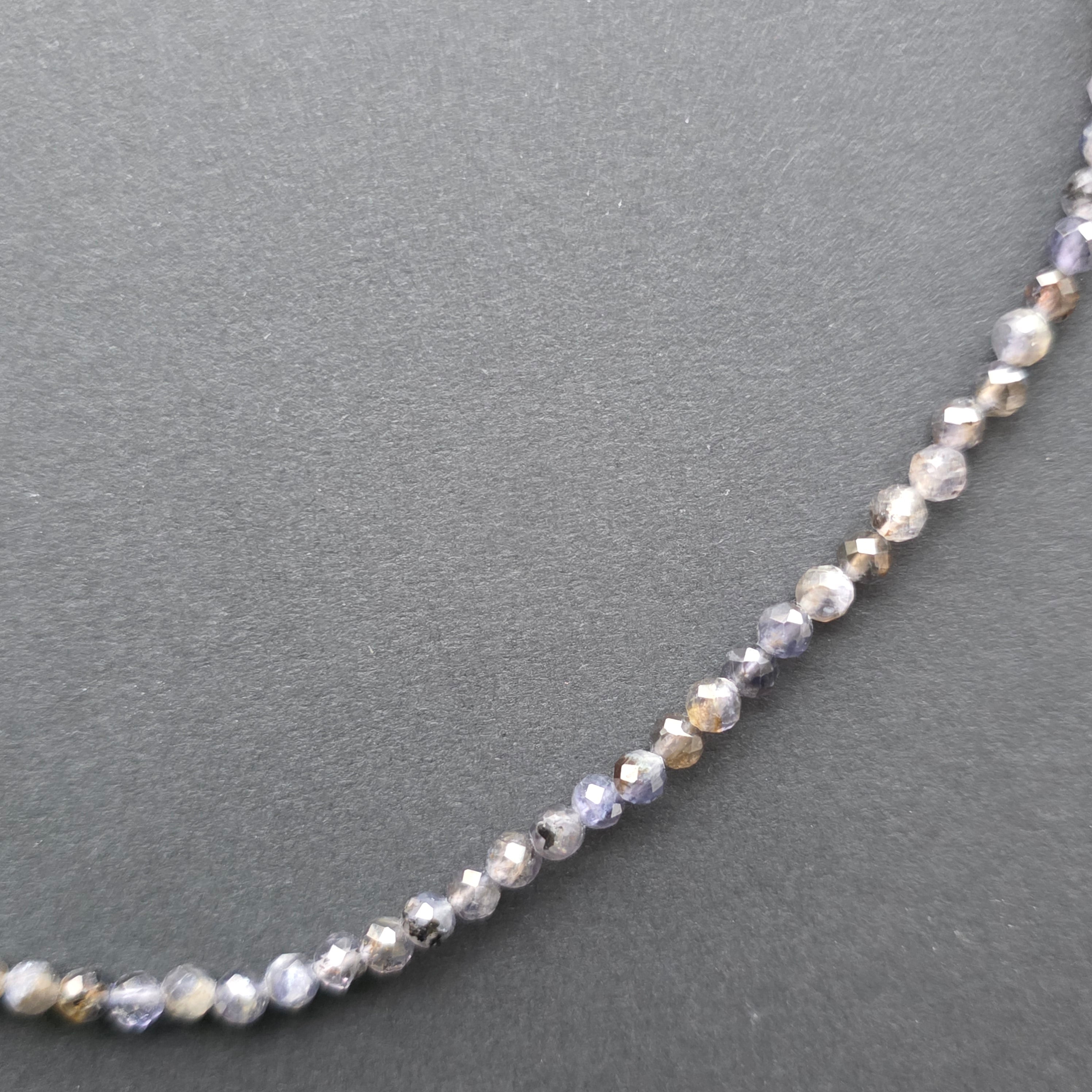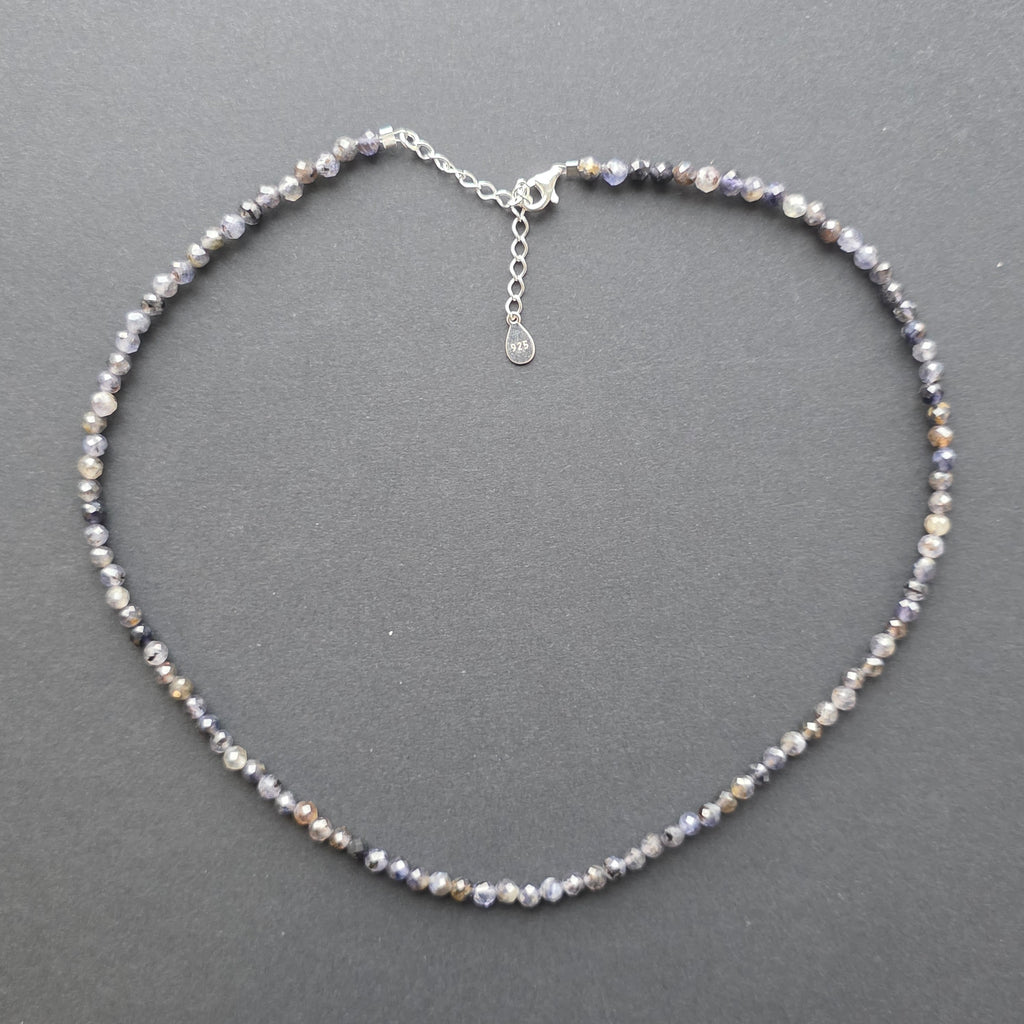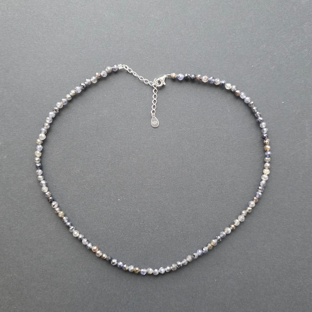 Un colier care pare sculptat din lumina amurgului. Iolitul natural fațetat de 4 mm poartă tonuri delicate de violet și albastru, asemenea unui cer de seară care își pierde treptat strălucirea în ocean. Fațetele fine surprind fiecare rază de lumină, creând o strălucire discretă, elegantă și profundă.