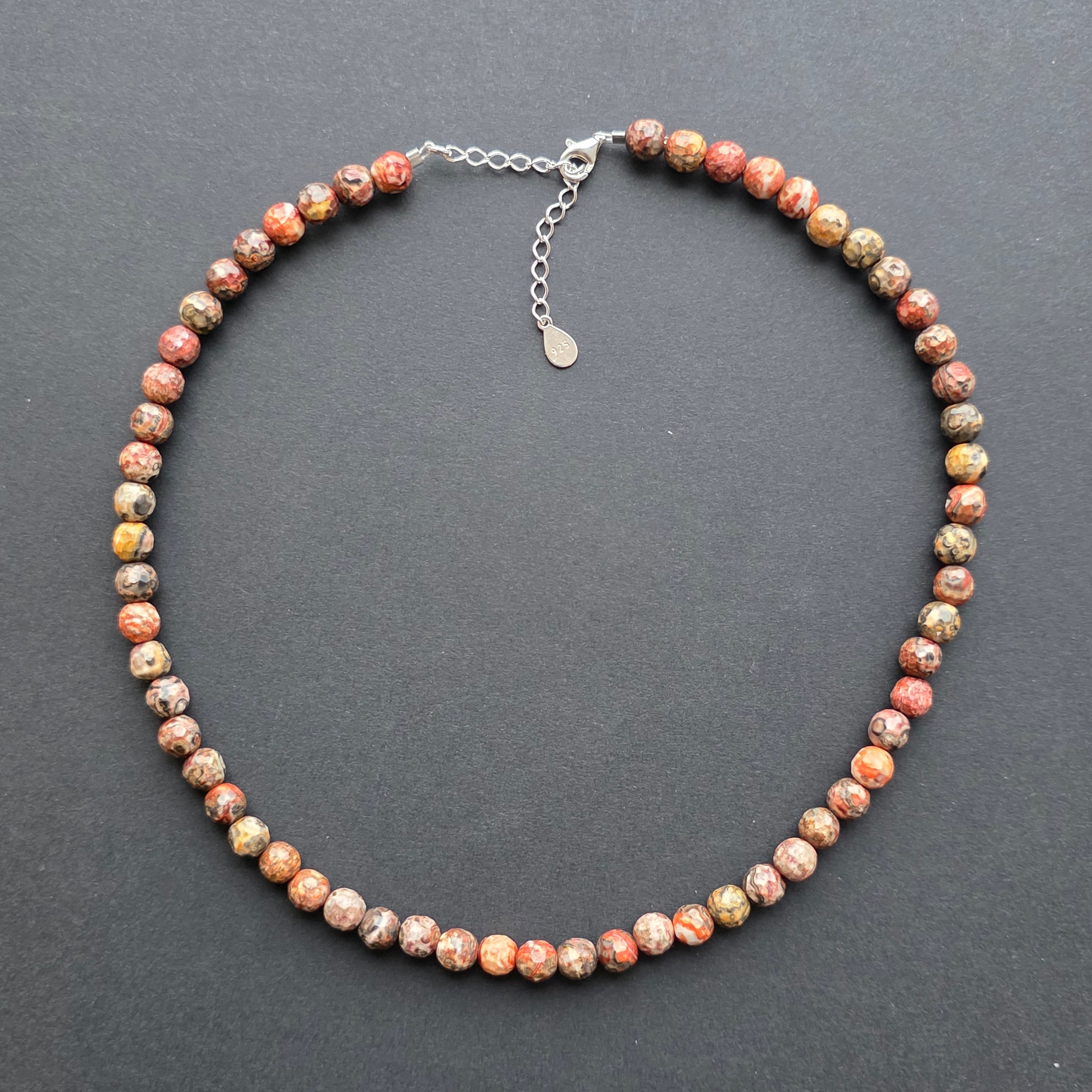 Un colier ce emană forța blândă a pământului și noblețea discretă a naturii sălbatice. Jaspul leopard natural fațetat de 6 mm captivează prin combinația de culori pământii și formele organice care par pictate de timp. Fațetele sale fine reflectă lumina cu subtilitate, oferind bijuteriei o eleganță caldă și autentică, perfectă pentru cei care iubesc frumusețea naturală.