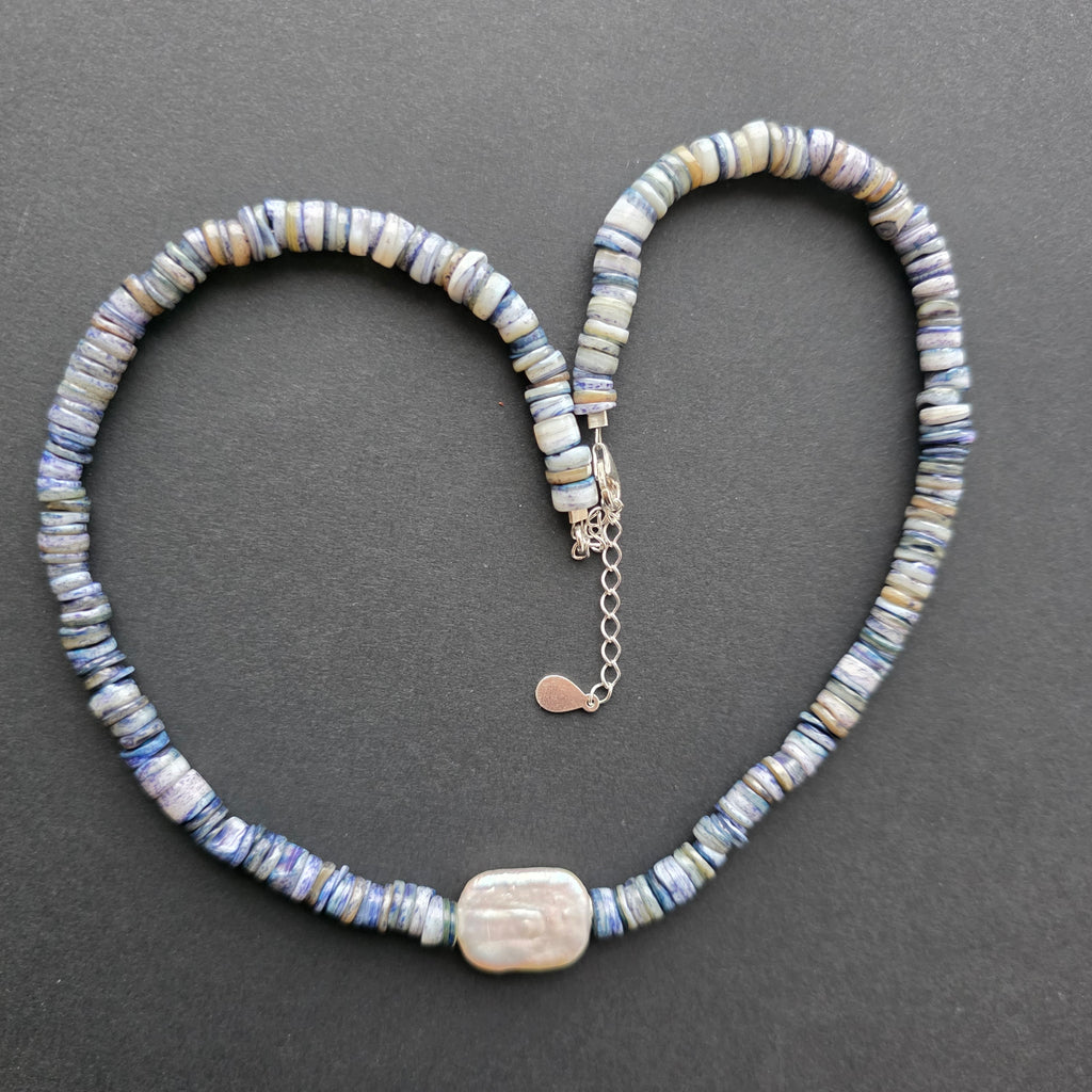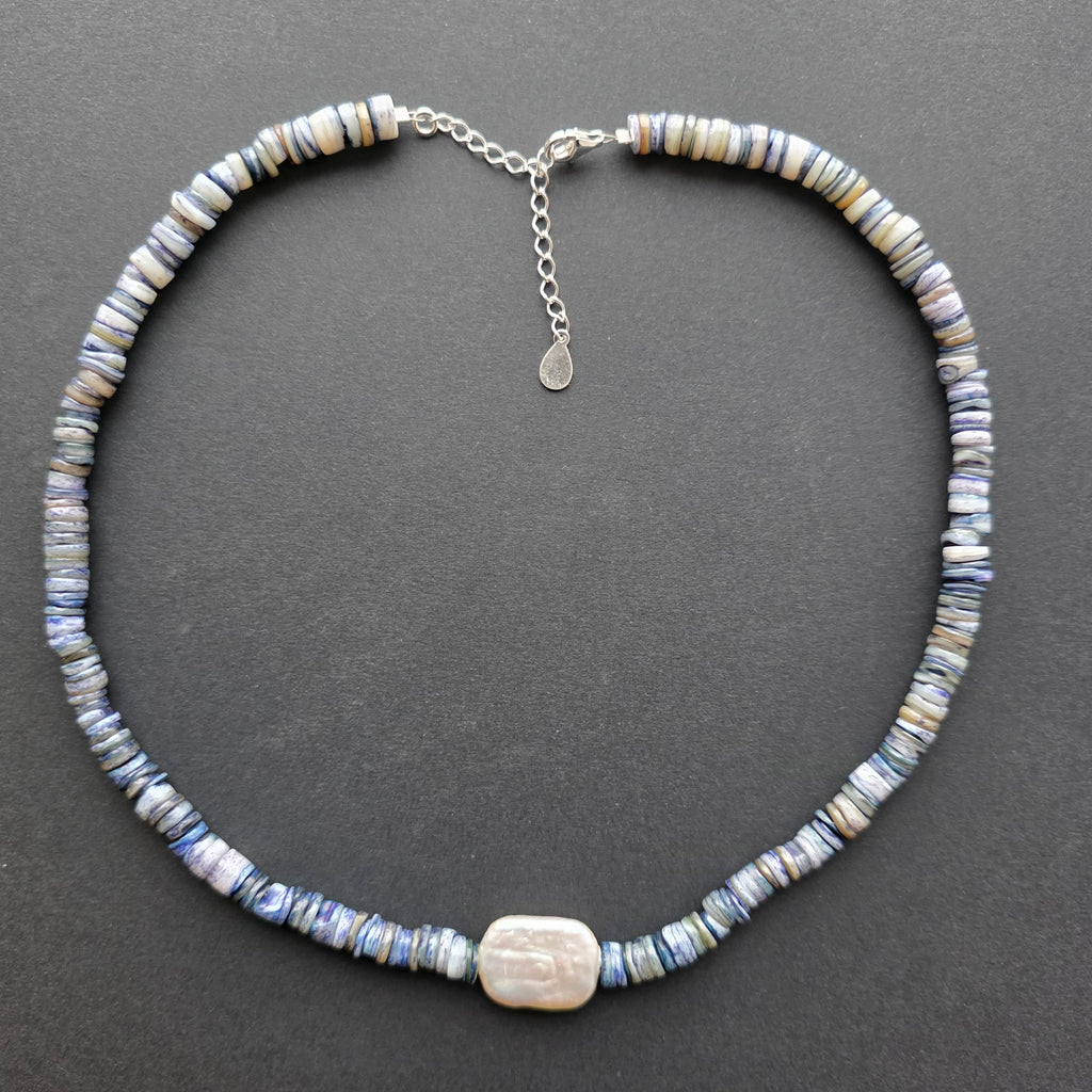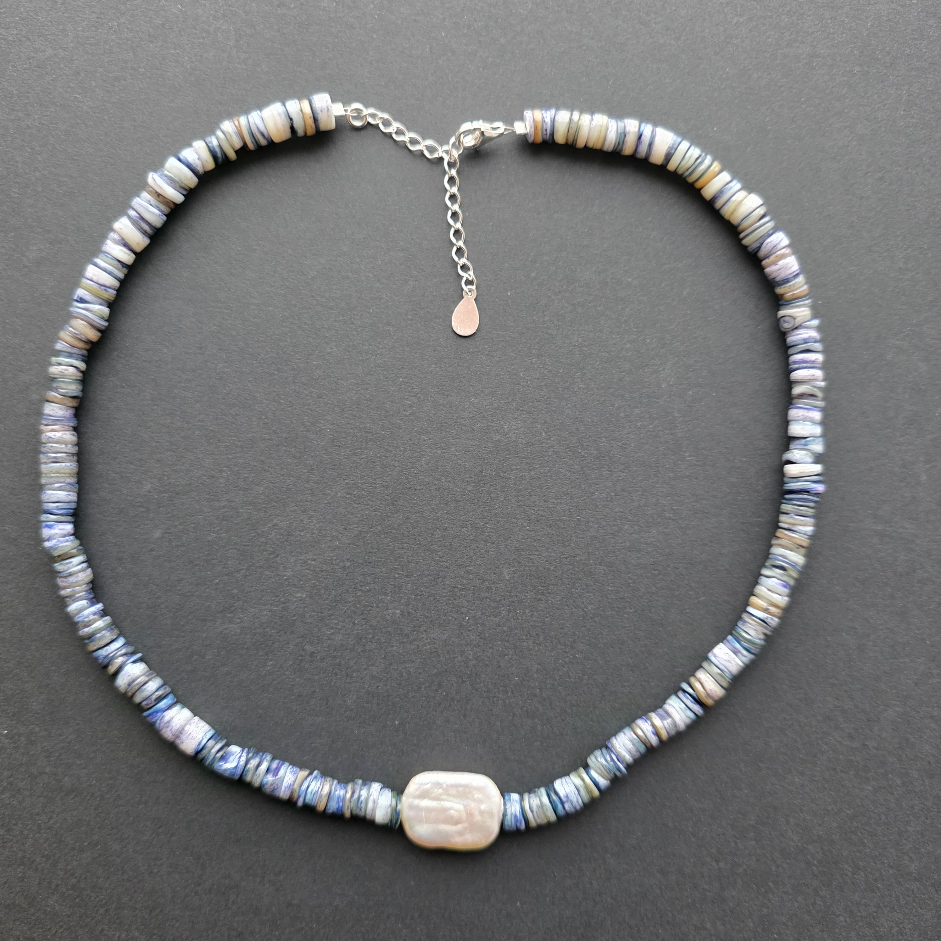 Materiale: lapis lazuli natural discuri 6 mm, perlă naturală dreptunghiulară 2 cm, argint 925