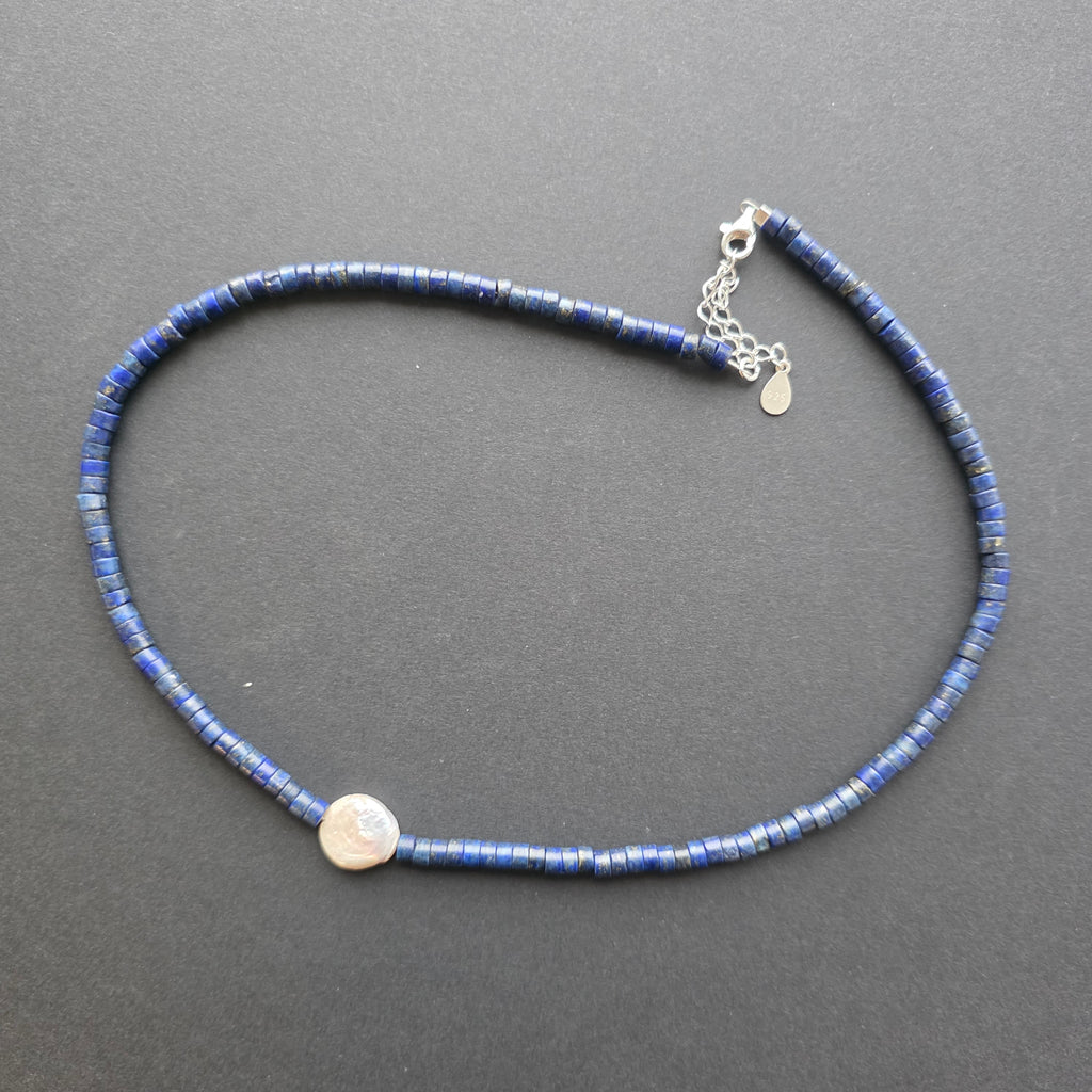 Un colier ce aduce împreună cerul și marea, într-un echilibru perfect între profunzime și puritate. Lapis lazuli-ul natural, tăiat în discuri de 4 mm, strălucește într-un albastru intens presărat cu reflexe aurii de pirită, evocând noaptea senină a Orientului antic. În centrul compoziției, o perlă naturală de 1 cm adaugă un accent de lumină calmă, ca o spumă albă peste valurile albastre.