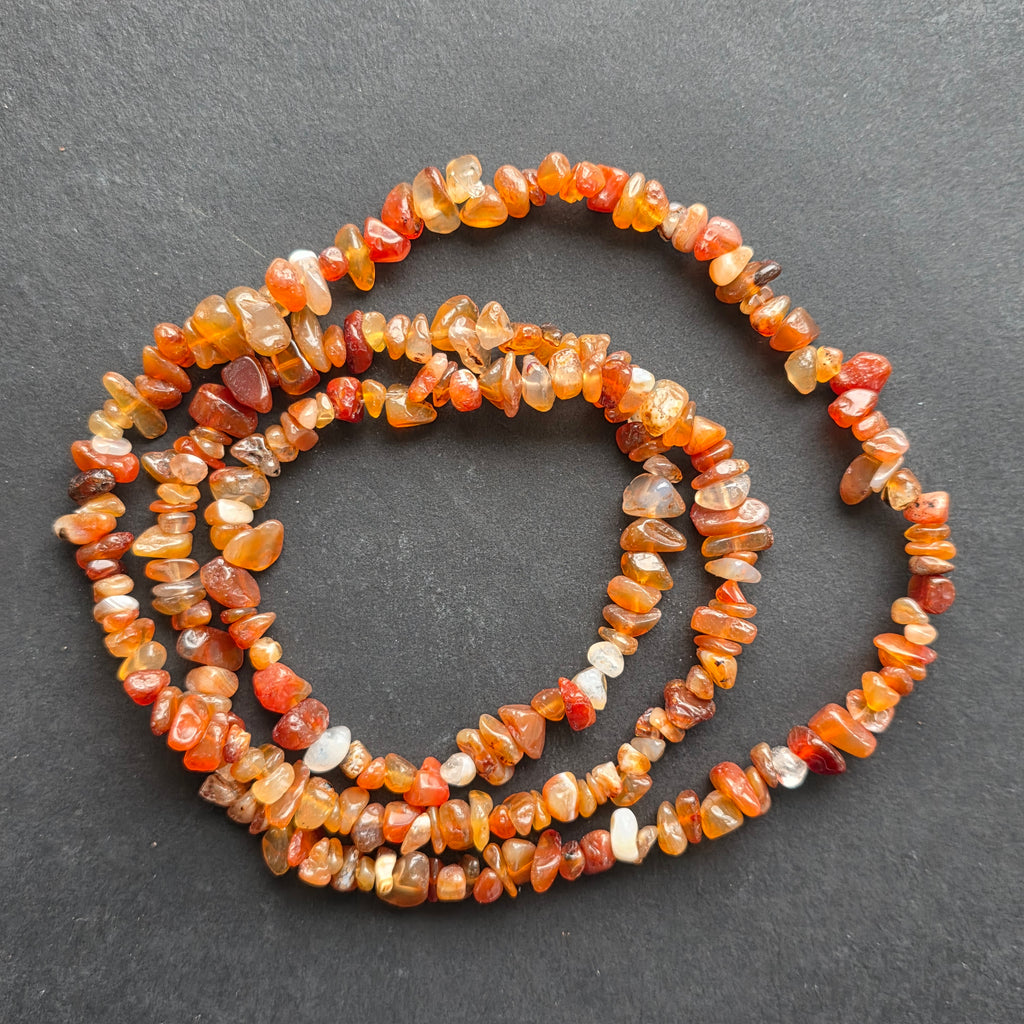 Un colier care poartă amintirea focului interior. Chipsurile naturale de carneol, șlefuite delicat și înșirate într-un șir continuu de 80 cm, se așază ușor în jurul gâtului, emanând căldura pământului roșiatic din care provin. Fiecare fragment poartă o nuanță unică — de la portocaliu intens la roșu cărămiziu translucid — creând o vibrație vie, solară, ce trezește pofta de viață și curajul de a acționa.
