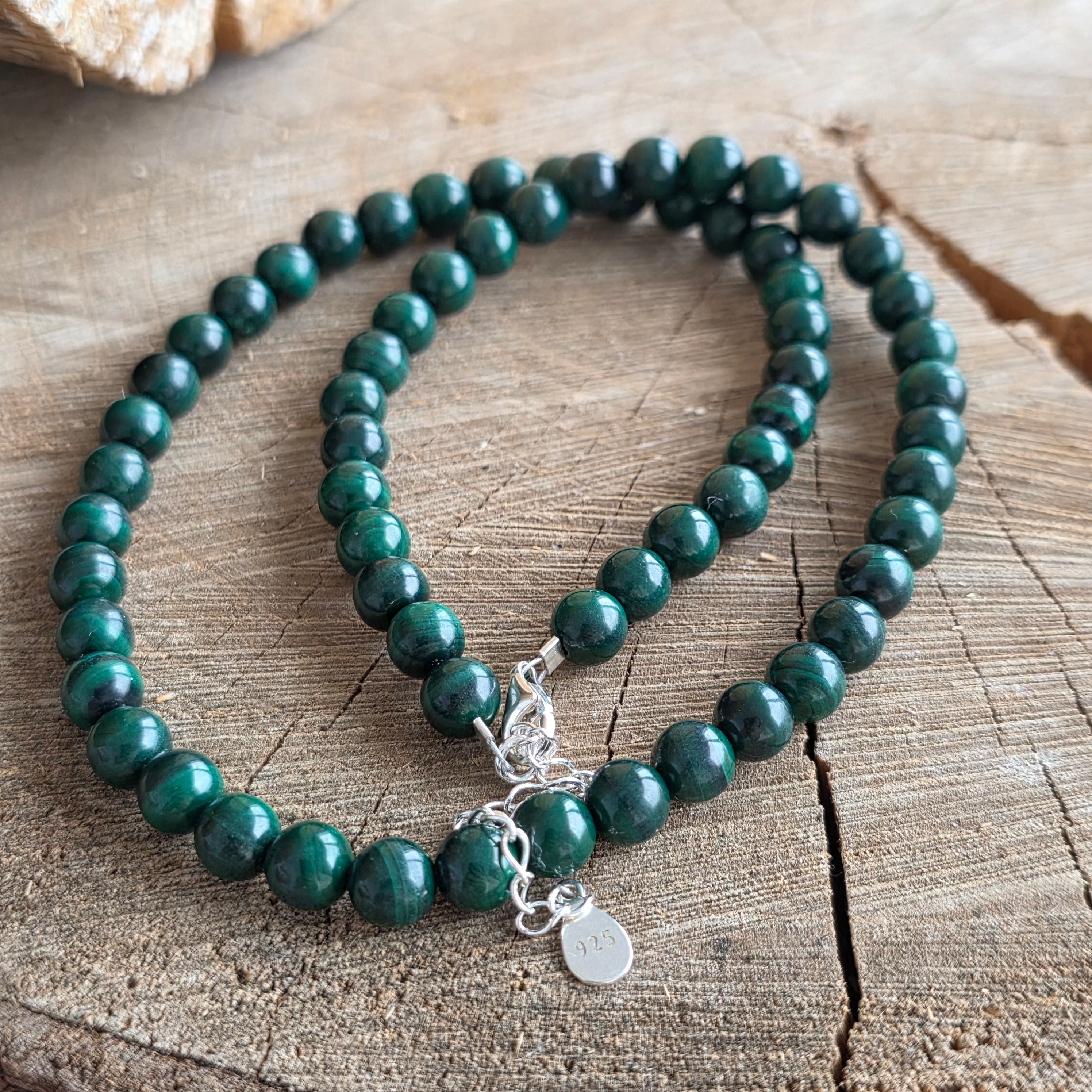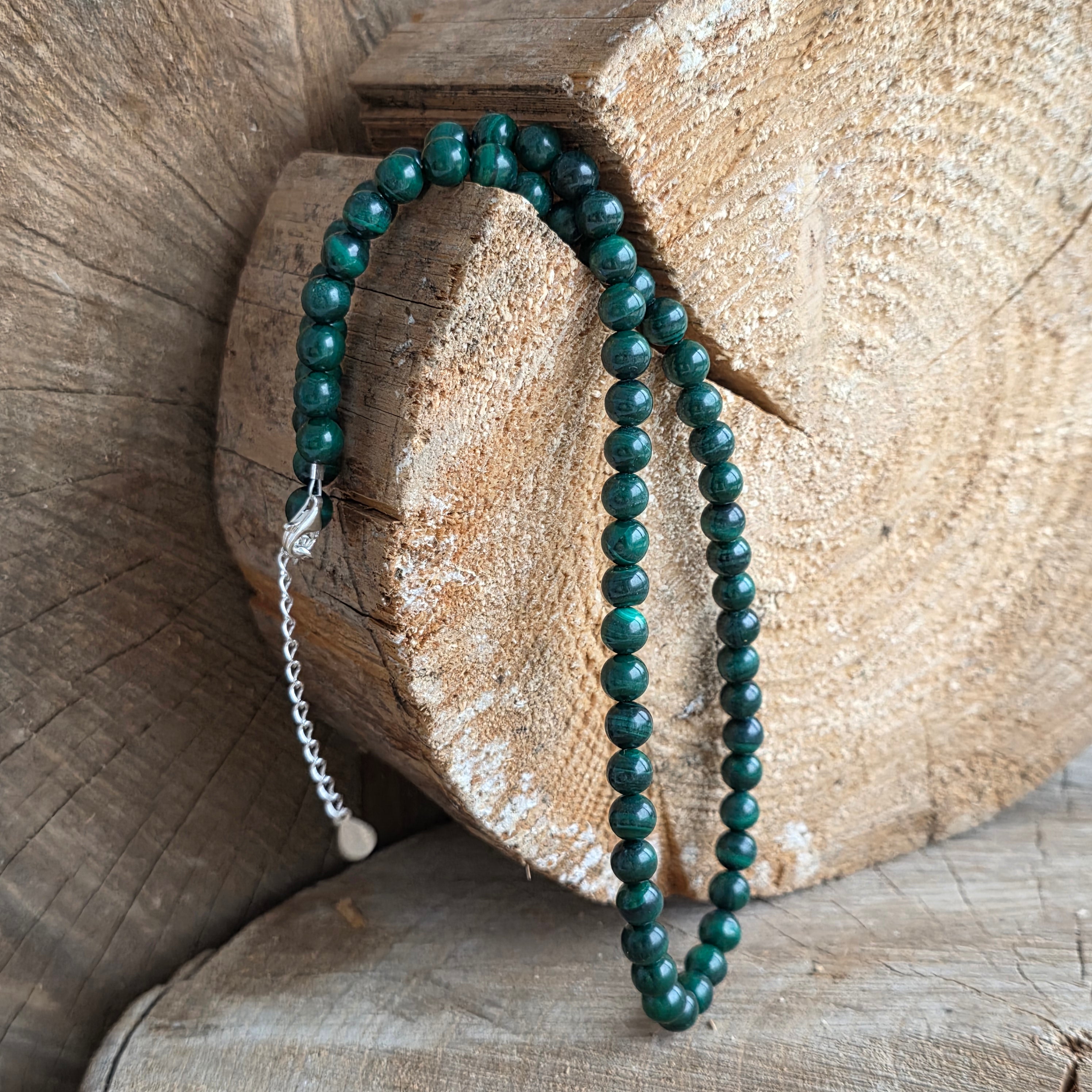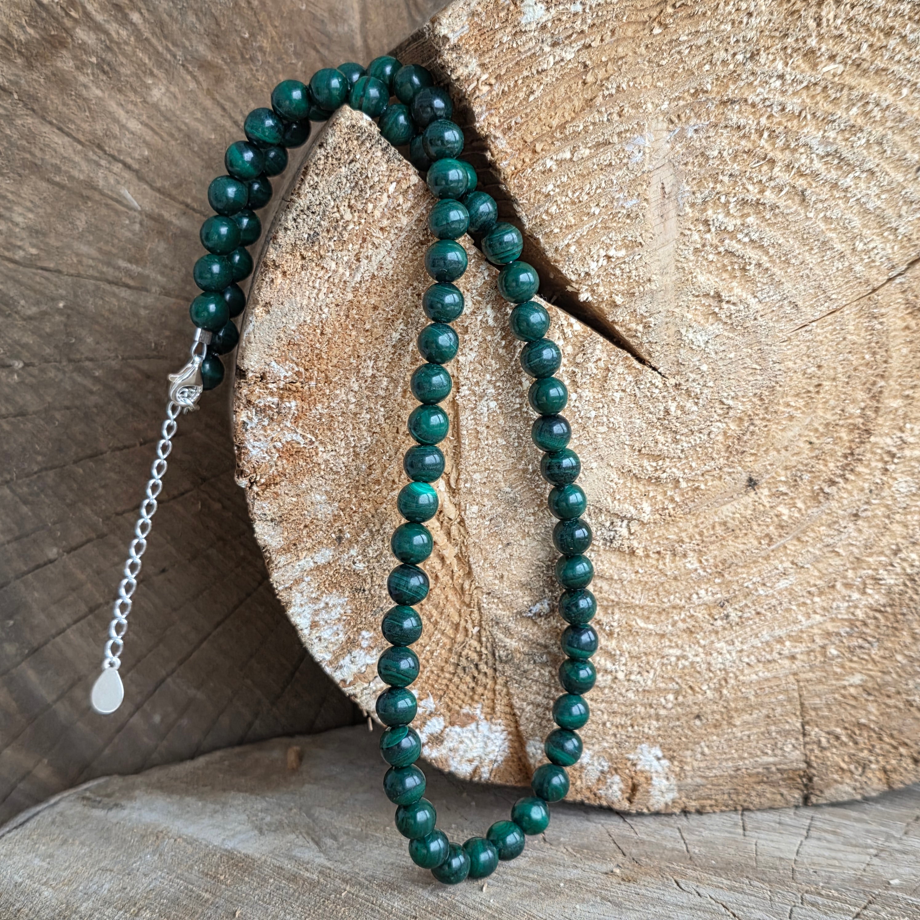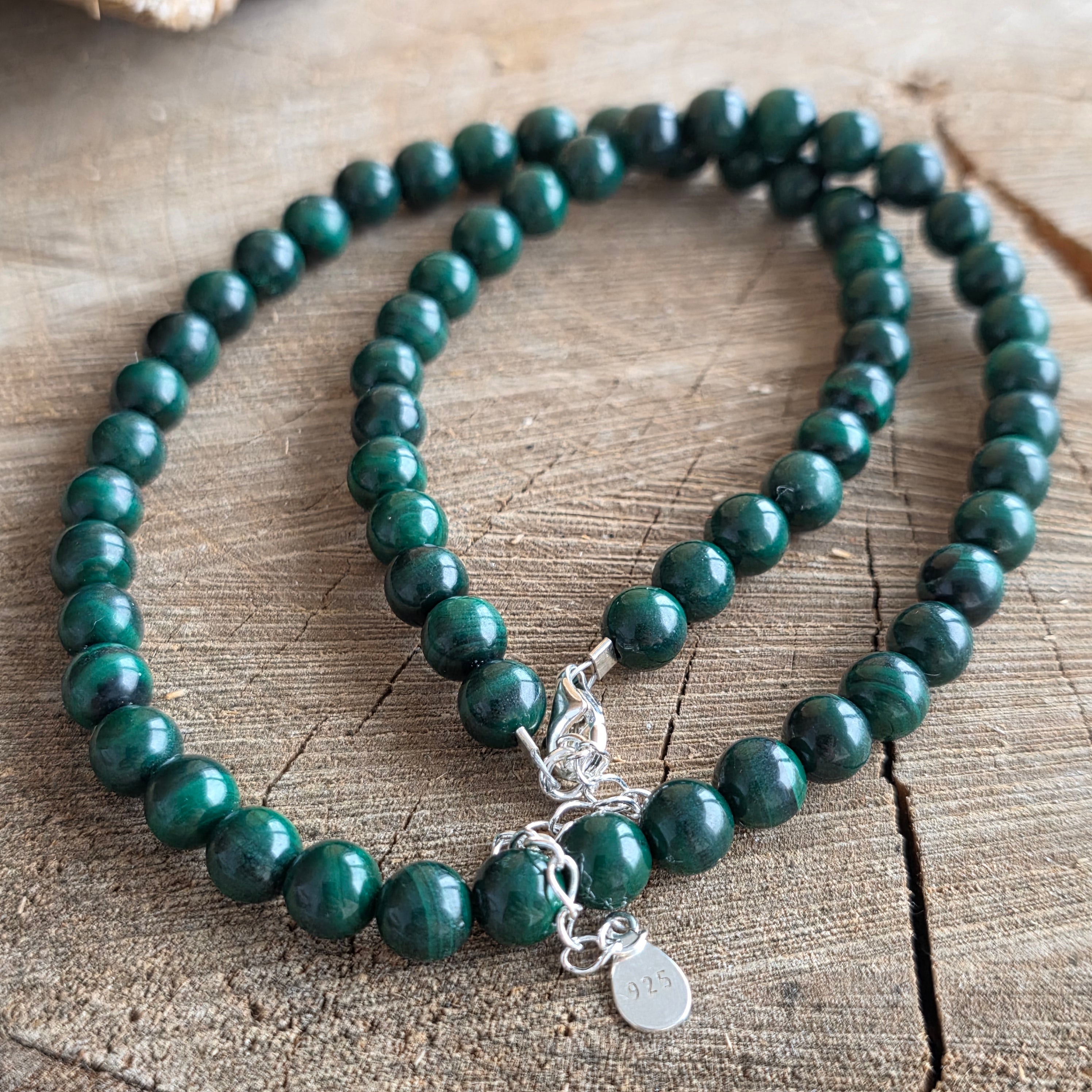 Un colier care poartă cântecul adânc al pământului, un ecou al forței și al regenerării. Malachitul, cu nuanțele sale de verde intens și dungi fluide, este o piatră vie — expresie a transformării, protecției și renașterii interioare. Fiecare mărgea de 6 mm este o lume în sine, un dans între lumina smaraldului și umbra pădurii.