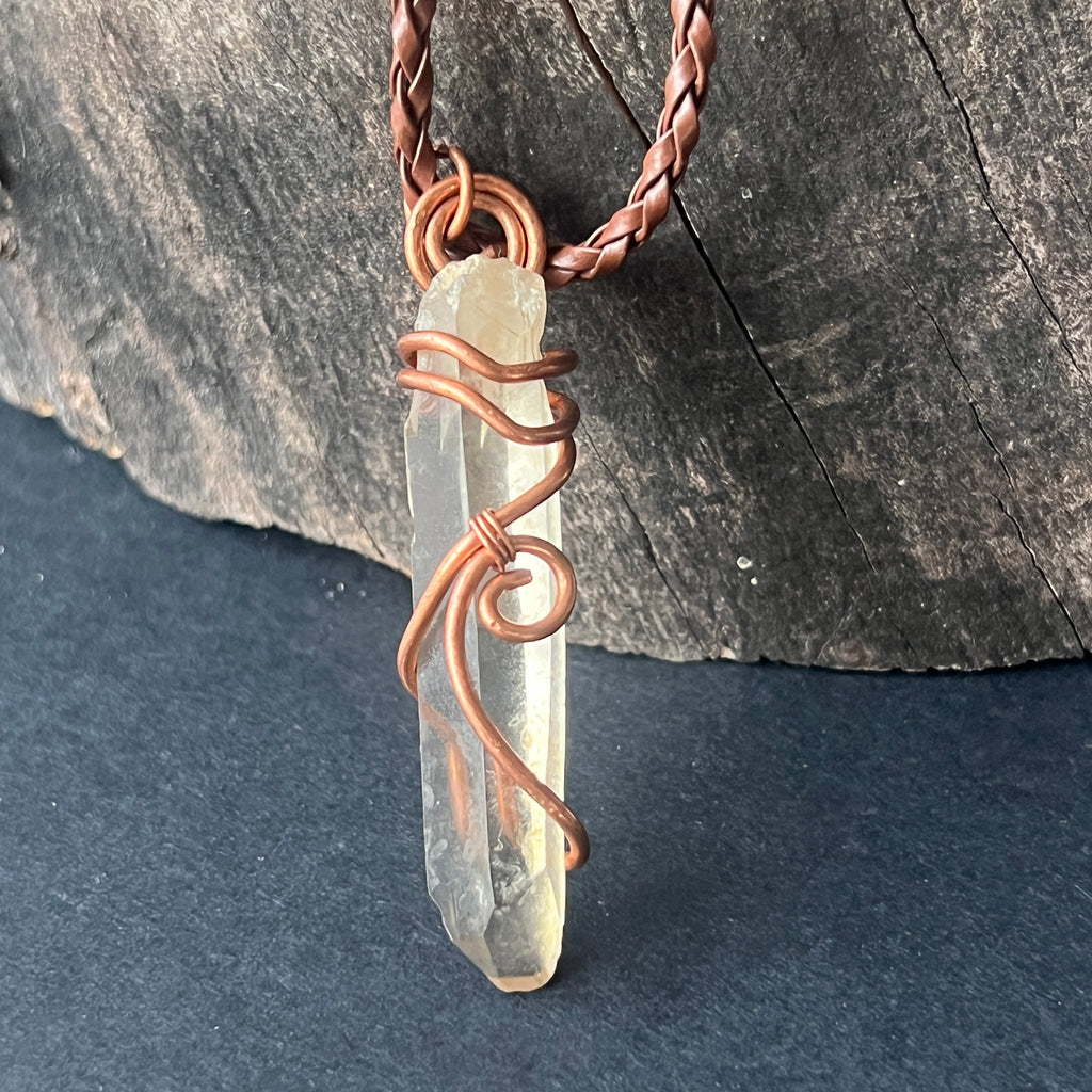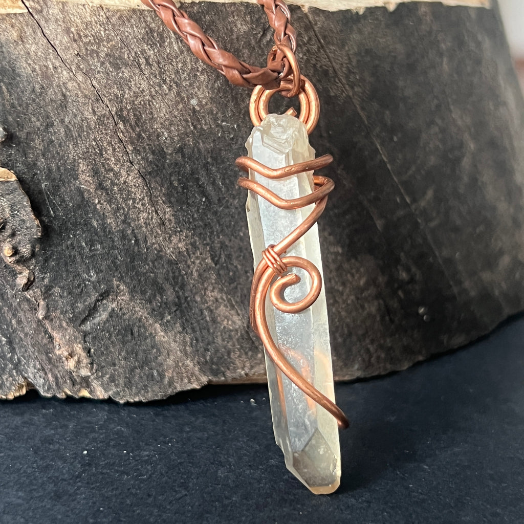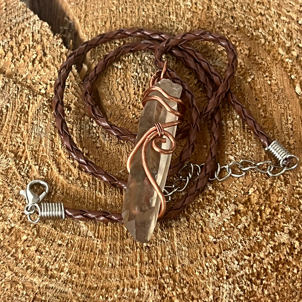 Acest colier unicat aduce la viață magia Africii printr-un pandantiv de cuart fumuriu natural, provenit din Zimbabwe. Piatra, prinsă într-o montură artistică din cupru răsucit manual, își dezvăluie nuanțele profunde, de la gri translucid până la brun cald, care par să surprindă esența fumului ce se ridică ușor din focul purificator.