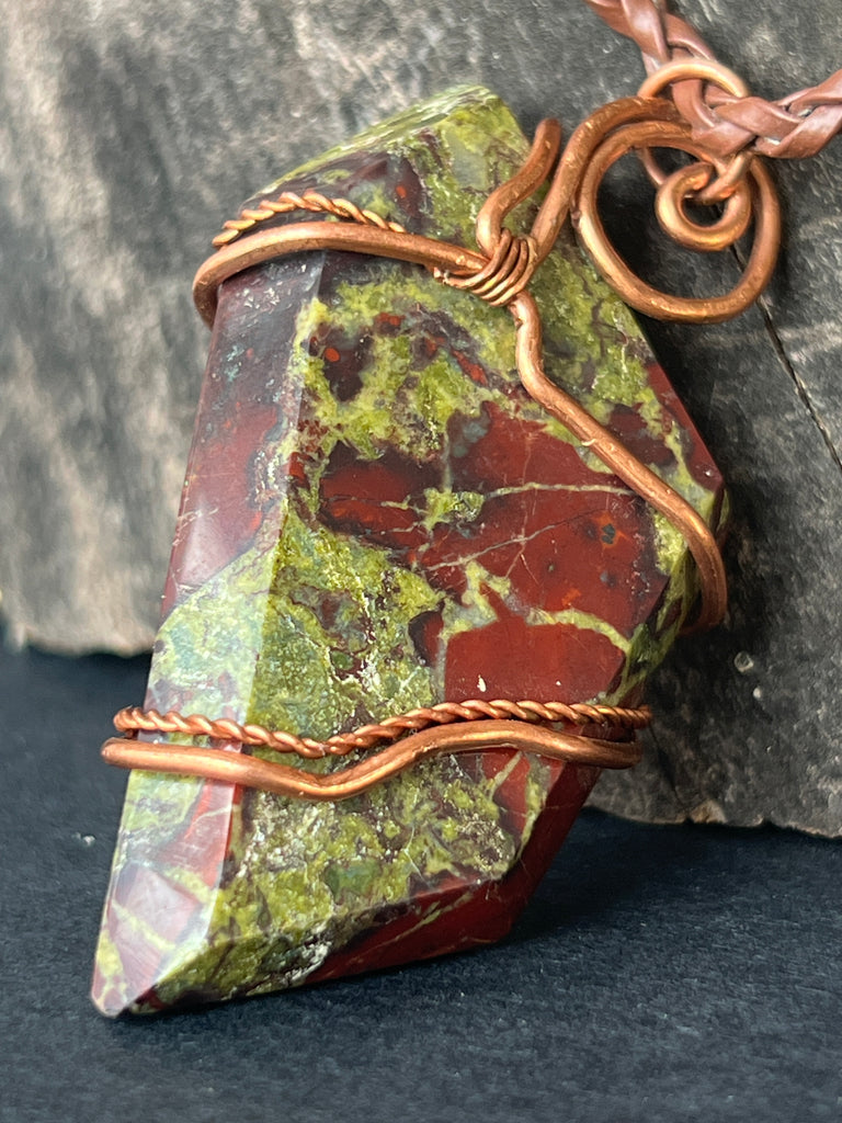 Acest colier unicat îmbină forța cu frumusețea brută a Africii printr-un pandantiv spectaculos din Sângele Dragonului, o piatră rară și fascinantă din Africa de Sud. Piatra polisată, prinsă într-o montură de cupru artistic răsucit manual, dezvăluie contraste puternice de verde pământiu și roșu intens, asemenea unei legende sculptate în mineral.