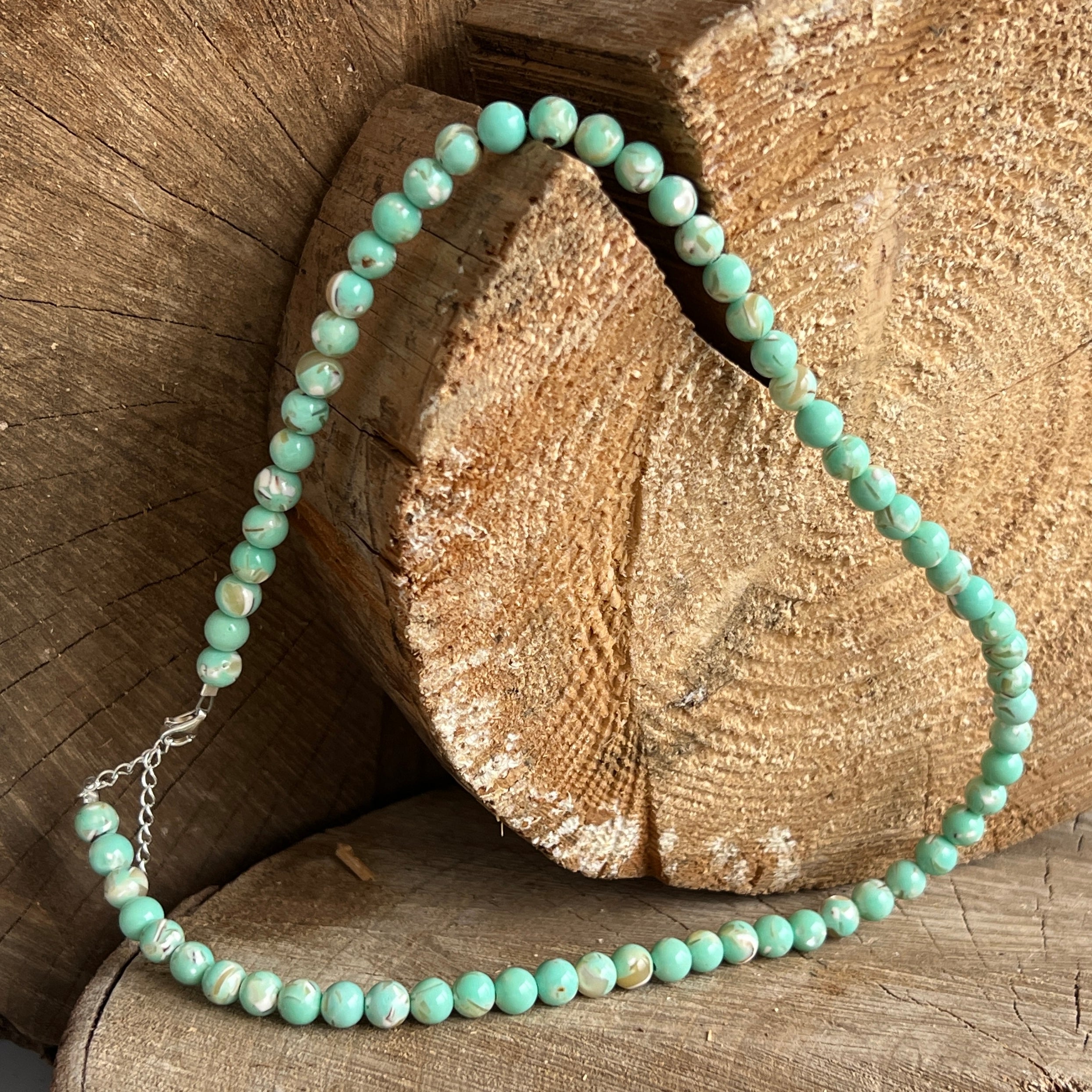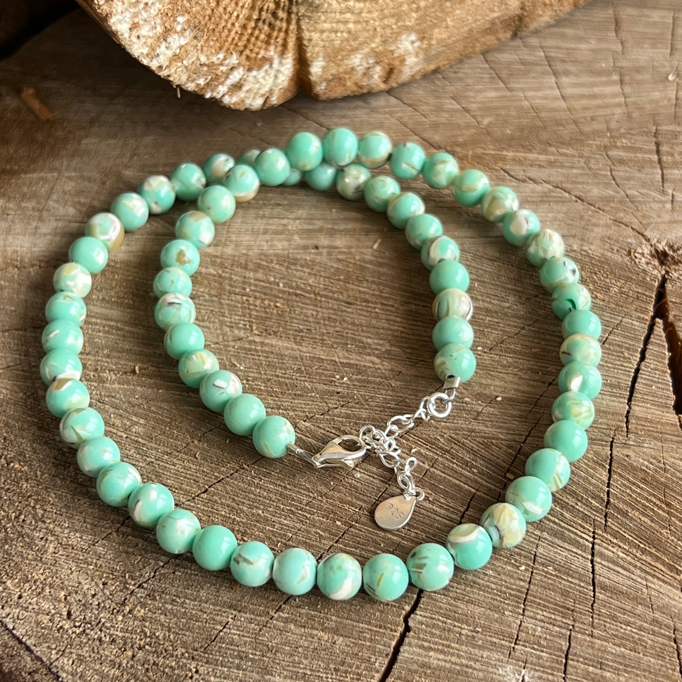 Un colier delicat și armonios, realizat din sfere de sidef de 6 mm. Suprafața netedă și nuanțele calde, perlate, creează o prezență calmă și elegantă, ușor de integrat atât în ținute zilnice, cât și în combinații mai rafinate.