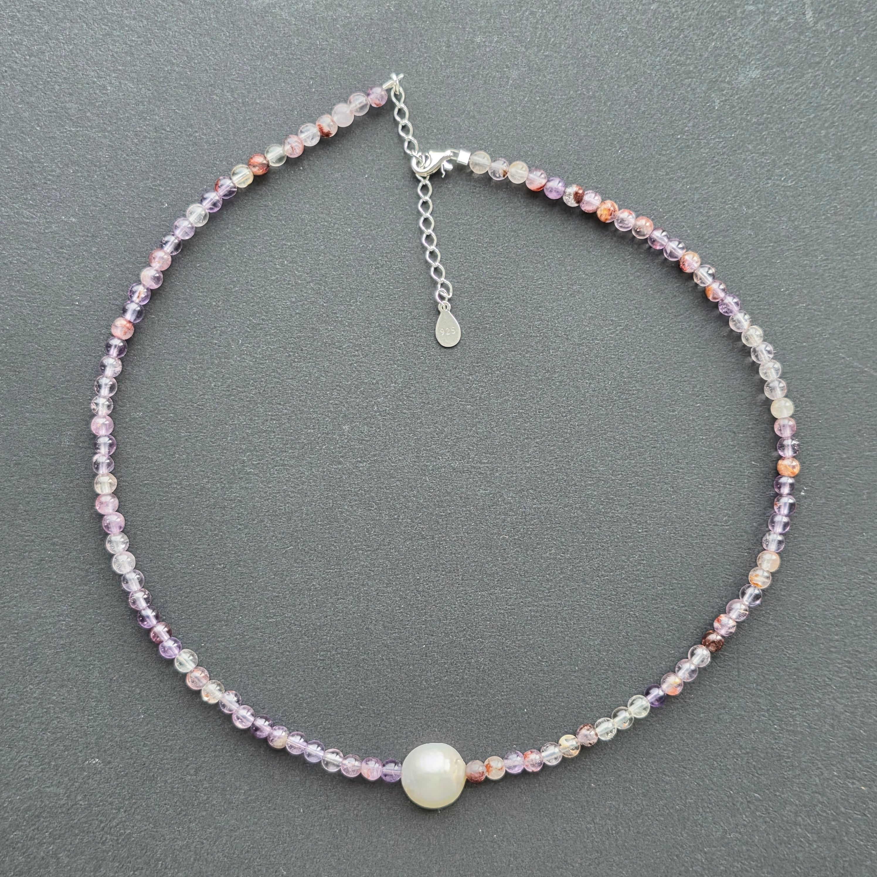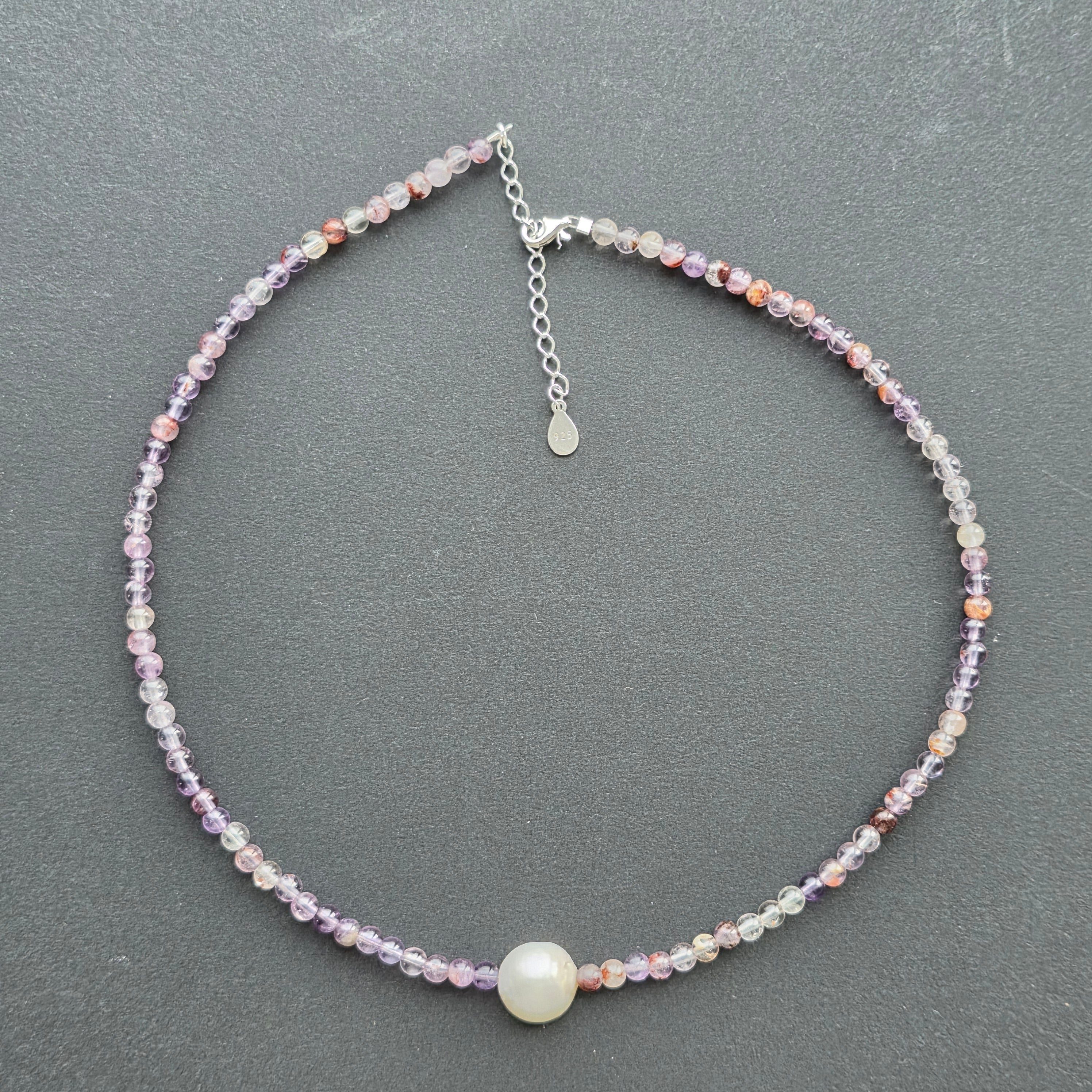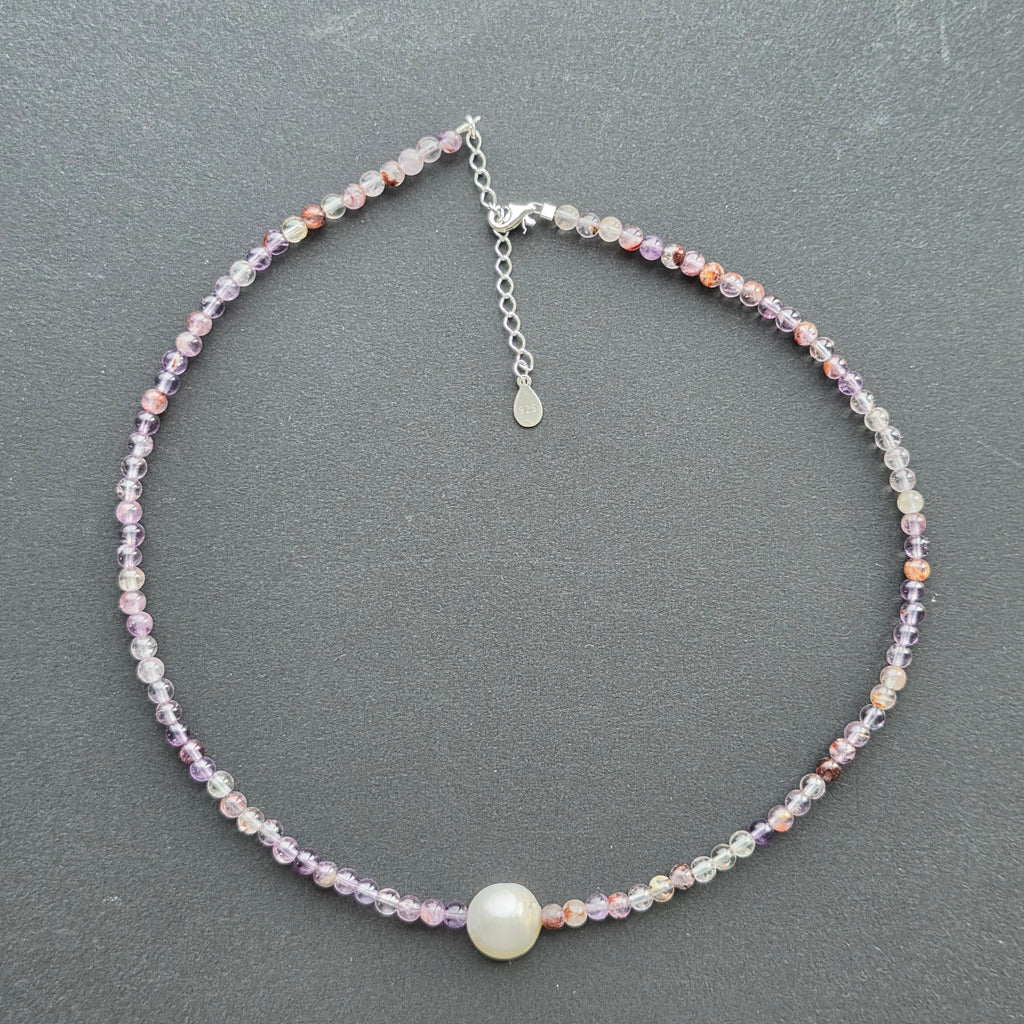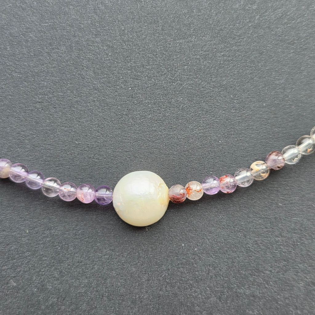 Materiale: Super Seven natural, sfere 4 mm, perla accent 1 cm, argint 925