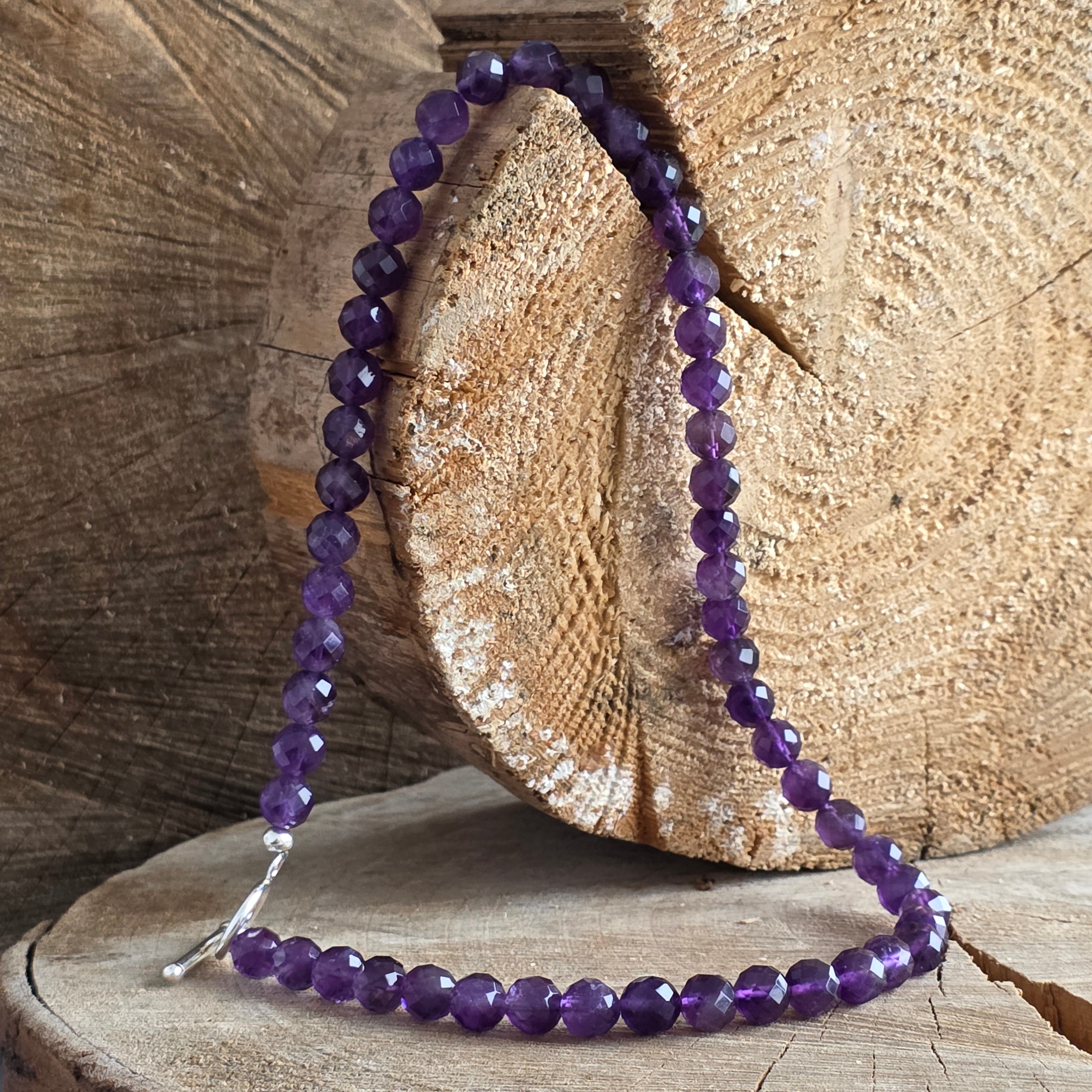 Ametyst jest tzw kamień mądrości i spokoju, przynosząc jasność umysłu i spokój ducha. Jest wsparciem w medytacji, odpoczynku i równowadze emocjonalnej, uznawany za niezawodnego sprzymierzeńca w wewnętrznych przemianach. Zapięcie typu toggle ze srebra 925 uzupełnia design o elegancki i praktyczny akcent, dodając charakterystycznej, klasycznej nuty.
